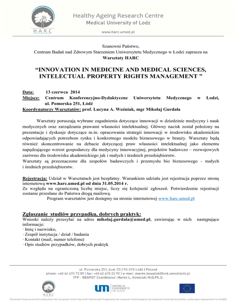 Szanowni Państwo, Centrum Badań nad Zdrowym Starzeniem Uniwersytetu Medycznego w Łodzi zaprasza na Warsztaty HARC “INNOVATION IN MEDICINE AND MEDICAL SCIENCES, INTELECTUAL PROPERTY RIGHTS MANAGEMENT ” Data: Miejsce: 13 czerwca 2014 Centrum Konferencyjno-Dydaktyczne Uniwersytetu Medycznego ul. Pomorska 251, Łódź Koordynatorzy Warsztatów: prof. Lucyna A. Woźniak, mgr Mikołaj Gurdała w Łodzi, Warsztaty poruszają wybrane zagadnienia dotyczące innowacji w dziedzinie medycyny i nauk medycznych oraz zarządzania prawami własności intelektualnej. Główny nacisk został położony na prezentacje i dyskusje dotyczące m.in. opracowania strategii innowacji w środowisku akademickim odpowiadających potrzebom rynku i konkretnego modelu biznesowego w branży. Warsztaty będą również skoncentrowanie na debacie dotyczącej praw własności intelektualnej jako elementu napędzającego wzrost gospodarczy dla medycyny innowacyjnej, projektów badawczo – rozwojowych zarówno dla środowiska akademickiego jak i małych i średnich przedsiębiorstw. Warsztaty są przeznaczone dla zespołów badawczych i przemysłu bio biznesowego - małych i średnich przedsiębiorstw. Rejestracja: Udział w Warsztatach jest bezpłatny. Warunkiem udziału jest rejestracja poprzez stronę internetową www.harc.umed.pl od dnia 31.05.2014 r. Ze względu na ograniczoną liczbę miejsc, liczy się kolejność zgłoszeń. Potwierdzenie rejestracji zostanie przesłane do Państwa drogą mailową. Program warsztatów jest dostępny na stronie internetowej www.harc.umed.pl Zgłaszanie studiów przypadku, dobrych praktyk: Wnioski należy przesyłać na adres [email protected], zawierając w nich informacje: · Imię i nazwisko, · Zespół instytucja / dział / badania · Kontakt (mail, numer telefonu) · Opis studiów przypadków, dobrych praktyk następujące