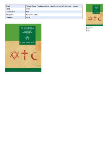 Tytuł W imię Boga. Fundamentalizm w judaizmie, chrześcijaństwie i islamie KTM 7405 Liczba stron 616 Kategoria Literatura faktu Cena det. 49.90 KTM: 7405 ISBN: EAN: