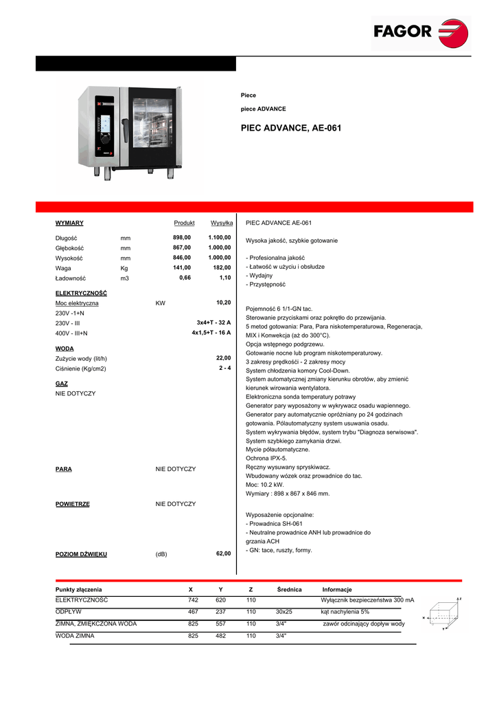 Piece piece ADVANCE PIEC ADVANCE, AE-061 Produkt WYMIARY Wysyłka Długość mm 898,00 1.100,00 Głębokość mm 867,00 1.000,00 Wysokość mm 846,00 1.000,00 Waga Kg 141,00 182,00 Ładowność m3 0,66 1,10 PIEC ADVANCE AE-061 Wysoka jakość, szybkie gotowanie - Profesionalna jakość - Łatwość w użyciu i obsłudze - Wydajny - Przystępność ELEKTRYCZNOŚĆ Moc elektryczna 10,20 KW 230V -1+N 3x4+T - 32 A 230V - III 4x1,5+T - 16 A 400V - III+N WODA Zużycie wody (lit/h) 22,00 Ciśnienie (Kg/cm2) 2-4 GAZ NIE DOTYCZY PARA NIE DOTYCZY POWIETRZE NIE DOTYCZY POZIOM DŹWIĘKU 62,00 (dB) Pojemność 6 1/1-GN tac. Sterowanie przyciskami oraz pokrętło do przewijania. 5 metod gotowania: Para, Para niskotemperaturowa, Regeneracja, MIX i Konwekcja (aż do 300°C). Opcja wstępnego podgrzewu. Gotowanie nocne lub program niskotemperaturowy. 3 zakresy prędkośći - 2 zakresy mocy System chłodzenia komory Cool-Down. System automatycznej zmiany kierunku obrotów, aby zmienić kierunek wirowania wentylatora. Elektroniczna sonda temperatury potrawy Generator pary wyposażony w wykrywacz osadu wapiennego. Generator pary automatycznie opróżniany po 24 godzinach gotowania. Pólautomatyczny system usuwania osadu. System wykrywania błędów, system trybu "Diagnoza serwisowa". System szybkiego zamykania drzwi. Mycie półautomatyczne. Ochrona IPX-5. Ręczny wysuwany spryskiwacz. Wbudowany wózek oraz prowadnice do tac. Moc: 10.2 kW. Wymiary : 898 x 867 x 846 mm. Wyposażenie opcjonalne: - Prowadnica SH-061 - Neutralne prowadnice ANH lub prowadnice do grzania ACH - GN: tace, ruszty, formy. Punkty złączenia X Y Z ELEKTRYCZNOŚĆ 742 620 110 Średnica ODPŁYW 467 237 110 30x25 ZIMNA, ZMIĘKCZONA WODA 825 557 110 3/4" WODA ZIMNA 825 482 110 3/4" Informacje Wyłącznik bezpieczeństwa 300 mA kąt nachylenia 5% zawór odcinający dopływ wody