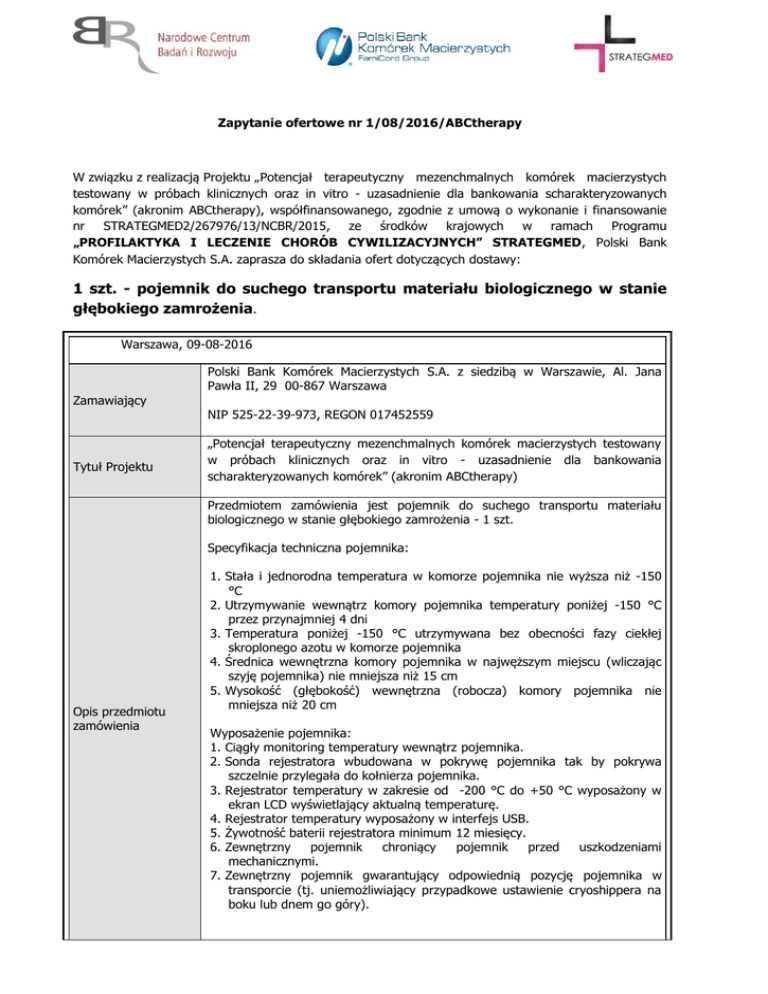 Zapytanie ofertowe nr 1/08/2016/ABCtherapy W związku z realizacją Projektu „Potencjał terapeutyczny mezenchmalnych komórek macierzystych testowany w próbach klinicznych oraz in vitro - uzasadnienie dla bankowania scharakteryzowanych komórek” (akronim ABCtherapy), współfinansowanego, zgodnie z umową o wykonanie i finansowanie nr STRATEGMED2/267976/13/NCBR/2015, ze środków krajowych w ramach Programu „PROFILAKTYKA I LECZENIE CHORÓB CYWILIZACYJNYCH” STRATEGMED, Polski Bank Komórek Macierzystych S.A. zaprasza do składania ofert dotyczących dostawy: 1 szt. - pojemnik do suchego transportu materiału biologicznego w stanie głębokiego zamrożenia. Warszawa, 09-08-2016 Polski Bank Komórek Macierzystych S.A. z siedzibą w Warszawie, Al. Jana Pawła II, 29 00-867 Warszawa Zamawiający Tytuł Projektu NIP 525-22-39-973, REGON 017452559 „Potencjał terapeutyczny mezenchmalnych komórek macierzystych testowany w próbach klinicznych oraz in vitro - uzasadnienie dla bankowania scharakteryzowanych komórek” (akronim ABCtherapy) Przedmiotem zamówienia jest pojemnik do suchego transportu materiału biologicznego w stanie głębokiego zamrożenia - 1 szt. Specyfikacja techniczna pojemnika: Opis przedmiotu zamówienia 1. Stała i jednorodna temperatura w komorze pojemnika nie wyższa niż -150 °C 2. Utrzymywanie wewnątrz komory pojemnika temperatury poniżej -150 °C przez przynajmniej 4 dni 3. Temperatura poniżej -150 °C utrzymywana bez obecności fazy ciekłej skroplonego azotu w komorze pojemnika 4. Średnica wewnętrzna komory pojemnika w najwęższym miejscu (wliczając szyję pojemnika) nie mniejsza niż 15 cm 5. Wysokość (głębokość) wewnętrzna (robocza) komory pojemnika nie mniejsza niż 20 cm Wyposażenie pojemnika: 1. Ciągły monitoring temperatury wewnątrz pojemnika. 2. Sonda rejestratora wbudowana w pokrywę pojemnika tak by pokrywa szczelnie przylegała do kołnierza pojemnika. 3. Rejestrator temperatury w zakresie od -200 °C do +50 °C wyposażony w ekran LCD wyświetlający aktualną temperaturę. 4. Rejestrator temperatury wyposażony w interfejs USB. 5. Żywotność baterii rejestratora minimum 12 miesięcy. 6. Zewnętrzny pojemnik chroniący pojemnik przed uszkodzeniami mechanicznymi. 7. Zewnętrzny pojemnik gwarantujący odpowiednią pozycję pojemnika w transporcie (tj. uniemożliwiający przypadkowe ustawienie cryoshippera na boku lub dnem go góry). Dokumentacja: 1. Certyfikat zgodności z Dyrektywą 93/42/EEC. 2. Dokumentacja IQ, OQ, PQ lub równoważna 3. Gwarancja nie krótsza niż 24 miesiące Wykonawca zobowiązany będzie do przeprowadzenia w siedzibie Zamawiającego bezpłatnego szkolenia dla personelu Zamawiającego w zakresie obsługi dostarczanego urządzenia. Zamawiający oczekuje dostawy w terminie nie dłuższym niż 90 dni licząc od dnia podpisania umowy. Oferty wskazujące na termin dostawy wykraczający poza wskazany powyżej okres nie będą rozpatrywane. Termin realizacji zamówienia może ulec przedłużeniu w następujących przypadkach: Termin realizacji zamówienia a) w przypadku działania siły wyższej, uniemożliwiającej wykonanie umowy w terminie; b) w przypadku, gdy termin zakończenia realizacji zamówienia przez Wykonawcę jest niemożliwy z powodu okoliczności leżących po stronie Zamawiającego; c) w przypadku konieczności uzyskania dodatkowej dokumentacji niezbędnej do prawidłowej realizacji zamówienia, w tym niezbędnych decyzji, pozwoleń/zezwoleń. W przypadku wystąpienia którejkolwiek z ww. okoliczności termin wykonania przedmiotu zamówienia może ulec odpowiedniemu przedłużeniu: a) o okres niezbędny do usunięcia skutków/ustania działania siły wyższej; b) o czas niezbędny do zakończenia wykonywania przedmiotu zamówienia w sposób należyty, nie dłużej jednak niż okres trwania tych okoliczności; c) o okres niezbędny do uzyskania przedmiotowej dokumentacji. Miejsce dostawy zamówienia Warunki udziału w postępowaniu oraz wykaz oświadczeń i dokumentów jakie należy dostarczyć w celu potwierdzenia spełnienia warunków udziału w postępowaniu Sposób przygotowania oferty Polski Bank Komórek Macierzystych S.A. ul. Działowa 85 02-234 Warszawa O udzielenie zamówienia mogą ubiegać się podmioty: a)niepowiązane lub niebędące jednostką zależną, współzależną lub dominującą w relacji z Zamawiającym w rozumieniu ustawy z dnia 29 września 1994 r. o rachunkowości (t.j. Dz. U. z 2013 r. poz. 330, z późn. zm.); b)niebędące podmiotem pozostającym z Zamawiającym lub członkami jego organów w takim stosunku faktycznym lub prawnym, który może budzić uzasadnione wątpliwości co do bezstronności w wyborze dostawcy towaru lub usługi, w szczególności pozostające w związku małżeńskim, stosunku pokrewieństwa lub powinowactwa do drugiego stopnia włącznie, stosunku przysposobienia, opieki lub kurateli, także poprzez członkostwo w organach dostawcy towaru lub usługi; c)niebędące podmiotem powiązanym ani podmiotem partnerskim w stosunku do Zamawiającego w myśl Rozporządzenia Komisji (UE) nr 651/2014 z dnia 17 czerwca 2014 r. uznającego niektóre rodzaje pomocy za zgodne ze wspólnym rynkiem w zastosowaniu art. 107 i 108 Traktatu (Dz. Urz. UE L 187 z 26.06.2014); d)niebędące podmiotem powiązanym osobowo z Zamawiającym w rozumieniu art. 32 ust. 2 ustawy z dnia 11 marca 2004 r. o podatku od towarów i usług (Dz. U. z 2011 r., nr 177, poz. 1054 z późn. zm.). Celem potwierdzenia spełnienia określonych powyżej warunków oferent zobowiązany jest do dostarczenia wraz z ofertą oświadczenia, którego wzór stanowi załącznik nr 2 do niniejszego zapytania. 1. Oferta powinna być sporządzona zgodnie z postanowieniami niniejszego zapytania. 2. Nie dopuszcza się składania oferty częściowej ani warunkowej. 3. Każdy Wykonawca może złożyć tylko jedną ofertę. W przypadku, gdy Wykonawca przedłoży więcej niż jedną ofertę nie będzie rozpa