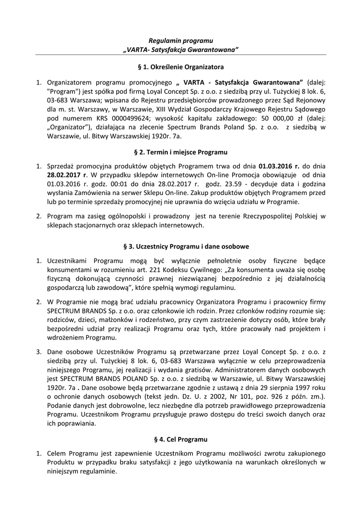 Regulamin programu „VARTA- Satysfakcja Gwarantowana” § 1. Określenie Organizatora 1. Organizatorem programu promocyjnego „ VARTA - Satysfakcja Gwarantowana” (dalej: "Program") jest spółka pod firmą Loyal Concept Sp. z o.o. z siedzibą przy ul. Tużyckiej 8 lok. 6, 03-683 Warszawa; wpisana do Rejestru przedsiębiorców prowadzonego przez Sąd Rejonowy dla m. st. Warszawy, w Warszawie, XIII Wydział Gospodarczy Krajowego Rejestru Sądowego pod numerem KRS 0000499624; wysokość kapitału zakładowego: 50 000,00 zł (dalej: „Organizator”), działająca na zlecenie Spectrum Brands Poland Sp. z o.o. z siedzibą w Warszawie, ul. Bitwy Warszawskiej 1920r. 7a. § 2. Termin i miejsce Programu 1. Sprzedaż promocyjna produktów objętych Programem trwa od dnia 01.03.2016 r. do dnia 28.02.2017 r. W przypadku sklepów internetowych On-line Promocja obowiązuje od dnia 01.03.2016 r. godz. 00:01 do dnia 28.02.2017 r. godz. 23.59 - decyduje data i godzina wysłania Zamówienia na serwer Sklepu On-line. Zakup produktów objętych Programem przed lub po terminie sprzedaży promocyjnej nie uprawnia do wzięcia udziału w Programie. 2. Program ma zasięg ogólnopolski i prowadzony jest na terenie Rzeczypospolitej Polskiej w sklepach stacjonarnych oraz sklepach internetowych. § 3. Uczestnicy Programu i dane osobowe 1. Uczestnikami Programu mogą być wyłącznie pełnoletnie osoby fizyczne będące konsumentami w rozumieniu art. 221 Kodeksu Cywilnego: „Za konsumenta uważa się osobę fizyczną dokonującą czynności prawnej niezwiązanej bezpośrednio z jej działalnością gospodarczą lub zawodową”, które spełnią wymogi regulaminu. 2. W Programie nie mogą brać udziału pracownicy Organizatora Programu i pracownicy firmy SPECTRUM BRANDS Sp. z o.o. oraz członkowie ich rodzin. Przez członków rodziny rozumie się: rodziców, dzieci, małżonków i rodzeństwo, przy czym zastrzeżenie dotyczy osób, które brały bezpośredni udział przy realizacji Programu oraz tych, które pracowały nad projektem i wdrożeniem Programu. 3. Dane osobowe Uczestników Programu są przetwarzane przez Loyal Concept Sp. z o.o. z siedzibą przy ul. Tużyckiej 8 lok. 6, 03-683 Warszawa wyłącznie w celu przeprowadzenia niniejszego Programu, jej realizacji i wydania gratisów. Administratorem danych osobowych jest SPECTRUM BRANDS POLAND Sp. z o.o. z siedzibą w Warszawie, ul. Bitwy Warszawskiej 1920r. 7a . Dane osobowe będą przetwarzane zgodnie z ustawą z dnia 29 sierpnia 1997 roku o ochronie danych osobowych (tekst jedn. Dz. U. z 2002, Nr 101, poz. 926 z późn. zm.). Podanie danych jest dobrowolne, lecz niezbędne dla potrzeb prawidłowego przeprowadzenia Programu. Uczestnikom Programu przysługuje prawo dostępu do treści swoich danych oraz ich poprawiania. § 4. Cel Programu 1. Celem Programu jest zapewnienie Uczestnikom Programu możliwości zwrotu zakupionego Produktu w przypadku braku satysfakcji z jego użytkowania na warunkach określonych w niniejszym regulaminie. § 5. Zasady Programu 1. Program obejmuje wyłącznie wybrane produkty marki VARTA: ładowarka LCD Ultra Fast Charger, ładowarka LCD Smart Charger, bezprzewodowa ładowarka do smartfonów Wireless Charger, bank energii Indestructible Powerpack 2000 i bank energii Indestructible Powerpack 6000, zwane w regulaminie "Produktami". 2. Programem objęte są wyłącznie Produkty fabrycznie nowe zakupione przez Uczestników zgodnie z warunkami wskazanymi w § 2-3. 3. W przypadku braku satysfakcji z użytkowania zakupionego Produktu Uczestnik może zwrócić go za pośrednictwem przesyłki pocztowej lub kurierskiej na adres Organizatora: Loyal Concept Sp. z o.o. z siedzibą przy ul. Tużyckiej 8 lok. 6, 03-683 Warszawa z dopiskiem: "VARTA – Satysfakcja Gwarantowana". 4. Zwrot produktów objętych Promocją możliwy jest w ciągu 100 dni kalendarzowych od daty zakupu. O zachowaniu terminu decyduje data stempla pocztowego lub data nadania na przesyłkach kurierskich, z zastrzeżeniem, że rozpatrywane będą jedynie zgłoszenia, które zostały wysłane lub nadane nie później niż do dnia 08 czerwca 2017 r. 5. Uczestnik otrzyma kwotę brutto zakupu Produktu widniejącą na dowodzie zakupu w terminie 30 dni kalendarzowych od otrzymania kompletnego zgłoszenia spełniającego wszystkie wymogi określone w niniejszym Regulaminie. Zwrot pieniędzy za zakup następuje na wskazany przez Uczestnika rachunek bankowy prowadzony w banku na terenie Rzeczypospolitej Polskiej. 6. Koszty przesłania i zapakowania Produktu ponosi Uczestnik. Przesyłki za zaliczeniem pocztowym lub z inną formą płatności, do której dokonania będzie zobowiązany Organizator nie są akceptowane. 7. Zwrot Produktu z prawem do otrzymania zwrotu kosztów jego zakupu możliwy jest wyłącznie pod warunkiem równoczesnego spełnienia wszystkich poniższych warunków: a. Wypełnienie formularza zwrotu Produktu dostępnego w wersji do wydrukowania na stronie www.varta-consumer.pl/moneyback w ciągu 100 dni kalendarzowych od dnia zakupu. Wzór formularza zwrotu Produktu stanowi Załącznik nr 1 do Regulaminu. b. Przesłanie w sposób określony w par. 5 ust. 3 w ciągu 100 dni kalendarzowych od dnia zakupu na adres: Loyal Concept Sp. z o.o. z siedzibą przy ul. Tużyckiej 8 lok. 6, 03-683 Warszawa z dopiskiem: "VARTA – Satysfakcja Gwarantowana” następujących materiałów: Zwracanego Produktu Wypełnionego i podpisanego formularza Kopii dowodu zakupu zwracanego Produktu Organizator zastrzega sobie prawo do wezwania uczestnika Programu do przesłania oryginału dowodu zakupu zwracanego Produktu w ciągu 7 dni roboczych od dnia zawiadomienia. Oryginał dowodu zakupu – po jego weryfikacji zostanie Uczestnikowi zwrócony w ciągu 7 dni roboczych. c. Zwracany Produkt powinien być przesłany w oryginalnym opakowaniu, zapakowany w sposób zabezpieczający Produkt przed uszkodzeniem w czasie zwrotnej przesyłki, d. Zwracany Produkt powinien być działający, bez fizy