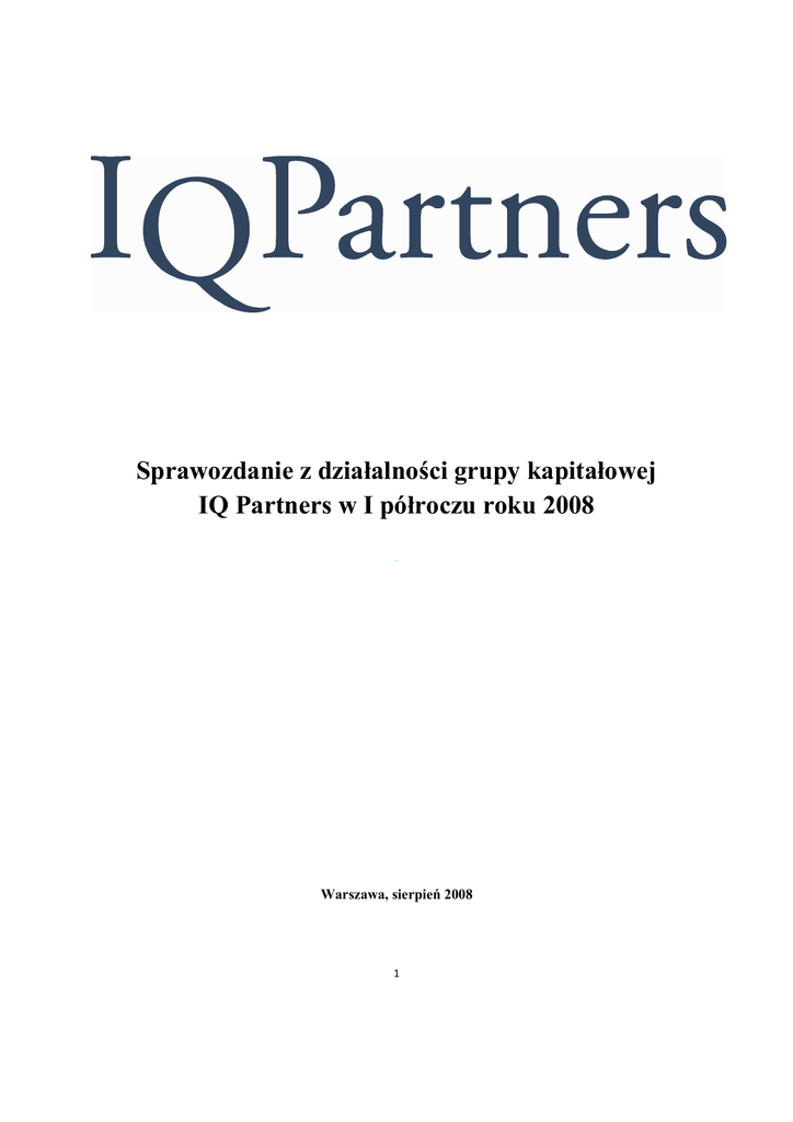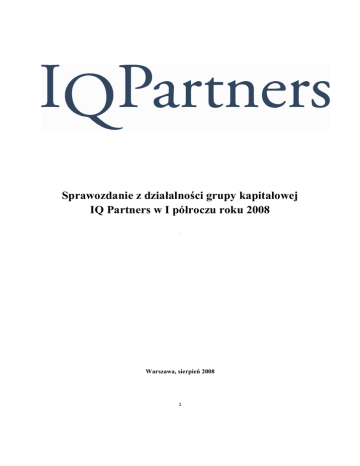 Sprawozdanie z działalności grupy kapitałowej IQ Partners w I półroczu roku 2008 Warszawa, sierpień 2008 1 1. Opis działalności Grupy Kapitałowej IQ Partners Grupę Kapitałową IQ Partners (dalej: Grupa Kapitałowa) tworzy spółka IQ Partners S.A. (dalej: Spółka) będąca spółką zarządzającą portfelem inwestycji kapitałowych o charakterze venture capital oraz spółki zależne i stowarzyszone wchodzące w skład jej portfela. Podstawową działalność IQ Partners S.A. stanowi nabywanie akcji lub udziałów oraz innych papierów wartościowych. Rolą IQ Partners S.A. w grupie jest: • pozyskiwanie finansowania, • działalność inwestycyjna. Pozyskiwanie finansowania sprowadza się do zapewnienia kapitału na działalność inwestycyjną. Działalność inwestycyjna obejmuje natomiast: • analizę i ocenę projektów inwestycyjnych oraz inicjowanie własnych projektów biznesowych, • nadzór właścicielski i pomoc w rozwoju spółek portfelowych, • dokonywanie wyjść z inwestycji. Strategia inwestycyjna IQ Partners S.A. zakłada głównie inwestowanie we wcześniejsze fazy rozwoju przedsiębiorstw – fazę seed i start-up. Część portfela mogą stanowić akcje lub udziały w spółkach na późniejszych etapach rozwoju. Główne kryteria inwestycyjne IQ Partners S.A. przedstawia poniższa tabela. Oczekiwana zwrotu stopa 50% dla projektów seed i start up, 30% późniejsze fazy rozwoju Horyzont inwestycji Zwykle 2-5 lat, maksimum 7 lat Preferowane branże Internet, technologie mobilne, usługi Faza rozwoju spółek w 75% seed i start-up, 25% późniejsze stadia rozwoju momencie dokonania inwestycji Pożądane cechy firmy produkt lub usługa lub inne dobro rzadkie skierowane na ściśle zdefiniowany rynek o dużym potencjale wzrostu lub patent, unikalne rozwiązanie techniczno – organizacyjne w zakresie oferowanych produktów i/lub usługi istnieją mocne podstawy do osiągnięcia przez firmę w krótkim terminie 2 dodatnich przepływów finansowych dysponuje szczegółową strategią rozwoju oraz biznes planem menadżerowie mają niezbędną wiedzę oraz doświadczenie w prowadzeniu przedsiębiorstw i wiedzę branżową, osobiście zaangażowani kapitałowo. W skład portfela inwestycyjnego IQ Partners na 30.06.2008 roku wchodziły następujące spółki: 'azwa spółki Udział w kapitale zakładowym na 30.06.2008* Udział w kapitale zakładowym na dzień sporządzenia sprawozdania* 100cen Sp. z o.o. 74,90% 74,90% Acreo Sp. zo.o. 30,07% 30,07% Cube Group S.A. 15,00% 15,00% E-kiosk S.A. 18,01% 18,01% E-muzyka S.A. 9,17% 9,17% GO MOBI! Sp. z o.o. 40,03% 40,03% Hub30.com Sp. z o.o. 59,95% 59,95% IQ Advisors Sp. z o.o. 100,00% 100,00% IQ Labs Sp. z o.o. 56,00% 56,00% IQ Mobile Sp. z o.o. 100,00% 100,00% IQ Sport Sp. z o.o. 95,56% 95,56% 3 Przedmiot działalności tworzenie i prowadzenie serwisu internetowego porównującego oferty oraz propozycje, które prezentowane są w gazetkach reklamowych w sieciach sklepów i supermarketów wdrażanie systemów klasy ERP, CRM, CMS; posiada bogate doświadczenie w zakresie wdrożeń systemu Navision Financials spółka zajmuje się pozycjonowaniem i marketingiem z wykorzystaniem wyszukiwarek internetowych, www.cubegroup.pl przygotowywanie internetowych wydań gazet i magazynów oraz ich dystrybucja w Internecie, a także prowadzenie serwisu pod domeną internetową www.e-kiosk.pl spółka działająca na styku branży muzycznej, telekomunikacyjnej oraz mediów, administruje prawami autorskimi do utworów muzycznych i video oraz prowadzi ich konwersję do formatów stosowanych w Internecie i telefonii komórkowej świadczenie usług wydawcom prasy polegających na konwersji materiałów drukowanych do formatu odczytywanego przez telefony komórkowe tworzenie i prowadzenie internetowego katalogu produktów wraz z zaawansowanymi narzędziami do wyszukiwania ze względu na ich specyfikę działalność w zakresie doradztwa finansowego tworzenie aplikacji internetowych na zlecenie klientów, a także tworzenie oraz rozwijanie własnych serwisów internetowych działalność w zakresie oprogramowania; spółka nie prowadzi jednak obecnie działalności operacyjnej, tworzenie i prowadzenie serwisu IQ Venture Capital s. a.r.l. 100,00% 100,00% Legenhit Sp. z o.o. 61,04% 61,04% Maestro Expert Sp. z o.o. 50,00% 50,00% NTC Inwestycje Sp. z o.o. 99,996% 99,996% Phone Call Sp. z o.o. 50,00% 50,00% Screen Network Sp. z o.o. 59,98% 59,98% Site S.A. 80,00% 80,00% 53,80%** 53,85%** Zakupy.com S.A. www.betplatform.com, oferującego użytkownikom usługi związane z oceną i podejmowaniem decyzji dotyczących zakładów bukmacherskich spółka inwestycyjna zarejestrowana w Luksemburgu spółka zajmuje się monitoringiem i identyfikacją klientów odwiedzających serwisy internetowe, usługi te wspierają działania działów sprzedaży oraz telemarketingu w prawidłowym doborze potencjalnych klientów oferuje usługi naprawy obuwia i dorabiania kluczy oraz usługi poligraficzne poprzez punkty obsługi zlokalizowane w centrach handlowych nie prowadzi działalności operacyjnej spółka świadczy usługi telemarketingowe za pośrednictwem nowoczesnego call center budowa własnej sieci nowoczesnych nośników reklamowych opartych m.in. o ekrany LCD i ekrany plazmowe oraz zarządzanie zawartością reklamową emitowaną w tych nośnikach spółka tworzy i zarządza serwisami internetowymi o różnej tematyce sprzedaż detaliczna towarów za pośrednictwem Internetu; spółka zależna bezpośrednio od spółki IQ Venture Capital sarl sprzedaż filmów na nośniku dvd oraz płyt muzycznych za pośrednictwem Internetu, spółka zależna od Zakupy.com SA działalność w zakresie zakładów sportowych, IQS Malta Limited 95,48% 95,48% spółka zależna od IQ Sport Sp. z o.o. *zgodnie ze stanem ujawnionym w Krajowym Rejestrze Sądowym, dla spółek E-dvd, IQS Malta Limited podano udział pośredni E-dvd Sp. z o.o. 53,80% 53,85% **udział bezpośred