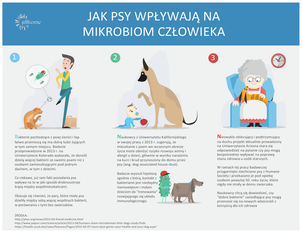 JAK PSY WPŁYWAJĄ NA MIKROBIOM CZŁOWIEKA 1 2 3 Bakterie pochodzące z psiej sierści i łap Naukowcy z Uniwersytetu Kalifornijskiego Niezwykle obiecujący i podtrzymujący łatwo przenoszą się ma skórę ludzi żyjących w tym samym miejscu. Badanie przeprowadzone w 2013 r. na Uniwersytecie Kolorado wykazało, że dorośli dzielą więcej bakterii ze swoimi psami niż z osobami zamieszkującymi pod jednym dachem, w tym z dziećmi. w swojej pracy z 2013 r. sugerują, że mieszkanie z psem we wczesnym okresie życia może obniżyć ryzyko rozwoju astmy i alergii u dzieci, głównie w wyniku narażenia na kurz i brud przynoszony do domu przez psy (ang. dog-associated house-dust). na duchu projekt aktualnie prowadzony na Uniwersytecie Arizona stara się odpowiedzieć na pytanie czy psy mogą bezpośrednio wpływać na poprawę stanu zdrowia u osób starszych. Co ciekawe, już sam fakt posiadania psa wpływa na to w jaki sposób drobnoustroje krążą między współmieszkańcami. Okazuje się również, że pary, które miały psa dzieliły między sobą więcej wspólnych bakterii, w porównaniu z tymi bez zwierzaków. Badacze wysnuli hipotezę zgodnie z którą, kontakt z bakteriamii jest niezbędny niemowlętom i małym dzieciom do "trenowania" rozwijającego się układu immunologicznego. ŹRÓDŁA: http://phys.org/news/2015-03-friend-medicine.html http://www.popsci.com/science/article/2013-04/humans-share-microbiomes-their-dogs-study-finds https://health.ucsd.edu/news/features/Pages/2015-05-07-mans-best-germs-your-health-and-your-dog.aspx" W ramach tej pracy badawczej przygarnięto niechciane psy z Humane Society i przekazano je pod opiekę osobom powyżej 50. roku życia, które nigdy nie miały w domu zwierzaka. Naukowcy chcą się dowiedzieć, czy "dobre bakterie" zasiedlające psy mogą przenosić się na nowych właścicieli z korzyścią dla ich zdrowia