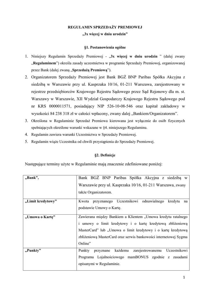 REGULAMIN SPRZEDAŻY PREMIOWEJ „3x więcej w dniu urodzin” §1. Postanowienia ogólne 1. Niniejszy Regulamin Sprzedaży Premiowej - „3x więcej w dniu urodzin ” (dalej zwany „Regulaminem”) określa zasady uczestnictwa w programie Sprzedaży Premiowej, organizowanej przez Bank (dalej zwaną „Sprzedażą Premiową”). 2. Organizatorem Sprzedaży Premiowej jest Bank BGŻ BNP Paribas Spółka Akcyjna z siedzibą w Warszawie przy ul. Kasprzaka 10/16, 01-211 Warszawa, zarejestrowany w rejestrze przedsiębiorców Krajowego Rejestru Sądowego przez Sąd Rejonowy dla m. st. Warszawy w Warszawie, XII Wydział Gospodarczy Krajowego Rejestru Sądowego pod nr KRS 0000011571, posiadający NIP 526-10-08-546 oraz kapitał zakładowy w wysokości 84 238 318 zł w całości wpłacony, zwany dalej „Bankiem/Organizatorem”. 3. Określona w Regulaminie Sprzedaż Premiowa kierowana jest wyłącznie do osób fizycznych spełniających określone warunki wskazane w §4. niniejszego Regulaminu. 4. Regulamin zawiera warunki Uczestnictwa w Sprzedaży Premiowej. 5. Regulamin wiąże Uczestnika od chwili przystąpienia do Sprzedaży Premiowej. §2. Definicje Następujące terminy użyte w Regulaminie mają znaczenie zdefiniowane poniżej: „Bank”, Bank BGŻ BNP Paribas Spółka Akcyjna z siedzibą w Warszawie przy ul. Kasprzaka 10/16, 01-211 Warszawa, zwany także Organizatorem. „Limit kredytowy” Kwota przyznanego Uczestnikowi odnawialnego kredytu na podstawie Umowy o Kartę. „Umowa o Kartę” Zawierana między Bankiem a Klientem „Umowa kredytu ratalnego i umowy o limit kredytowy i o kartę kredytową zbliżeniową MasterCard” lub „Umowa o limit kredytowy i o kartę kredytową zbliżeniową MasterCard oraz serwis bankowości internetowej Sygma Online” „Punkty” Punkty przyznane każdemu zarejestrowanemu Uczestnikowi Programu Lojalnościowego mamBONUS zgodnie z zasadami opisanymi w Regulaminie. 1 Osoba fizyczna, której na podstawie zawartej Umowy Posiadacz Karty/Klient została wydana Karta. Punkt obsługi Banku oznaczony logo Banku, w którym można „Punkt Banku BGŻ BNP Paribas” dokonać czynności określonych w Umowie, w szczególności składać i odbierać oświadczenia związane z Umową. Lista adresów Punktów Banku BGŻ BNP Paribas znajduje się na stronie http://www.bgzbnpparibas.pl/kontakt/znajdz-oddzial.asp Klient Banku, który spełnił warunki przystąpienia do Sprzedaży „Uczestnik” Premiowej opisanej w niniejszym Regulaminie. Prawo do rezygnacji z Umowy Kredytowej przez Kredytobiorcę, bez „Odstąpienie od umowy” podania przyczyny, w terminie 14 dni od zawarcia umowy poprzez złożenie oświadczenia o odstąpieniu od umowy, zgodnie z art.53 ust.1 ustawy z dnia 12 maja 2011 r. o kredycie konsumenckim. Program Lojalnościowy Sprzedaż Premiowa skierowana do osób fizycznych, które przystąpią mamBONUS do grona Klientów Banku i spełniają określone kryteria wskazane w Regulaminie Sprzedaży Premiowej „PROGRAM LOJANOŚCIOWY MAM BONUS” dostępnym na stronie www.mambonus.pl §3. Okres trwania Sprzedaży Premiowej Sprzedaż Premiowa trwa od 1.06.2016 do 31.12.2016 r. §4. Warunki uczestnictwa w Sprzedaży Premiowej 1. Uczestnikiem może być osoba fizyczna, która jest Klientem Banku, po spełnieniu łącznie następujących kryteriów: a) zawarła z Bankiem Umowę o Kartę i jest posiadaczem Karty wydanej przez Bank, a wyżej wymieniona Umowa o Kartę nie uległa rozwiązaniu, do czasu zakończenia Sprzedaży Premiowej, b) wyraziła zgodę na przetwarzanie jej danych osobowych w celach marketingowych przez Bank na stosownym formularzu i nie wycofała tej zgody, c) Karta nie została zablokowana przez Bank, d) terminowo spłaca zobowiązania z tytułu kredytów udzielonych przez Bank, e) dokona Transakcji Kartą kredytową objętą Programem mamBonus w dniu swoich urodzin. 2 2. Uczestnik Sprzedaży Premiowej bierze w niej udział osobiście, a jego uprawnienia nie podlegają przeniesieniu na inną osobę. 3. Uczestnictwo w Sprzedaży Premiowej Banku jest dobrowolne i bezpłatne. 4. Uczestnictwo w Sprzedaży Premiowej nie nakłada na Uczestnika żadnych zobowiązań, w szczególności nie zobowiązuje go do dokonania zakupu Nagrody, bądź też dokonania jakichkolwiek innych czynności. §5. Zasady gromadzenia i wymiany punktów na Nagrody 1. Uczestnik Sprzedaży Premiowej otrzyma dodatkowo 4 punkty za każdy 1 zł wydany w Transakcji Kartą dokonaną w dniu swoich urodzin oraz po spełnieniu kryteriów wskazanych w §4. ust.1.powyżej. 2. Zbierane przez Uczestnika Punkty są ważne przez 3 lata od momentu naliczenia, w przeciągu których może je wymienić na Nagrodę. 3. Warunkiem wymiany Punktów na Nagrodę jest posiadanie wystarczającej liczby Punktów. Liczba Punktów niezbędnych do wymiany na Nagrodę wskazana jest na stronie www.mambonus.pl 4. Aby dokonać wymiany Punktów na Nagrodę Uczestnik powinien złożyć odpowiednie zamówienie na dedykowanej stronie internetowej www.mambonus.pl. 5. Złożenia zamówienia wymaga wcześniejszej rejestracji poprzez utworzenie swojego identyfikatora (login) oraz hasła dostępu do dedykowanej strony internetowejwww.mambonus.pl. Do rejestracji konieczny jest Identyfikator Klienta (ośmiocyfrowy numer nadawany przez Bank) oraz 8 pierwszych cyfr numeru PESEL. 6. Rejestracja umożliwia późniejsze logowanie się Uczestnika na dedykowanej stronie internetowej Sprzedaży Premiowej za pomocą własnego loginu i hasła w celu sprawdzenia ilości zgromadzonych Punktów oraz zamówienia lub zakupienia Nagrody. 7. Zamówiona Nagroda jest wysyłana na adres wskazany przez Uczestnika w procesie rejestracji. 8. Punkty i prawa z nimi związane nie mogą być przenoszone ani zbywane w jakikolwiek sposób, ani nie mogą być przedmiotem żadnych innych czynności, z wyjątkiem określonych w niniejszym Regulaminie. 9. Punkty nie mają wartości pieniężnej. 10. Punkty nie mogą być wymieniane na ekwiwalent pieni