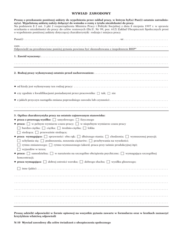 WYWIAD ZAWODOWY Prosz´ o przekazanie poni˝szej ankiety do wype∏nienia przez zak∏ad pracy, w którym by∏(a) Pan(i) ostatnio zatrudniony(a). Wype∏nionà ankiet´ nale˝y do∏àczyç do wniosku o rent´ z tytu∏u niezdolnoÊci do pracy. Na podstawie § 2 ust. 3 pkt 2 rozporzàdzenia Ministra Pracy i Polityki Socjalnej z dnia 8 sierpnia 1997 r. w sprawie orzekania o niezdolnoÊci do pracy do celów rentowych (Dz.U. Nr 99, poz. 612) Zak∏ad Ubezpieczeƒ Spo∏ecznych prosi o wype∏nienie poni˝szej ankiety dotyczàcej charakterystyki rodzaju i miejsca pracy. Pana(i) . . . . . . . . . . . . . . . . . . . . . . . . . . . . . . . . . . . . . . . . . . . . . . . . . . . . . . . . . . . . . ur. . . . . . . . . . . . . . . . . . . . . . . . . . . . . zam. . . . . . . . . . . . . . . . . . . . . . . . . . . . . . . . . . . . . . . . . . . . . . . . . . . . . . . . . . . . . . . . . . . . . . . . . . . . . . . . . . . . . . . . . . . . . . . Odpowiedê na przedstawione poni˝ej pytania powinna byç skonsultowana z inspektorem BHP* 1. Zawód wyuczony: . . . . . . . . . . . . . . . . . . . . . . . . . . . . . . . . . . . . . . . . . . . . . . . . . . . . . . . . . . . . . . . . . . . . . . . . . . . . . . . . . .................................................................................................. 2. Rodzaj pracy wykonywanej ostatnio przed zachorowaniem: . . . . . . . . . . . . . . . . . . . . . . . . . . . . . . . . . . . . . . . . . . . . . . . .................................................................................................. q od kiedy jest wykonywany ten rodzaj pracy: . . . . . . . . . . . . . . . . . . . . . . . . . . . . . . . . . . . . . . . . . . . . . . . . . . . . . . . . . . . . q czy zgodnie z kwalifikacjami posiadanymi przez pracownika: 6 tak; 6 nie q z jakich przyczyn nastàpi∏a zmiana poprzedniego zawodu lub czynnoÊci: . . . . . . . . . . . . . . . . . . . . . . . . . . . . . . . . . . . . . .................................................................................................. 3. Ogólna charakterystyka pracy na ostatnio zajmowanym stanowisku: 6 umys∏owego; 6 fizycznego 6 w pe∏nym wymiarze czasu pracy; 6 w niepe∏nym wymiarze czasu pracy 6 bardzo ci´˝ka; 6 ci´˝ka; 6 Êrednio-ci´˝ka; 6 lekka 6 siedzàca; 6 przewa˝nie siedzàca; praca wymagajàca: 6 sprawnoÊci obu ràk; 6 d∏u˝szego stania; 6 chodzenia; 6 wymuszonej pozycji; 6 schylania si´; 6 podnoszenia, noszenia ci´˝arów; 6 przebywania na wysokoÊci; 6 rytmu zmianowego; 6 rytmu wymuszonego (akord, praca przy taÊmie produkcyjnej itp); 6 wyjazdów w teren; praca: 6 samodzielna; 6 w nara˝eniu na szczególne obcià˝enia psychiczne; 6 wymagajàca szczególnej q praca z przewagà wysi∏ku: q praca: q q q q q q q q koncentracji; q praca wymagajàca: q 6 dobrej ostroÊci wzroku; 6 dobrego s∏uchu; 6 wysi∏ku g∏osowego; 6 inne (jakie). . . . . . . . . . . . . . . . . . . . . . . . . . . . . . . . . . . . . . . . . . . . . . . . . . . . . . . . . . . . . . . . . . . . . . . . . . . . . . . . . . . . .................................................................................................. .................................................................................................. .................................................................................................. .................................................................................................. .................................................................................................. Prosz´ udzieliç odpowiedzi w formie opisowej na wszystkie pytania zawarte w formularzu oraz w kratkach zaznaczyç krzy˝ykiem w∏aÊciwà odpowiedê N-10 Wywiad zawodowy dla celów Êwiadczeƒ z ubezpieczenia spo∏ecznego 4. Warunki pracy: q praca: 6 wewnàtrz pomieszczenia; 6 na zewnàtrz budynku; 6 inne (opisaç) . . . . . . . . . . . . . . . . . . . . . . . . . . . . . .................................................................................................. .................................................................................................. .................................................................................................. q czynniki szkodliwe zwiàzane ze Êrodowiskiem pracy: 6 zimny; 6 goràcy; 6 zmienny; 6 wilgoç; 6 py∏y; 6 pary i gazy dra˝niàce; 6 ha∏as; 6 wibracja; 6 Êrodki dra˝niàce skór´; 6 inne wp∏ywy Êrodowiska (opisaç) q mikroklimat: q .................................................................................................. .................................................................................................. .................................................................................................. .................................................................................................. q Czas ekspozycji w godzinach w ciàgu doby: . . . . . . . . . . . . . . . . . . . . . . . . . . . . . . . . . . . . . . . . . . . . . . . . . . . . . . . . . . . . 5. Data badania wst´pnego: . . . . . . . . . . . . . . . . . . . . . . . . . . . . . . . . . . . . . . . . . . . . . . . . . . . . . . . . . . . . . . . . . . . . . . . . . . . 6. Data ostatniego badania okresowego: . . . . . . . . . . . . . . . . . . . . . . . . . . . . . . . . . . . . . . . . . . . . . . . . . . . . . . . . . . . . . . . . . 6. Okres wa˝noÊci tego badania: . . . . . . . . . . . . . . . . . . . . . . . . . . . . . . . . . . . . . . . . . . . . . . . . . . . . . . . . . . . . . . . . . . . . . . . 7. Uwagi 7. . . . . . . . . . . . . . . . . . . . . . . . . . . . . . . . . . . . . . . . . . . . . . . . . . . . . . . . . . . . . . . . . . . . . . . . . . . . . . . . . . . . . . . . . . . . . . . . 7. . . . . . . . . . . . . . . . . . . . . . . . . . . . . . . . . . . . . . . . . . . . . . . . . . . . . . . . . . . . . . . . . . . . . . . . . . . . . . . . . . . . . . . . . . . . . . . . 7. . . . . . . . . . . . . . 