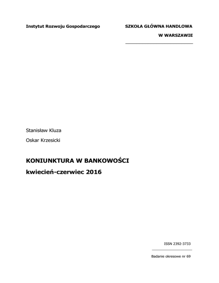 Instytut Rozwoju Gospodarczego SZKOŁA GŁÓWNA HANDLOWA W WARSZAWIE ________________________ Stanisław Kluza Oskar Krzesicki KONIUNKTURA W BANKOWOŚCI kwiecień-czerwiec 2016 ISSN 2392-3733 ____________________ Badanie okresowe nr 69 BADANIA KONIUNKTURY GOSPODARCZEJ INSTYTUTU ROZWOJU GOSPODARCZEGO SGH Rada Programowa: Elżbieta Adamowicz (przewodnicząca), Joanna Klimkowska (sekretarz) Marco Malgarini, Gernot Nerb, Ataman Ozyildirim, Janusz Stacewicz, István János Tóth Komitet Redakcyjny i adres Redakcji: Konrad Walczyk (Redaktor Naczelny) Stanisław Kluza Oskar Krzesicki Alina Gołębiewska ul. Madalińskiego 6/8, 02-513 Warszawa http://www.sgh.waw.pl/irg/ Wydawnictwo: Szkoła Główna Handlowa w Warszawie al. Niepodległości 162, 02-554 Warszawa wersja elektroniczna czasopisma jest wersją pierwotną Publikacja została zrecenzowana zgodnie z wytycznymi MNiSW ©Copyright by Szkoła Główna Handlowa w Warszawie, Warszawa 2016 Wszelkie prawa zastrzeżone. All rights reserved. ISSN 2392-3733 Nr rej. PR 18394 Informacje zawarte w niniejszym czasopiśmie oparte są na wynikach ankietowego badania koniunktury w bankowości, realizowanego przez IRG SGH według metodyki opisanej na stronie: http://kolegia.sgh.waw.pl/pl/KAE/struktura/IRG/koniunktura/Strony/metody.aspx 3 SPIS TREŚCI I. OMÓWIENIE WYNIKÓW BADANIA ........................................................................... 4 II. WYNIKI SZCZEGÓŁOWE .......................................................................................... 7 1) Wskaźnik koniunktury w bankowości ................................................................... 7 2) Wynik z działalności bankowej (netto) ................................................................. 8 3) Warunki prowadzenia działalności bankowej ........................................................ 8 4) Wielkość wypracowanego zysku .......................................................................... 9 5) Jakość portfela należności ................................................................................... 9 6) Ogólne zainteresowanie klientów usługami bankowymi ...................................... 10 7) Wielkość zatrudnienia ....................................................................................... 10 8) Czynniki ograniczające rozwój banków .............................................................. 11 9) Inwestycje kapitałowe ...................................................................................... 11 10) Spread (rozstęp) między oprocentowaniem kredytów i depozytów ..................... 12 11) Kurs PLN względem parytetu (koszyka walut) .................................................... 12 12) Stopy procentowe NBP (ogólna tendencja) ....................................................... 12 13) Ogólna sytuacja polskiej gospodarki ................................................................ 13 14) Ogólna sytuacja sektora finansowego na tle polskiej gospodarki ........................ 13 15) Wynik na operacjach reverse-repo (pomniejszony o repo) ................................. 13 16) Poziom inflacji ................................................................................................ 14 17) Realna podaż pieniądza ................................................................................... 14 III. SUMMARY............................................................................................................. 15 4 I. OMÓWIENIE WYNIKÓW BADANIA 1. W I kwartale 2016 r. wartość wskaźnika koniunktury w sektorze bankowym IRG SGH (IRGBAN) wzrosła, osiągając poziom 12,2 punktu. Wynik ten jest o 31,5 pkt. niższy od wskazania z poprzedniego kwartału, a także znacząco (o 9,9 pkt.) powyżej przewidywań wyrażonych przez banki w poprzednim badaniu. Na wzrost wartości wskaźnika bardzo silnie wpłynęło zwiększenie się wartości sald: wyniku z działalności bankowej i wypracowanego zysku. Wpływ salda zatrudnienia był ujemny. Spodziewane jest nieznaczne pogorszenie się sytuacji w kolejnym okresie, a wartość wskaźnika prognozowanej koniunktury wynosi 7,7 pkt. 2. W ostatnim okresie wynik z działalności bankowej (netto) podlegał znacznym wahaniom. W I kwartale 2016 r. wartość salda wzrosła do 20 pkt., podczas gdy w IV kwartale wynosiła 5,0 pkt. Obecny wynik okazał się lepszy od prognoz sprzed trzech miesięcy (o 5 pkt.). Przewidywania na kolejny kwartał wskazują na nieznaczny wzrost wyniku z działalności bankowej; wartość salda prognostycznego wynosi 26,3 pkt. 3. W I kwartale 2016 r., podobnie jak we wcześniejszym, wartość salda ocen dynamiki warunków prowadzenia działalności bankowej była ujemna i wyniosła -55,0 pkt. Oznacza to, że warunki do prowadzenia działalności bankowej pogorszyły się, lecz w nieco mniejszym stopniu niż w poprzednim kwartale. Bieżąca ocena jest lepsza od przewidywań sektora z poprzedniego kwartału (o 26,0 pkt.). Banki spodziewają się jednak dalszego pogorszenia się warunków prowadzenia przez nie działalności (wartość salda prognostycznego równa jest -10 pkt.). 4. Wartość wskaźnika prostego, pokazującego wielkość wypracowanego zysku, wyniosła +35,0 pkt. W ciągu kwartału wzrosła o 90,0 pkt. i jest o 30 pkt. wyższa od wartości przewidywanej w poprzednim badaniu. Z opinii respondentów wynika, że w kolejnym kwartale zyski nieznacznie wzrosną; wartość salda prognostycznego wynosi 10,5 pkt. 5. Wartość salda odpowiedzi na pytanie o jakość portfela obniżyła się (do poziomu -5,0 pkt.). Po raz pierwszy od wielu kwartałów liczba banków, których jakość portfela się pogorszyła, jest wyższa niż tych, których się poprawiła. Obecna wartość salda jest niższa od prognozowanej przed kwartałem (o 5,0 pkt.). Banki jednak spodziewają się poprawy jakości portfela w najbliższym okresie (wartość salda przewidywań wynosi 10,5 punktu). 6. Ogólne zainteresowanie klientów usługa