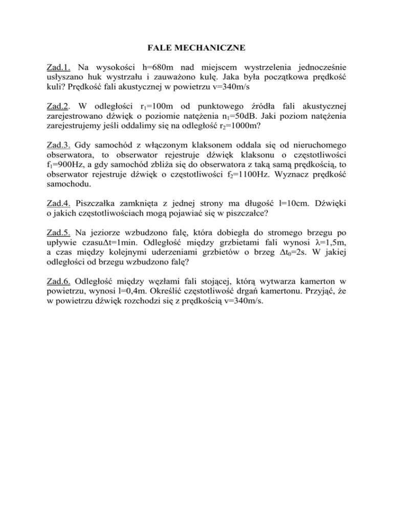 FALE MECHANICZNE Zad.1. Na wysokości h=680m nad miejscem wystrzelenia jednocześnie usłyszano huk wystrzału i zauważono kulę. Jaka była początkowa prędkość kuli? Prędkość fali akustycznej w powietrzu v=340m/s Zad.2. W odległości r1=100m od punktowego źródła fali akustycznej zarejestrowano dźwięk o poziomie natężenia n1=50dB. Jaki poziom natężenia zarejestrujemy jeśli oddalimy się na odległość r2=1000m? Zad.3. Gdy samochód z włączonym klaksonem oddala się od nieruchomego obserwatora, to obserwator rejestruje dźwięk klaksonu o częstotliwości f1=900Hz, a gdy samochód zbliża się do obserwatora z taką samą prędkością, to obserwator rejestruje dźwięk o częstotliwości f2=1100Hz. Wyznacz prędkość samochodu. Zad.4. Piszczałka zamknięta z jednej strony ma długość l=10cm. Dźwięki o jakich częstotliwościach mogą pojawiać się w piszczałce? Zad.5. Na jeziorze wzbudzono falę, która dobiegła do stromego brzegu po upływie czasu∆t=1min. Odległość między grzbietami fali wynosi λ=1,5m, a czas między kolejnymi uderzeniami grzbietów o brzeg ∆t0=2s. W jakiej odległości od brzegu wzbudzono falę? Zad.6. Odległość między węzłami fali stojącej, którą wytwarza kamerton w powietrzu, wynosi l=0,4m. Określić częstotliwość drgań kamertonu. Przyjąć, że w powietrzu dźwięk rozchodzi się z prędkością v=340m/s.
