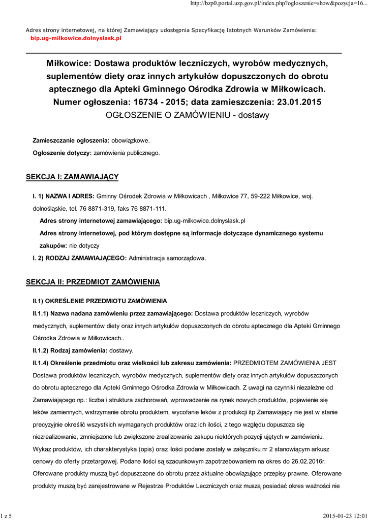 1z5 http://bzp0.portal.uzp.gov.pl/index.php?ogloszenie=show&pozycja=16... Adres strony internetowej, na której Zamawiający udostępnia Specyfikację Istotnych Warunków Zamówienia: bip.ug-milkowice.dolnyslask.pl Miłkowice: Dostawa produktów leczniczych, wyrobów medycznych, suplementów diety oraz innych artykułów dopuszczonych do obrotu aptecznego dla Apteki Gminnego Ośrodka Zdrowia w Miłkowicach. Numer ogłoszenia: 16734 - 2015; data zamieszczenia: 23.01.2015 OGŁOSZENIE O ZAMÓWIENIU - dostawy Zamieszczanie ogłoszenia: obowiązkowe. Ogłoszenie dotyczy: zamówienia publicznego. SEKCJA I: ZAMAWIAJĄCY I. 1) NAZWA I ADRES: Gminny Ośrodek Zdrowia w Miłkowicach , Miłkowice 77, 59-222 Miłkowice, woj. dolnośląskie, tel. 76 8871-319, faks 76 8871-111. Adres strony internetowej zamawiającego: bip.ug-milkowice.dolnyslask.pl Adres strony internetowej, pod którym dostępne są informacje dotyczące dynamicznego systemu zakupów: nie dotyczy I. 2) RODZAJ ZAMAWIAJĄCEGO: Administracja samorządowa. SEKCJA II: PRZEDMIOT ZAMÓWIENIA II.1) OKREŚLENIE PRZEDMIOTU ZAMÓWIENIA II.1.1) Nazwa nadana zamówieniu przez zamawiającego: Dostawa produktów leczniczych, wyrobów medycznych, suplementów diety oraz innych artykułów dopuszczonych do obrotu aptecznego dla Apteki Gminnego Ośrodka Zdrowia w Miłkowicach.. II.1.2) Rodzaj zamówienia: dostawy. II.1.4) Określenie przedmiotu oraz wielkości lub zakresu zamówienia: PRZEDMIOTEM ZAMÓWIENIA JEST Dostawa produktów leczniczych, wyrobów medycznych, suplementów diety oraz innych artykułów dopuszczonych do obrotu aptecznego dla Apteki Gminnego Ośrodka Zdrowia w Miłkowicach. Z uwagi na czynniki niezależne od Zamawiającego np.: liczba i struktura zachorowań, wprowadzenie na rynek nowych produktów, pojawienie się leków zamiennych, wstrzymanie obrotu produktem, wycofanie leków z produkcji itp Zamawiający nie jest w stanie precyzyjnie określić wszystkich wymaganych produktów oraz ich ilości, z tego względu dopuszcza się niezrealizowanie, zmniejszone lub zwiększone zrealizowanie zakupu niektórych pozycji ujętych w zamówieniu. Wykaz produktów, ich charakterystyka (opis) oraz ilości podane zostały w załączniku nr 2 stanowiącym arkusz cenowy do oferty przetargowej. Podane ilości są szacunkowym zapotrzebowaniem na okres do 26.02.2016r. Oferowane produkty muszą być dopuszczone do obrotu przez aktualne obowiązujące przepisy prawne. Oferowane produkty muszą być zarejestrowane w Rejestrze Produktów Leczniczych oraz muszą posiadać okres ważności nie 2015-01-23 12:01 2z5 http://bzp0.portal.uzp.gov.pl/index.php?ogloszenie=show&pozycja=16... krótszy niż 12 miesięcy, chyba że krótszy termin ważności wynika ze specyficznych właściwości medycznych produktu. Dopuszcza się krótszy okres ważności produktów leczniczych, krótszych, niż 12 miesięcy po uzgodnieniu z Zamawiającym. Dopuszcza się zaoferowanie produktów równoważnych pod warunkiem zachowania przez nie specyficznych właściwości farmakologicznych produktów wskazanych przez Zamawiającego, w szczególności tej samej postaci leku, dawki, wskazań i przeciwwskazań, skutków działania oraz efektów ubocznych. W przypadku czasowych promocji cenowych organizowanych przez producentów nie dotyczy leków podlegających refundacji przez NFZ Wykonawca biorący w nich udział będzie zobowiązany do zapewnienia Zamawiającemu możliwości uczestnictwa w akcjach promocyjnych i odpowiedniego obniżenia w tym czasie ceny produktów objętych promocją. Dostawa leków odbywać się będzie sukcesywnie na podstawie zamówień składanych przez zamawiającego, stosownym transportem wykonawcy na jego koszt wraz z wyładunkiem w miejscu wskazanym przez kierownika apteki. W sytuacjach awaryjnych wykonawca zobowiązany będzie do dostarczenia asortymentu objętego przedmiotem zamówienia do miejsca wskazanego przez zamawiającego niezwłocznie, nie dłużej niż w terminie 12 godzin licząc od dnia otrzymania zamówienia w formie elektronicznej lub telefonicznej. Miejsce realizacji zamówienia: Apteka Gminnego Ośrodku Zdrowia, ul Działkowa 2a, 59-222 Miłkowice.. II.1.6) Wspólny Słownik Zamówień (CPV): 33.60.00.00-6, 33.69.00.00-3. II.1.7) Czy dopuszcza się złożenie oferty częściowej: nie. II.1.8) Czy dopuszcza się złożenie oferty wariantowej: nie. II.2) CZAS TRWANIA ZAMÓWIENIA LUB TERMIN WYKONANIA: Zakończenie: 26.02.2016. SEKCJA III: INFORMACJE O CHARAKTERZE PRAWNYM, EKONOMICZNYM, FINANSOWYM I TECHNICZNYM III.1) WADIUM Informacja na temat wadium: nie dotyczy III.2) ZALICZKI III.3) WARUNKI UDZIAŁU W POSTĘPOWANIU ORAZ OPIS SPOSOBU DOKONYWANIA OCENY SPEŁNIANIA TYCH WARUNKÓW III. 3.1) Uprawnienia do wykonywania określonej działalności lub czynności, jeżeli przepisy prawa nakładają obowiązek ich posiadania Opis sposobu dokonywania oceny spełniania tego warunku Zamawiający uzna, że Wykonawca spełnia warunek dotyczący posiadania uprawnień do wykonywania określonej działalności lub czynności na podstawie złożonego aktualnego zezwolenia ( koncesji) na prowadzenie hurtowni farmaceutycznej lub w przypadku producenta - zezwolenie na produkcję, a także na obrót hurtowy środkami odurzającymi lub substancjami psychotropowymi - jeżeli wymagane są przepisami prawa ( w tym zgodnie z Ustawą z dnia 06.09.2001r Prawo Farmaceutyczne ( Tekst jednolity Dz. U z 2008r, nr 45, poz. 271 ) III.3.2) Wiedza i doświadczenie Opis sposobu dokonywania oceny spełniania tego warunku 2015-01-23 12:01 3z5 http://bzp0.portal.uzp.gov.pl/index.php?ogloszenie=show&pozycja=16... nie dotyczy III.3.3) Potencjał techniczny Opis sposobu dokonywania oceny spełniania tego warunku nie dotyczy III.3.4) Osoby zdolne do wykonania zamówienia Opis sposobu dokonywania oceny spełniania tego warunku nie dotyczy III.3.5) Sytuacja ekonomiczna i finansowa Opis sposobu dokonywania oceny spełniania tego warunku nie dotyczy III.4) INFORMACJA O OŚWIADCZENIACH LU
