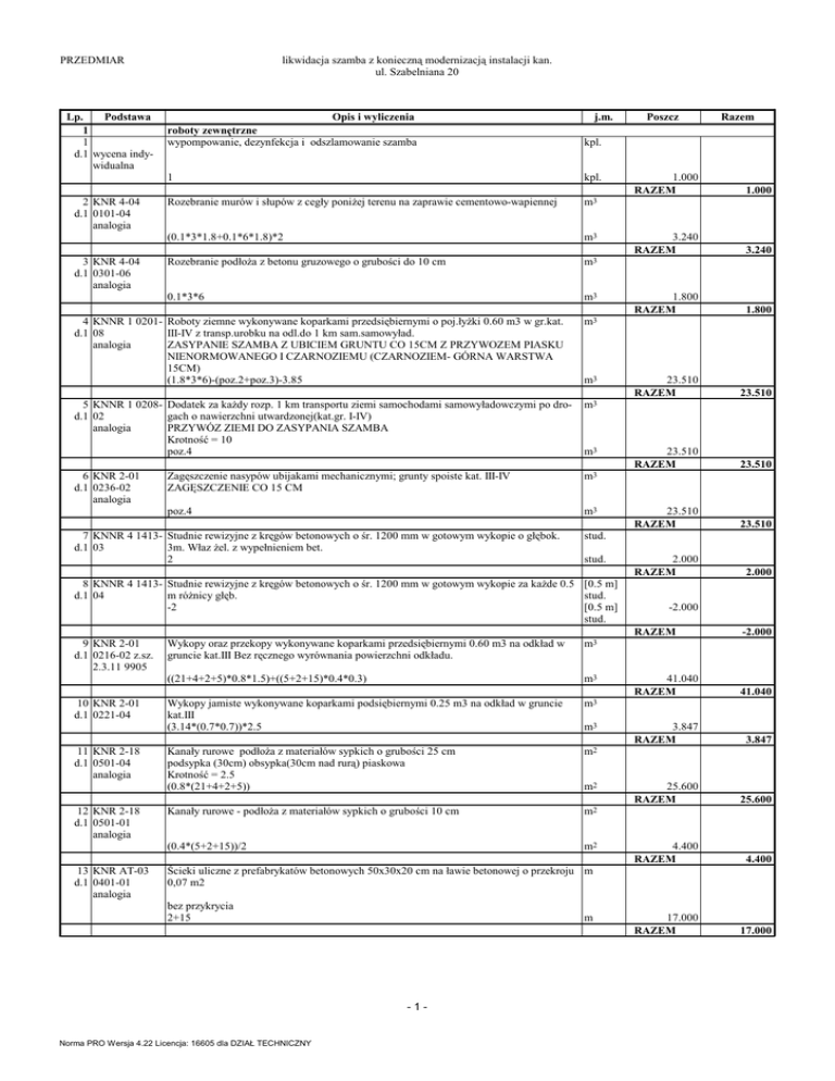 PRZEDMIAR Lp. Podstawa 1 1 d.1 wycena indywidualna 2 KNR 4-04 d.1 0101-04 analogia 3 KNR 4-04 d.1 0301-06 analogia likwidacja szamba z konieczną modernizacją instalacji kan. ul. Szabelniana 20 Opis i wyliczenia roboty zewnętrzne wypompowanie, dezynfekcja i odszlamowanie szamba j.m. kpl. 1 kpl. Rozebranie murów i słupów z cegły poniżej terenu na zaprawie cementowo-wapiennej m3 (0.1*3*1.8+0.1*6*1.8)*2 m3 Rozebranie podłoża z betonu gruzowego o grubości do 10 cm m3 0.1*3*6 m3 4 KNNR 1 0201- Roboty ziemne wykonywane koparkami przedsiębiernymi o poj.łyżki 0.60 m3 w gr.kat. d.1 08 III-IV z transp.urobku na odl.do 1 km sam.samowyład. analogia ZASYPANIE SZAMBA Z UBICIEM GRUNTU CO 15CM Z PRZYWOZEM PIASKU NIENORMOWANEGO I CZARNOZIEMU (CZARNOZIEM- GÓRNA WARSTWA 15CM) (1.8*3*6)-(poz.2+poz.3)-3.85 m3 5 KNNR 1 0208- Dodatek za każdy rozp. 1 km transportu ziemi samochodami samowyładowczymi po drod.1 02 gach o nawierzchni utwardzonej(kat.gr. I-IV) analogia PRZYWÓZ ZIEMI DO ZASYPANIA SZAMBA Krotność = 10 poz.4 m3 6 KNR 2-01 d.1 0236-02 analogia Zagęszczenie nasypów ubijakami mechanicznymi; grunty spoiste kat. III-IV ZAGĘSZCZENIE CO 15 CM m3 poz.4 m3 7 KNNR 4 1413- Studnie rewizyjne z kręgów betonowych o śr. 1200 mm w gotowym wykopie o głębok. d.1 03 3m. Właz żel. z wypełnieniem bet. 2 m3 m3 10 KNR 2-01 d.1 0221-04 11 KNR 2-18 d.1 0501-04 analogia 12 KNR 2-18 d.1 0501-01 analogia 13 KNR AT-03 d.1 0401-01 analogia Razem 1.000 RAZEM 1.000 3.240 RAZEM 3.240 1.800 RAZEM 1.800 23.510 RAZEM 23.510 23.510 RAZEM 23.510 23.510 RAZEM 23.510 2.000 RAZEM 2.000 stud. stud. 8 KNNR 4 1413- Studnie rewizyjne z kręgów betonowych o śr. 1200 mm w gotowym wykopie za każde 0.5 [0.5 m] d.1 04 m różnicy głęb. stud. -2 [0.5 m] stud. 9 KNR 2-01 d.1 0216-02 z.sz. 2.3.11 9905 Poszcz Wykopy oraz przekopy wykonywane koparkami przedsiębiernymi 0.60 m3 na odkład w gruncie kat.III Bez ręcznego wyrównania powierzchni odkładu. m3 ((21+4+2+5)*0.8*1.5)+((5+2+15)*0.4*0.3) m3 Wykopy jamiste wykonywane koparkami podsiębiernymi 0.25 m3 na odkład w gruncie kat.III (3.14*(0.7*0.7))*2.5 m3 Kanały rurowe podłoża z materiałów sypkich o grubości 25 cm podsypka (30cm) obsypka(30cm nad rurą) piaskowa Krotność = 2.5 (0.8*(21+4+2+5)) m2 Kanały rurowe - podłoża z materiałów sypkich o grubości 10 cm m2 (0.4*(5+2+15))/2 m2 m3 m2 -2.000 RAZEM -2.000 41.040 RAZEM 41.040 3.847 RAZEM 3.847 25.600 RAZEM 25.600 4.400 RAZEM 4.400 17.000 RAZEM 17.000 Ścieki uliczne z prefabrykatów betonowych 50x30x20 cm na ławie betonowej o przekroju m 0,07 m2 bez przykrycia 2+15 m -1- Norma PRO Wersja 4.22 Licencja: 16605 dla DZIAŁ TECHNICZNY PRZEDMIAR Lp. Podstawa 14 KNR AT-03 d.1 0401-01 analogia likwidacja szamba z konieczną modernizacją instalacji kan. ul. Szabelniana 20 Opis i wyliczenia j.m. Ścieki uliczne z prefabrykatów betonowych 50x28x10 cm na ławie betonowej o przekroju m 0,07 m2 -z kratką Odwodnienie liniowe betonowe, kratka ocynkowana , klasa A15 - obciążenie do 1,5T 5 m 15 KNNR 4 1427- Przejście przez ściany komór tulejami stalowymi "PS" przy grubości ściany 20 cm - otwór szt d.1 01 o śr. 180 mm analogia St8 4 szt 16 KNR-W 2-18 d.1 0408-02 Kanały z rur PVC łączonych na wcisk o śr. zewn. 160 mm m RURY Z PVC KIELICHOWE DO KANALIZACJI ZEW. FI 160/4,7MM 21+4+2+5 m 17 KNNR 4 1610- Próba wodna szczelności kanałów rurowych o śr.nominalnej do 150 mm d.1 01 1 odc. -1 prób. odc. -1 prób. Poszcz 5.000 RAZEM 5.000 4.000 RAZEM 4.000 32.000 RAZEM 32.000 1.000 RAZEM 18 KNR 2-01 d.1 0320-0201 19 KNR 2-01 d.1 0236-02 20 d.1 kalk. własna 21 KNR 2-21 d.1 0401-02 22 d.1 kalk. własna 23 d.1 kalk. własna Zasypywanie wykopów liniowych o ścianach pionowych w gruntach kat.III-IV; głębokość m3 do 1.5 m, szerokość 0.8-1.5 m poz.9-poz.11+1 m3 Zagęszczenie nasypów ubijakami mechanicznymi; grunty spoiste kat. III-IV m3 poz.18 m3 Kamerowanie ciągów kanalizacji dn 160mm m 21+4+2+5 m Wykonanie trawników dywanowych siewem na gruncie kat. III bez nawożenia m2 3*6 m2 nadzór przez Katowickie Wodociągi szt 1 szt wykonanie dokumentacji geodezyjnej powykonawczej - naniesienie przyłącza na Mapę Za- szt sadniczą Miasta Katowice 1 szt -2- Norma PRO Wersja 4.22 Licencja: 16605 dla DZIAŁ TECHNICZNY Razem 1.000 16.440 RAZEM 16.440 16.440 RAZEM 16.440 32.000 RAZEM 32.000 18.000 RAZEM 18.000 1.000 RAZEM 1.000 1.000 RAZEM 1.000