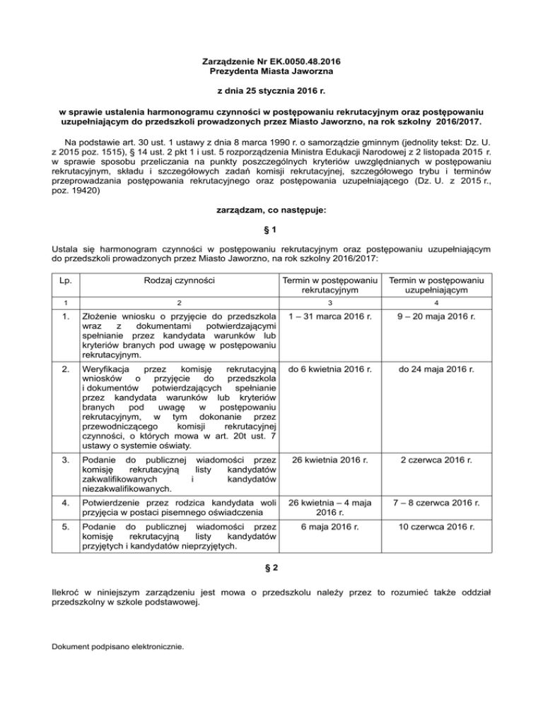 Zarządzenie Nr EK.0050.48.2016 Prezydenta Miasta Jaworzna z dnia 25 stycznia 2016 r. w sprawie ustalenia harmonogramu czynności w postępowaniu rekrutacyjnym oraz postępowaniu uzupełniającym do przedszkoli prowadzonych przez Miasto Jaworzno, na rok szkolny 2016/2017. Na podstawie art. 30 ust. 1 ustawy z dnia 8 marca 1990 r. o samorządzie gminnym (jednolity tekst: Dz. U. z 2015 poz. 1515), § 14 ust. 2 pkt 1 i ust. 5 rozporządzenia Ministra Edukacji Narodowej z 2 listopada 2015 r. w sprawie sposobu przeliczania na punkty poszczególnych kryteriów uwzględnianych w postępowaniu rekrutacyjnym, składu i szczegółowych zadań komisji rekrutacyjnej, szczegółowego trybu i terminów przeprowadzania postępowania rekrutacyjnego oraz postępowania uzupełniającego (Dz. U. z 2015 r., poz. 19420) zarządzam, co następuje: §1 Ustala się harmonogram czynności w postępowaniu rekrutacyjnym oraz postępowaniu uzupełniającym do przedszkoli prowadzonych przez Miasto Jaworzno, na rok szkolny 2016/2017: Lp. Rodzaj czynności Termin w postępowaniu rekrutacyjnym Termin w postępowaniu uzupełniającym 1 2 3 4 1. Złożenie wniosku o przyjęcie do przedszkola wraz z dokumentami potwierdzającymi spełnianie przez kandydata warunków lub kryteriów branych pod uwagę w postępowaniu rekrutacyjnym. 1 – 31 marca 2016 r. 9 – 20 maja 2016 r. 2. Weryfikacja przez komisję rekrutacyjną wniosków o przyjęcie do przedszkola i dokumentów potwierdzających spełnianie przez kandydata warunków lub kryteriów branych pod uwagę w postępowaniu rekrutacyjnym, w tym dokonanie przez przewodniczącego komisji rekrutacyjnej czynności, o których mowa w art. 20t ust. 7 ustawy o systemie oświaty. do 6 kwietnia 2016 r. do 24 maja 2016 r. 3. Podanie do publicznej wiadomości przez komisję rekrutacyjną listy kandydatów zakwalifikowanych i kandydatów niezakwalifikowanych. 26 kwietnia 2016 r. 2 czerwca 2016 r. 4. Potwierdzenie przez rodzica kandydata woli przyjęcia w postaci pisemnego oświadczenia 26 kwietnia – 4 maja 2016 r. 7 – 8 czerwca 2016 r. 5. Podanie do publicznej wiadomości przez komisję rekrutacyjną listy kandydatów przyjętych i kandydatów nieprzyjętych. 6 maja 2016 r. 10 czerwca 2016 r. §2 Ilekroć w niniejszym zarządzeniu jest mowa o przedszkolu należy przez to rozumieć także oddział przedszkolny w szkole podstawowej. Dokument podpisano elektronicznie. §3 Wykonanie zarządzenia powierzam dyrektorom przedszkoli oraz dyrektorom szkół podstawowych, w których zorganizowano oddziały przedszkolne, prowadzonych przez Miasto Jaworzno. §4 Zarządzenie wchodzi w życie z dniem podpisania. PREZYDENT MIASTA JAWORZNA Paweł Silbert Dokument podpisano elektronicznie. Rozdzielnik do zarządzenia Nr EK.0050.48.2016 Prezydenta Miasta Jaworzna z dnia 25 stycznia 2016 r. w sprawie ustalenia harmonogramu czynności w postępowaniu rekrutacyjnym oraz postępowaniu uzupełniającym do przedszkoli prowadzonych przez Miasto Jaworzno, na rok szkolny 2016/2017. Lp. Otrzymujący /imię i nazwisko lub symbol komórki organizacyjnej/ 1 2 3 4 5 6 7 8 9 10 11 12 13 14 15 16 17 18 19 20 21 22 23 24 25 26 PM 1 PM 2 PM 3 w ZS 3 PM 4 PM 5 PM 6 w ZSzP 2 PM 7 PM 9 PM 10 PM 12 PM 14 PM 15 PM 17 PM 18 PM 19 PM 22 w ZSzP 1 PM 24 PM 25 PM 26 PM 27 SP 3 SP 7 SP 9 SP 14 SP 19 Wydz. EK aa. Dokument podpisano elektronicznie. Uwagi
