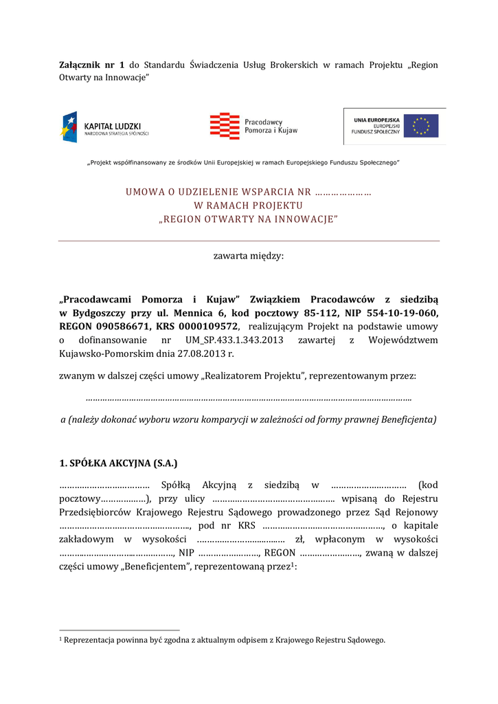 Załącznik nr 1 do Standardu Świadczenia Usług Brokerskich w ramach Projektu „Region Otwarty na Innowacje” „Projekt współfinansowany ze środków Unii Europejskiej w ramach Europejskiego Funduszu Społecznego” UMOWA O UDZIELENIE WSPARCIA NR ………………… W RAMACH PROJEKTU „REGION OTWARTY NA INNOWACJE” zawarta między: „Pracodawcami Pomorza i Kujaw” Związkiem Pracodawców z siedzibą w Bydgoszczy przy ul. Mennica 6, kod pocztowy 85-112, NIP 554-10-19-060, REGON 090586671, KRS 0000109572, realizującym Projekt na podstawie umowy o dofinansowanie nr UM_SP.433.1.343.2013 zawartej z Województwem Kujawsko-Pomorskim dnia 27.08.2013 r. zwanym w dalszej części umowy „Realizatorem Projektu”, reprezentowanym przez: ………………………………………………………………………………………………………………………. a (należy dokonać wyboru wzoru komparycji w zależności od formy prawnej Beneficjenta) 1. SPÓŁKA AKCYJNA (S.A.) ……………………………… Spółką Akcyjną z siedzibą w ………………………… (kod pocztowy………………), przy ulicy …………………………………………. wpisaną do Rejestru Przedsiębiorców Krajowego Rejestru Sądowego prowadzonego przez Sąd Rejonowy ……………………………………………., pod nr KRS …………………………………………, o kapitale zakładowym w wysokości .……………………...…..… zł, wpłaconym w wysokości ………..………………..……………, NIP ……………………, REGON ……………………, zwaną w dalszej części umowy „Beneficjentem”, reprezentowaną przez1: 1 Reprezentacja powinna być zgodna z aktualnym odpisem z Krajowego Rejestru Sądowego. .................................................................................................................................................... (imię i nazwisko, pełniona funkcja) 2. SPÓŁKA Z OGRANICZONĄ ODPOWIEDZIALNOŚCIĄ (sp. z o.o. lub spółka z o.o.) …………………………….… Spółką z ograniczoną odpowiedzialnością z siedzibą w……………………… (kod pocztowy…………………), przy ulicy …………………….…..…, wpisaną do Rejestru Przedsiębiorców Krajowego Rejestru Sądowego prowadzonego przez Sąd Rejonowy ………………..………….……, pod nr KRS ………..………………………, o kapitale zakładowym w wysokości …………………………..… zł, NIP ………..………….……, REGON ………….……………, zwaną w dalszej części umowy „Beneficjentem”, reprezentowaną przez2: .................................................................................................................................................... (imię i nazwisko, pełniona funkcja) 3. SPÓŁKI OSOBOWE: SPÓŁKA JAWNA (sp.j.), SPÓŁKA KOMANDYTOWA (sp.k.), SPÓŁKA PARTNERSKA (sp.p.) , SPÓŁKA KOMANDYTOWO-AKCYJNA ( Sp.k.a) …………………………....… Spółką……. z siedzibą w …….………………… (kod pocztowy …..………….), przy ulicy …………………………, wpisaną do Rejestru Przedsiębiorców Krajowego Rejestru Sądowego prowadzonego przez Sąd Rejonowy …………..………………, pod nr KRS ……………………, NIP ……………………, REGON ……………………, zwaną w dalszej części umowy „Beneficjentem”, reprezentowaną przez3: .................................................................................................................................................... (imię i nazwisko, pełniona funkcja) 4. OSOBA FIZYCZNA PROWADZĄCA DZIAŁALNOŚĆ GOSPODARCZĄ …………………………..……… zamieszkałym w …………………………… (kod pocztowy……………………), przy ul. ……………………………., prowadzącym działalność gospodarczą pod firmą ………………………… w …………………… (kod pocztowy ……………………), przy ul. ……………………, wpisanym do Centralnej Ewidencji i Informacji o Działalności Gospodarczej (CEIDG) prowadzonej w systemie teleinformatycznym przez ministra właściwego do spraw gospodarki; NIP ……………………, REGON 2 3 Reprezentacja powinna być zgodna z aktualnym odpisem z Krajowego Rejestru Sądowego. Reprezentacja powinna być zgodna z aktualnym odpisem z Krajowego Rejestru Sądowego. ……………………, zwanym w dalszej części umowy „Beneficjentem”, reprezentowanym przez4: .................................................................................................................................................... (imię i nazwisko, pełniona funkcja) 5. SPÓŁKA CYWILNA (s.c.) …………….…………………..… zamieszkałym w ……...…………………… (kod pocztowy……………………), przy ul. ……………….………., wpisanym do Centralnej Ewidencji i Informacji o Działalności Gospodarczej (CEIDG) prowadzonej w systemie teleinformatycznym przez ministra właściwego do spraw gospodarki, i ……………………… zamieszkałym w …………………… (kod pocztowy ……………………), przy ul. ……….………………., wpisanym do Centralnej Ewidencji i Informacji o Działalności Gospodarczej (CEIDG) prowadzonej w systemie teleinformatycznym przez ministra właściwego do spraw gospodarki, prowadzącym wspólnie działalność gospodarczą w formie spółki cywilnej pod firmą …………………………………… w …………………… (kod pocztowy ……………………), przy ul. ……………………, NIP ………………, REGON……………………, zwani w dalszej części umowy „Beneficjentem”, reprezentowani przez5: .............................................................................................................................................