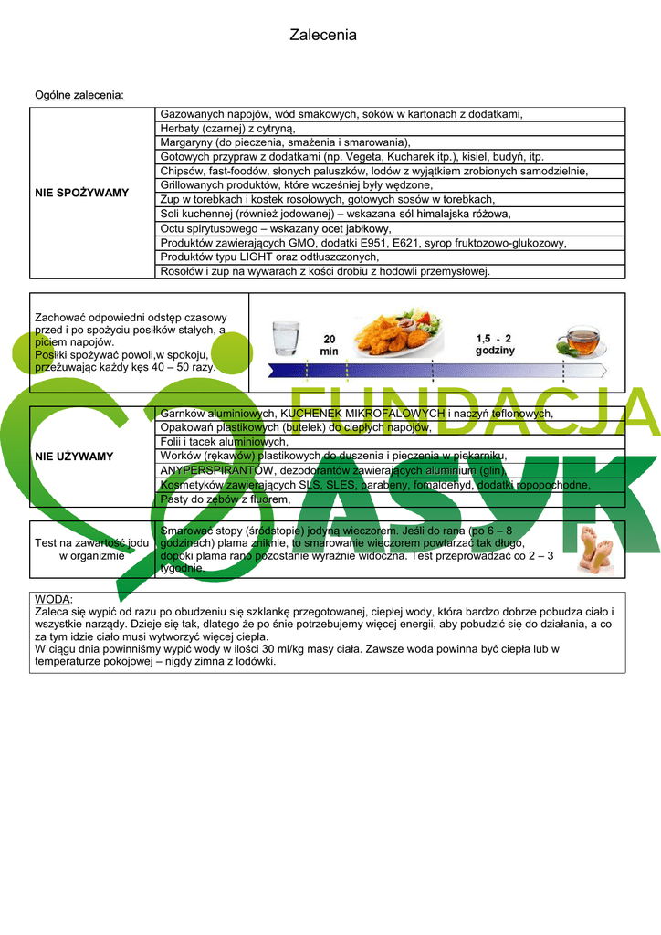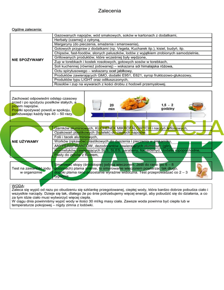 Badanie STRD Zalecenia Wykonane w dniu ........................................ Wstępna ocena energetyczna i podstawowe zalecenia Ogólne zalecenia: NIE SPOŻYWAMY Gazowanych napojów, wód smakowych, soków w kartonach z dodatkami, Herbaty (czarnej) z cytryną, Margaryny (do pieczenia, smażenia i smarowania), Gotowych przypraw z dodatkami (np. Vegeta, Kucharek itp.), kisiel, budyń, itp. Chipsów, fast-foodów, słonych paluszków, lodów z wyjątkiem zrobionych samodzielnie, Grillowanych produktów, które wcześniej były wędzone, Zup w torebkach i kostek rosołowych, gotowych sosów w torebkach, Soli kuchennej (również jodowanej) – wskazana sól himalajska różowa, Octu spirytusowego – wskazany ocet jabłkowy, jabłkowy Produktów zawierających GMO, dodatki E951, E621, syrop fruktozowo-glukozowy, Produktów typu LIGHT oraz odtłuszczonych, Rosołów i zup na wywarach z kości drobiu z hodowli przemysłowej. Zachować odpowiedni odstęp czasowy przed i po spożyciu posiłków stałych, a piciem napojów. Posiłki spożywać powoli,w spokoju, przeżuwając każdy kęs 40 – 50 razy. NIE UŻYWAMY Garnków aluminiowych, KUCHENEK MIKROFALOWYCH i naczyń teflonowych, Opakowań plastikowych (butelek) do ciepłych napojów, Folii i tacek aluminiowych, Worków (rękawów) plastikowych do duszenia i pieczenia w piekarniku, ANYPERSPIRANTÓW, ANYPERSPIRANTÓW dezodorantów zawierających aluminium (glin), Kosmetyków zawierających SLS, SLES, parabeny, fomaldehyd, dodatki ropopochodne, Pasty do zębów z fluorem, fluorem Test na zawartość jodu w organizmie Smarować stopy (śródstopie) jodyną wieczorem. Jeśli do rana (po 6 – 8 godzinach) plama zniknie, to smarowanie wieczorem powtarzać tak długo, dopóki plama rano pozostanie wyraźnie widoczna. Test przeprowadzać co 2 – 3 tygodnie. WODA: Zaleca się wypić od razu po obudzeniu się szklankę przegotowanej, ciepłej wody, która bardzo dobrze pobudza ciało i wszystkie narządy. Dzieje się tak, dlatego że po śnie potrzebujemy więcej energii, aby pobudzić się do działania, a co za tym idzie ciało musi wytworzyć więcej ciepła. W ciągu dnia powinniśmy wypić wody w ilości 30 ml/kg masy ciała. Zawsze woda powinna być ciepła lub w temperaturze pokojowej – nigdy zimna z lodówki.