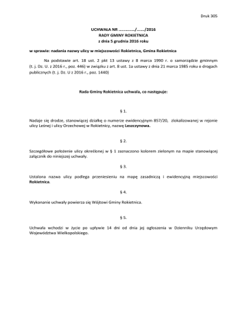 Druk 305 UCHWAŁA NR ……………/……./2016 RADY GMINY ROKIETNICA z dnia 5 grudnia 2016 roku w sprawie: nadania nazwy ulicy w miejscowości Rokietnica, Gmina Rokietnica Na podstawie art. 18 ust. 2 pkt 13 ustawy z 8 marca 1990 r. o samorządzie gminnym (t. j. Dz. U. z 2016 r., poz. 446) w związku z art. 8 ust. 1a ustawy z dnia 21 marca 1985 roku o drogach publicznych (t. j. Dz. U z 2016 r., poz. 1440) Rada Gminy Rokietnica uchwala, co następuje: § 1. Nadaje się drodze, stanowiącej działkę o numerze ewidencyjnym 857/20, zlokalizowanej w rejonie ulicy Leśnej i ulicy Orzechowej w Rokietnicy, nazwę Leszczynowa. § 2. Szczegółowe położenie ulicy określonej w § 1 zaznaczono kolorem zielonym na mapie stanowiącej załącznik do niniejszej uchwały. § 3. Ustalona nazwa ulicy podlega przeniesieniu na mapę zasadniczą i ewidencyjną miejscowości Rokietnica. § 4. Wykonanie uchwały powierza się Wójtowi Gminy Rokietnica. § 5. Uchwała wchodzi w życie po upływie 14 dni od dnia jej ogłoszenia w Dzienniku Urzędowym Województwa Wielkopolskiego. Druk 305 Uzasadnienie do UCHWAŁY Nr ………/…./2016 RADY GMINY ROKIETNICA z dnia 5 grudnia 2016 roku w sprawie: nadania nazwy ulicy w miejscowości Rokietnica, Gmina Rokietnica Zgodnie z przepisem art. 18 ust. 2 pkt 13 ustawy z 8 marca 1990 r. o samorządzie gminnym (t. j. Dz. U. z 2016 r., poz. 446) podejmowanie uchwał w sprawach herbu gminy, nazw ulic i placów będących drogami publicznymi lub nazw dróg wewnętrznych w rozumieniu ustawy z dnia 21 marca 1985 r. o drogach publicznych (t. j. Dz. U. z 2016 r., poz. 1440), a także wznoszenia pomników należy do wyłącznej kompetencji rady gminy. Zgodnie zaś z przepisem art. 8 ust. 1a ustawy z dnia 21 marca 1985 roku o drogach publicznych podjęcie przez radę gminy uchwały w sprawie nadania nazwy drodze wewnętrznej wymaga uzyskania pisemnej zgody właścicieli terenów, na których jest ona zlokalizowana. Działka o numerze ewidencyjnym 857/20 jest własnością prywatną i stanowi drogę dojazdową do nowopowstających budynków mieszkalnych. Właściciel działki zwrócił się z wnioskiem o nadanie nazwy przedmiotowej drodze, podając własną propozycję. Rada Sołecka Sołectwa Rokietnica wraz z Sołtysem zaopiniowała pozytywnie wniosek i zaproponowała własną nazwę ulicy. Z uwagi na fakt, iż przedmiotowa działka spełnia wymogi dotyczące nadania nazwy drodze, tzn. posiada status drogi i stanowi drogę dojazdową do nowopowstających budynków mieszkalnych oraz wydzielonych działek, podjęcie uchwały jest w pełni uzasadnione. Druk 305 Załącznik do UCHWAŁY Nr …………/…../2016 RADY GMINY ROKIETNICA z dnia 5 grudnia 2016 roku