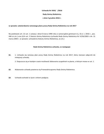 Uchwała Nr XXXI/ /2016 Rady Gminy Rokietnica z dnia 5 grudnia 2016 r. w sprawie: zatwierdzenia ramowego planu pracy Rady Gminy Rokietnica na rok 2017 Na podstawie art. 22 ust. 1 ustawy z dnia 8 marca 1990 roku o samorządzie gminnym (t.j. Dz.U. z 2016 r., poz. 446 ze zm.) oraz §14 ust. 2 Statutu Gminy Rokietnica (uchwała Rady Gminy Rokietnica Nr VI/56/2003 z dn. 31 marca 2003 r. w sprawie: uchwalenia Statutu Gminy Rokietnica, ze zm.) Rada Gminy Rokietnica uchwala, co następuje: §1. 1. Uchwala się ramowy plan pracy Rady Gminy Rokietnica na rok 2017, który stanowi załącznik do niniejszej uchwały. 2. Dopuszcza się w każdym czasie możliwość dokonania uzupełnień w planie, o którym mowa w ust. 1. §2. Wykonanie uchwały powierza się Przewodniczącemu Rady Gminy Rokietnica. §3. Uchwała wchodzi w życie z dniem podjęcia. UZASADNIENIE do Uchwały Nr XXXI/ /2016 Rady Gminy Rokietnica z dnia 5 grudnia 2016 r. w sprawie: zatwierdzenia ramowego planu pracy Rady Gminy Rokietnica na rok 2017 Zgodnie z § 14 ust. 2 Statutu Gminy Rokietnica, Rada działa zgodnie z rocznym planem pracy uchwalonym do końca roku kalendarzowego poprzedzającego rok objęty planem. Załącznik Do Uchwały Nr XXXI/ /2016 Rady Gminy Rokietnica z dnia 5 grudnia 2016 r. RAMOWY PLAN PRACY RADY GMINY ROKIETNICA NA ROK 2017 Miesiąc Posiedzenia i ich tematyka styczeń luty marzec kwiecień maj czerwiec lipiec sierpień wrzesień październik listopad grudzień *) wspólne posiedzenia komisji Rady Gminy odbywają się w czwartki poprzedzające dzień sesji **) sesje Rady Gminy odbywają się w ostatni poniedziałek miesiąca