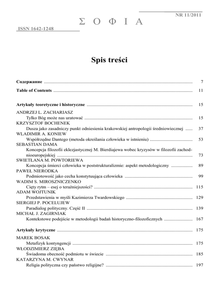 ISSN 1642-1248 Σ Ο Φ Ι Α NR11/2011 7/2007 NR ISSN 1642-1248 Spis treści Cодержание ............................................................................................................................. 7 Table of Contents ..................................................................................................................... 11 Artykuły teoretyczne i historyczne ......................................................................................... 15 ANDRZEJ L. ZACHARIASZ Tylko Bóg może nas uratować ........................................................................................... KRZYSZTOF BOCHENEK Dusza jako zasadniczy punkt odniesienia krakowskiej antropologii średniowiecznej ...... WLADIMIR A. KONIEW Współrzędne Dantego (metoda określania człowieka w istnieniu) .................................... SEBASTIAN DAMA Koncepcja filozofii eklezjastycznej M. Bierdiajewa wobec kryzysów w filozofii zachodnioeuropejskiej .................................................................................................................. SWIETŁANA M. POWTORIEWA Koncepcja śmierci człowieka w poststrukturalizmie: aspekt metodologiczny .................. PAWEŁ NIERODKA Podmiotowość jako cecha konstytuująca człowieka ......................................................... WADIM S. MIROSZNICZENKO Cięty rytm – esej o teraźniejszości? ................................................................................... ADAM WOJTUNIK Przedstawienia w myśli Kazimierza Twardowskiego ........................................................ SIERGIEJ P. POCELUJEW Paradialog polityczny. Część II ......................................................................................... MICHAŁ J. ZAGIRNIAK Kontekstowe podejście w metodologii badań historyczno-filozoficznych ........................ 15 37 53 73 89 99 115 129 139 167 Artykuły krytyczne .................................................................................................................. 175 MAREK BOSAK Metafizyk kontyngencji ..................................................................................................... 175 WŁODZIMIERZ ZIĘBA Świadoma obecność podmiotu w świecie ......................................................................... 185 KATARZYNA M. CWYNAR Religia polityczna czy państwo religijne? ......................................................................... 197 4 Spis treści Artykuły polemiczne, polemiki ................................................................................................ 213 Okrągły Stół Filozofów Krajów Słowiańskich (18 VI 2010 r.) ............................................. 213 ANDRZEJ L. ZACHARIASZ Wprowadzenie do panelu Koniec kultury europejskiej czy początek nowego człowieka?. JÓZEF DĘBOWSKI W obronie granic ............................................................................................................... SŁAWOMIR KAPUSTKA O możliwym końcu człowieka .......................................................................................... JACEK BRECZKO Zwycięstwo liberalnej wizji niezmiennej natury ludzkiej jako zagrożenie ........................ MAŁGORZATA DERC Człowiek w XXI wieku – postulaty edukacyjne ................................................................ ANTONI KRAWCZYK Czy technokratyzm jest zasadny? ................................................................................ JAN WADOWSKI Czy kultura europejska umiera? ........................................................................................ WIKTOR P. SAWIELJEW Kultura europejska: upadek czy odrodzenie? .................................................................... WIESŁAW SZTUMSKI Kilka słów o kulturze europejskiej i nowym człowieku .................................................... 214 216 224 228 232 239 243 248 253 Polemika wokół Okrągłego Stołu Filozofów Krajów Słowiańskich (18 VI 2010 r.) ............. 259 LESZEK GAWOR Kilka uwag w sprawie obrad ............................................................................................. ANDRZEJ L. ZACHARIASZ W sprawie europocentryzmu i ekologizmu. Odpowiedź polemiczna Leszkowi Gaworowi .. GRAŻYNA ŻURKOWSKA Czy ekofilozofia warta jest zachodu? ................................................................................ STEFAN SYMOTIUK Ekologizm wymaga nowej formuły ................................................................................... 260 265 277 283 Refleksje ................................................................................................................................... 287 ANDRZEJ L. ZACHARIASZ Refleksje o roli idei w kształtowaniu cywilizacji technicznej ........................................... 287 Recenzje, noty .......................................................................................................................... 293 PIOTR GUGAŁA Nihilizm banalny ............................................................................................................... 293 ELIZA KARCZYŃSKA O przekraczaniu granic ...................................................................................................... 298 ARTUR S. KOSTOMAROW Człowiek wobec wyzwania władzy, czyli w jaki sposób możliwe jest niepolityczne odczytanie władzy .............................................................................................................. 301 Spis treści 5 ARTUR MENDRALA Kruchy absolut – między idealnym fundamentem a realnym życzeniem .......................... 305 ZLATICA PLAŠIENKOVÁ O troch podobách filozofovania a filozofie na Slovensku ................................................. 308 MARCIN SUBCZAK Soteriologiczny wymiar myśli platońskiej ......................................................................... 313 Prezentacje, wywiady ....................................................................
