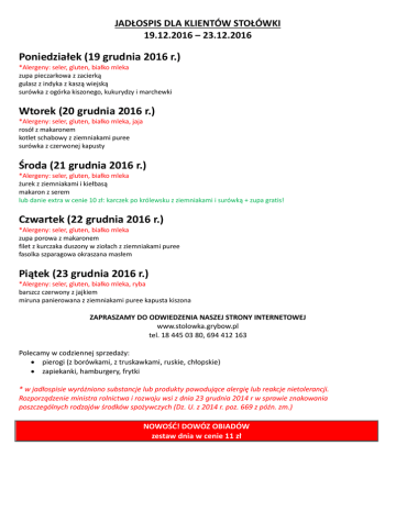 JADŁOSPIS DLA KLIENTÓW STOŁÓWKI 19.12.2016 – 23.12.2016 Poniedziałek (19 grudnia 2016 r.) *Alergeny: seler, gluten, białko mleka zupa pieczarkowa z zacierką gulasz z indyka z kaszą wiejską surówka z ogórka kiszonego, kukurydzy i marchewki Wtorek (20 grudnia 2016 r.) *Alergeny: seler, gluten, białko mleka, jaja rosół z makaronem kotlet schabowy z ziemniakami puree surówka z czerwonej kapusty Środa (21 grudnia 2016 r.) *Alergeny: seler, gluten, białko mleka żurek z ziemniakami i kiełbasą makaron z serem lub danie extra w cenie 10 zł: karczek po królewsku z ziemniakami i surówką + zupa gratis! Czwartek (22 grudnia 2016 r.) *Alergeny: seler, gluten, białko mleka zupa porowa z makaronem filet z kurczaka duszony w ziołach z ziemniakami puree fasolka szparagowa okraszana masłem Piątek (23 grudnia 2016 r.) *Alergeny: seler, gluten, białko mleka, ryba barszcz czerwony z jajkiem miruna panierowana z ziemniakami puree kapusta kiszona ZAPRASZAMY DO ODWIEDZENIA NASZEJ STRONY INTERNETOWEJ www.stolowka.grybow.pl tel. 18 445 03 80, 694 412 163 Polecamy w codziennej sprzedaży: • pierogi (z borówkami, z truskawkami, ruskie, chłopskie) • zapiekanki, hamburgery, frytki * w jadłospisie wyróżniono substancje lub produkty powodujące alergię lub reakcje nietolerancji. Rozporządzenie ministra rolnictwa i rozwoju wsi z dnia 23 grudnia 2014 r w sprawie znakowania poszczególnych rodzajów środków spożywczych (Dz. U. z 2014 r. poz. 669 z późn. zm.) NOWOŚĆ! DOWÓZ OBIADÓW zestaw dnia w cenie 11 zł