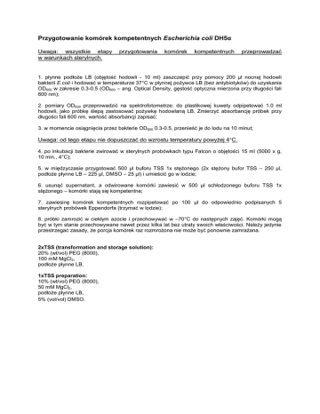 Przygotowanie komórek kompetentnych Escherichia coli DH5α Uwaga: wszystkie etapy w warunkach sterylnych. przygotowania komórek kompetentnych przeprowadzać 1. płynne podłoże LB (objętość hodowli - 10 ml) zaszczepić przy pomocy 200 µl nocnej hodowli bakterii E.coli i hodować w temperaturze 37°C w płynnej pożywce LB (bez antybiotyków) do uzyskania OD600 w zakresie 0.3-0.5 (OD600 – ang. Optical Density, gęstość optyczna mierzona przy długości fali 600 nm); 2. pomiary OD600 przeprowadzić na spektrofotometrze: do plastikowej kuwety odpipetować 1.0 ml hodowli, jako próbkę ślepą zastosować pożywkę hodowlaną LB. Zmierzyć absorbancję próbek przy długości fali 600 nm, wartość absorbancji zapisać; 3. w momencie osiągnięcia przez bakterie OD600 0.3-0.5, przenieść je do lodu na 10 minut; Uwaga: od tego etapu nie dopuszczać do wzrostu temperatury powyżej 4°C. 4. po inkubacji bakterie zwirować w sterylnych probówkach typu Falcon o objętości 15 ml (5000 x g, 10 min., 4°C); 5. w międzyczasie przygotować 500 µl buforu TSS 1x stężonego (2x stężony bufor TSS – 250 µl, podłoże płynne LB – 225 µl, DMSO – 25 µl) i umieścić go w lodzie; 6. usunąć supernatant, a odwirowane komórki zawiesić w 500 µl schłodzonego buforu TSS 1x stężonego – komórki stają się kompetentne; 7. zawiesinę komórek kompetentnych rozpipetować po 100 µl do odpowiednio podpisanych 5 sterylnych probówek Eppendorfa (trzymać w lodzie); 8. próbki zamrozić w ciekłym azocie i przechowywać w –70°C do następnych zajęć. Komórki mogą być w tym stanie przechowywane nawet przez kilka lat bez utraty swoich właściwości. Należy jedynie przestrzegać zasady, że porcja komórek raz rozmrożona nie może być ponownie zamrażana. 2xTSS (transformation and storage solution): 20% (wt/vol) PEG (8000), 100 mM MgCl2, podłoże płynne LB. 1xTSS preparation: 10% (wt/vol) PEG (8000), 50 mM MgCl2, podłoże płynne LB, 5% (vol/vol) DMSO.