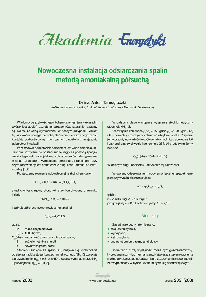 Akademia Nowoczesna instalacja odsiarczania spalin metodą amoniakalną półsuchą Dr inż. Antoni Tarnogrodzki Politechnika Warszawska, Instytut Techniki Lotniczej i Mechaniki Stosowanej Wiadomo, że szybkość reakcji chemicznej jest tym większa, im wyższy jest stopień rozdrobnienia reagentów, naturalnie, reagenty są dobrze ze sobą wymieszane. W naszym przypadku wzrost tej szybkości pociąga za sobą skrócenie nieodzownego czasu kontaktu sorbent-spaliny i tym samym umożliwia zmniejszenie gabarytów instalacji. W zastosowanej metodzie sorbentem jest woda amoniakalna. Jest ona rozpylana do postaci suchej mgły za pomocą specjalnie do tego celu zaprojektowanych atomizerów. Następnie ma miejsce turbulentne wymienianie sorbentu ze spalinami, przy czym zapewniony jest dostatecznie długi czas kontaktu sorbent-spaliny [1,2]. Przytaczamy równanie odpowiedniej reakcji chemicznej W dalszym ciągu występuje wyłącznie stechiometryczny stosunek NH3 i S. Obowiązuje zależność ρNQN = ρQ, gdzie ρN =1,29 kg/m3, QN i Q – normalny i rzeczywisty strumień objętości spalin. Przyjmujemy przeciętne wartości współczynnika nadmiaru powietrza 1,6 i wartości opałowej węgla kamiennego 23 MJ/kg, wtedy możemy napisać QN(m3n/h) = 10,44 B (kg/h) W dalszym ciągu będziemy korzystać z tej zależności. Wywołany odparowaniem wody amoniakalnej spadek temperatury wyraża się następująco 2NH3 + H2O + SO2 = (NH4)2 SO3 ∆T = rρwQw / cpρNQN skąd wynika wagowy stosunek stechiometryczny amoniaku i siarki 2MNNH3 / MS = 1,0625 gdzie: r = 2260 kJ/kg, cp = 1 kJ/kgK; przyjmujemy s = 0,01 i otrzymujemy ∆T = 7,1K. i zużycie 25-procentowej wody amoniakalnej Atomizery ρwQw = 4,25 Bs gdzie: M – masa cząsteczkowa, ρw = 1000 kg/m3, Qw(l/h) – wydajność atomizera lub atomizerów, B – zużycie nośnika energii, s – zawartość palnej siarki. Stopień usunięcia ze spalin SO2 nazywa się sprawnością odsiarczania. Dla stosunku stechiometrycznego NH3 i S uzyskuje się przynajmniej ηSO2 = 0,8; przy 50-procentowym nadmiarze NH3 – przynajmniej ηSO2 = 0,9 [3]. marzec 2008 Zasadnicze cechy atomizera to: stopień rozpylenia, wydajność, kąt rozpylenia, zasięg strumienia rozpylanej cieczy. Atomizer o dużej wydajności może być: gazodynamiczny, hydrodynamiczny lub mechaniczny. Najwyższy stopień rozpylenia można uzyskać za pomocą atomizera gazodynamicznego. Atomizer wyposażony w dysze Lavala nazywa się naddźwiękowym. www.energetyka.eu strona 209 (208) a) 5 4 5 1 2 4 3 b) 1 2 3 Rys. 2. Rysunek konstrukcyjny atomizera o zderzających się strumieniach o dużym zasięgu, oznaczenia 1 5 4 2 3 d) c) Rys. 1. Atomizer o zderzających się strumieniach o dużym kącie rozpylenia: a) rysunek konstrukcyjny, b) wizualizacja wypływu z dyszy atomizera, c) i d) widoki mgły w płaszczyźnie symetrii i płaszczyźnie atomizera; 1 i 2 – końcówki wody amoniakalnej i sprężonego powietrza, 3 – pokrywa komory atomizera, 4 – rurka o średnicy zewnętrznej 2,5 mm, 5 – dwustopniowa dysza Lavala; komora atomizera może być usytuowana na ściance reaktora odsiarczającego, kanału spalin lub elektrofiltra W omawianej instalacji stosuje się dwa typy atomizerów naddźwiękowych [4,5]: o zderzających się strumieniach, z tym że występują dwie wersje, mianowicie, o dużym kącie rozpylenia (rys. 1) i o dużym zasięgu (rys. 2); wynalazek ten jest stosowany głównie w ogrodnictwie szklarniowym i ochronie powietrza, w roku 1981 został wyróżniony w Konkursie Mistrza Techniki; 1) o strumieniach współosiowych (rys. 3), wynalazek stosowany jest od dawna w ochronie powietrza1); cechuje się dużym zasięgiem. Między innymi w Hucie Katowice, w elektrowni Szczecin-Pomorzany; ostatnio – jako wytwornica mgły został wykorzystany w systemie gaśniczym Telesto. strona 210 (209) Rys. 3. Rysunek konstrukcyjny atomizera o strumieniach współosiowych; 1 – jeden z dwóch wlotów wody amoniakalnej, 2 – wlot sprężonego powietrza, 3 – wewnętrzna pierścieniowa dysza Lavala, 4 – pierścieniowa szczelina wodna o szerokości 0,5 mm, 5 – zewnętrzna pierścieniowa dysza Lavala o wypływie ze składową prędkości dośrodkową Wprowadzamy stosunek strumieni masy wody amoniakalnej i sprężonego powietrza2) β = ρwQw / ρsprQspr przy czym: β = 0,9–1,1 i niższe wartości odpowiadają atomizerowi o dużym kącie rozpylenia, wyższe – atomizerom o dużym zasięgu; ρspr = 1,2 kg/m3, Qspr(m2/h) – wydajność sprężarki. Przyjmujemy β = 1 i atomizer o zderzających się strumieniach projektujemy na wydajność 100–150 l/h, o strumieniach współosiowych na 150–300 l/h; nadciśnienie przed atomizerem wynosi 0,25–0,35 MPa. 2) W elektrowni Połaniec do tego celu zastosowano zamiast sprężonego powietrza przegrzaną parę wodną. www.energetyka.eu marzec 2008 Reaktor o dużej średnicy3) Reaktor o małej średnicy Korzystamy z rysunku 6 i tabeli 2. Przyjmujemy: v = 1,5 m/s, s = 0,01, temperaturę 130°C i dobieramy atomizery. Korzystamy z rysunków 4 i 5 oraz tabeli 1. Na podstawie badań eksploatacyjnych wiadomo, że czas przebywania spalin w reaktorze wynosi 5 s. Przez D i h oznaczamy średnicę i wysokość reaktora, v – prędkość spalin, przyjmujemy s = 0,007 i dwie wartości temperatury, we wszystkich omawianych przypadkach stosujemy jeden atomizer o zderzających się strumieniach o dużym kącie rozpylenia zaprojektowany na Qw=100 l/h, wydajność sprężarki 83 m3/h. 2 3 1 1 Rys. 4. Zaprojektowana przez autora instalacja w Zakładach Piwowarskich w Warce (1995) Rys. 6. Schemat części dolotowej reaktora o dużej średnicy 2 1 – spaliny, 2 – ulownica, 3 – pokrywa z atomizerem o zderzających się strumieniach o dużym zasięgu lub z atomizerem o strumieniach współosiowych Przykłady reaktora o dużej średnicy 1 Rys. 5. Schemat części dolotowej reaktora o małej średnicy 1 – spaliny, 2 – pokrywa z atomizerem o zderzających się strumieniach o duż