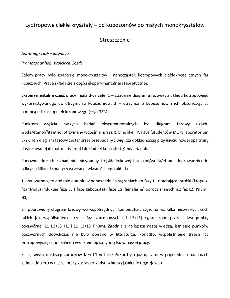 Lyotropowe ciekłe kryształy – od kubozomów do małych monokryształów Streszczenie Autor mgr Larisa latypova Promotor dr hab. Wojciech Góźdź Celem pracy było zbadanie monokryształów i nanocząstek liotropowych ciekłokrystalicznych faz kubicznych. Praca składa się z części eksperymentalnej i teoretycznej. Eksperymentalna część pracy miała dwa cele: 1 – zbadanie diagramu fazowego układu liotropowego wykorzystywanego do otrzymania kubozomów, 2 – otrzymanie kubozomów i ich obserwacja za pomocą mikroskopu elektronowego (cryo-TEM). Punktem wyjścia naszych badań eksperymentalnych był diagram fazowy układu woda/etanol/fitantriol otrzymany wcześniej przez R. Sheshkę i P. Faye (studentów M1 w laboratorium LPS). Ten diagram fazowy został przez przebadany z większa dokładnością przy użyciu nowej aparatury dostosowanej do automatycznej i dokładnej kontroli stężenia etanolu. Ponowne dokładne zbadanie mieszaniny trójskładnikowej fitantriol/woda/etanol doprowadziło do odkrycia kilku nieznanych wcześniej własności tego układu: 1 - zauważono, że dodanie etanolu w odpowiednich stężeniach do fazy L1 otaczającej próbki (kropelki fitantriolu) indukuje fazę L3 ( fazę gąbczastą) i fazę Lα (lamelarną) oprócz znanych już faz L2, Pn3m i H1; 2 - poprawiony diagram fazowy we współrzędnych temperatura-stężenie ma kilka niezwykłych cech takich jak współistnienie trzech faz izotropowych (L1+L2+L3) ograniczone przez dwa punkty poczwórne (L1+L2+L3+H1 i L1+L2+L3+Pn3m). Zgodnie z najlepszą naszą wiedzą, istnienie punktów poczwórnych dotychczas nie było opisane w literaturze. Ponadto, współistnienie trzech faz izotropowych jest unikalnym wynikiem opisanym tylko w naszej pracy; 3 - zjawisko nukleacji zarodków fazy L1 w fazie Pn3m było już opisane w poprzednich badaniach jednak dopiero w naszej pracy zostało przedstawine wyjaśnienie tego zjawiska; 4 - sekwencja przejść fazowych Pn3m+L1 – L3+L1 – L2+L1 – L1+L2 zostałą odkryta po raz pierwszy. Próbowaliśmy także opracować nowy sposób otrzymywania zawiesiny nanocząstek ciekłokrystalicznej fazy Pn3m. Naszym celem było przygotowanie kubozomów w bardziej kontrolowany sposób niż to miało miejsce we wszystkich znanych metodach stosowanych wcześniej. Niestety, nasza próba otrzymania nanocząstek fazy ciekłokrystalicznej bez użycia stabilizatora nie powiodła się: zgodnie z oczekiwaniami nanocząstki zostały otrzymane ale zawiesina nanocząstek była niestabilna: nanocząstki fazy Pn3m szybko sklejały się ze sobą. Doszliśmy do wniosku że rola stabilizatora była kluczowa w przygotowaniu kubozomów. Naszym głównym celem było zbadanie struktury kubozomów, przygotowaliśmy je metodą ultradźwiękową. Uzyskaliśmy wiele dobrze ukształtowanych nanocząstek fazy Pn3m o dobrze zorganizowanej strukturze wewnętrznej. Mniejsze cząstki mają zazwyczaj kształt kulisty, podczas te o większych rozmiarach są wielościenne. Część teoretyczna pracy była poświęcona geometrii i stabilności struktury ścianek monokryształów oraz nanocząstek fazy Pn3m otaczonych fazą izotropową. W szczególności zbadano strukturę ścianek utworzonych na kropelkach fazy Pn3m. Obliczenia przeprowadzone zostały w oparciu o model Landaua-Brazovskiego z jednym skalarnym parametrem porządku związanym z lokalnym stężeniem wody. Obliczenia wykonane dla nieskończenie dużych ścianek zbudowanych z identycznych elementów. Takie przybliżenie bardzo dobrze opisuje strukturę monokryształów lub powierzchni międzyfazowych. Obliczenia wykonane w ciągłym modelu Landaua-Brazovskiego pozwoliły na dokładne określenie struktury dwuciągłej fazy ciełokrystalicznej współistniejącej z fazą izotropową. W modelu ciągłym znacznie łatwiej jest badać ścianki utworzone w różnych kierunkach, ponieważ struktura sieci nie musi być wzięta pod uwagę. Ponadto, zmiana krzywizny dwuwarstwy przy powierzchni międzyfazowej może być uwzględniona. Otrzymaliśmy również małe kubozomy przez minimalizację funkcjonalu Landaua-Brazovskiego. Rozmiar kubozomów otrzymanych w wyniku modelowania matematycznego był mniejszy niż rozmiar kubozomów obserwowanych przy pomocy cryo-TEM. Pomimo małych rozmiarów struktury te mogą być przydatne dla zrozumenia wewnętrznej struktury kanałów wewnątrz nanocząstek zwłaszcza w warstwie zbliżonej do ścianki. Zobserwowano kubozomy o tej samej symetrii, zbliżonym kształcie jednak o różnej strukturze wewnętrznej. Te kubozomy mają cztery otwarte kanały na jednej ściance. Bez wiedzy o ich strukturze wewnętrznej można błednie przypuszczać, że one są takie same. Ale w rzeczywistości każdy kubozom różni się od innych kubozomów.