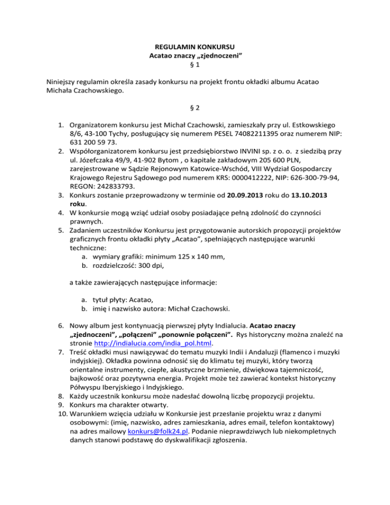 REGULAMIN KONKURSU Acatao znaczy „zjednoczeni” §1 Niniejszy regulamin określa zasady konkursu na projekt frontu okładki albumu Acatao Michała Czachowskiego. §2 1. Organizatorem konkursu jest Michał Czachowski, zamieszkały przy ul. Estkowskiego 8/6, 43-100 Tychy, posługujący się numerem PESEL 74082211395 oraz numerem NIP: 631 200 59 73. 2. Współorganizatorem konkursu jest przedsiębiorstwo INVINI sp. z o. o. z siedzibą przy ul. Józefczaka 49/9, 41-902 Bytom , o kapitale zakładowym 205 600 PLN, zarejestrowane w Sądzie Rejonowym Katowice-Wschód, VIII Wydział Gospodarczy Krajowego Rejestru Sądowego pod numerem KRS: 0000412222, NIP: 626-300-79-94, REGON: 242833793. 3. Konkurs zostanie przeprowadzony w terminie od 20.09.2013 roku do 13.10.2013 roku. 4. W konkursie mogą wziąć udział osoby posiadające pełną zdolność do czynności prawnych. 5. Zadaniem uczestników Konkursu jest przygotowanie autorskich propozycji projektów graficznych frontu okładki płyty „Acatao”, spełniających następujące warunki techniczne: a. wymiary grafiki: minimum 125 x 140 mm, b. rozdzielczość: 300 dpi, a także zawierających następujące informacje: a. tytuł płyty: Acatao, b. imię i nazwisko autora: Michał Czachowski. 6. Nowy album jest kontynuacją pierwszej płyty Indialucia. Acatao znaczy „zjednoczeni”, „połączeni” „ponownie połączeni”. Rys historyczny można znaleźć na stronie http://indialucia.com/india_pol.html. 7. Treść okładki musi nawiązywać do tematu muzyki Indii i Andaluzji (flamenco i muzyki indyjskiej). Okładka powinna odnosić się do klimatu tej muzyki, który tworzą orientalne instrumenty, ciepłe, akustyczne brzmienie, dźwiękowa tajemniczość, bajkowość oraz pozytywna energia. Projekt może też zawierać kontekst historyczny Półwyspu Iberyjskiego i Indyjskiego. 8. Każdy uczestnik konkursu może nadesłać dowolną liczbę propozycji projektu. 9. Konkurs ma charakter otwarty. 10. Warunkiem wzięcia udziału w Konkursie jest przesłanie projektu wraz z danymi osobowymi: (imię, nazwisko, adres zamieszkania, adres email, telefon kontaktowy) na adres mailowy [email protected]. Podanie nieprawdziwych lub niekompletnych danych stanowi podstawę do dyskwalifikacji zgłoszenia. 11. Prace do oceny należy przesyłać w formacie pliku PDF o objętości nie przekraczającym 1 MB. Projekty nadesłane przez Uczestników Konkursu nie podlegają zwrotowi. 12. Zwycięzca udostępni swój projekt w formacie produkcyjnym TIFF, AI lub EPS. §3 1. Uczestnik, zgłaszając swój projekt do konkursu, wyraża zgodę na jego rozpowszechnianie i zwielokrotnianie poprzez jego prezentację w mediach i kanałach promocyjnych będących własnością lub wykorzystywanych przez Organizatora i Współorganizatora konkursu, a także współpracujących z nimi patronów medialnych. 2. Uczestnik konkursu oświadcza, iż przysługują mu prawa autorskie i autorskie prawa majątkowe do wykonanego projektu, które nie zostały w żaden sposób ograniczone ani zbyte na rzecz żadnej osoby trzeciej. Za wszelkie roszczenia osób trzecich z tytułu naruszenia ich praw odpowiada Uczestnik konkursu. 3. Zwycięzca konkursu przekaże Organizatorowi autorskie prawa majątkowe do: a. utrwalania i zwielokrotniania oryginału lub kopii przygotowanego projektu techniką drukarską na opakowaniach płyty Acatao, a także do wprowadzania do obrotu projektu wraz z egzemplarzami tej płyty, b. utrwalania i zwielokrotniania oryginału lub kopii przygotowanego projektu w sposób elektroniczny, a także wprowadzania do obrotu powstałych w ten sposób egzemplarzy projektu wraz z elektroniczną wersją płyty Acatao, c. rozpowszechniania przygotowanego projektu na drukowanych i elektronicznych materiałach reklamowych promujących płytę Acatao oraz działalność artystyczną Organizatora, a także do utrwalania i zwielokrotniania tego projektu w zakresie niezbędnym do przygotowania tych materiałów. §4 1. Zwycięzcą konkursu zostanie jedna osoba, której projekt zostanie uznany za najlepszy. 2. Nagrodzony projekt zostanie wybrany przez specjalnie powołane jury pod przewodnictwem Organizatora. Skład jury jest niejawny do czasu zakończenia konkursu, zostanie on ujawniony w momencie ogłoszenia zwycięzcy. 3. Wszelkie decyzje dotyczące przebiegu Konkursu podejmuje jury konkursu. Decyzje jury są ostateczne. 4. Zwycięzca konkursu otrzyma nagrodę pieniężną ufundowaną przez Organizatora w wysokości 1 000 PLN brutto (kwota zawiera wszelkie obowiązujące podatki) wypłaconą na podstawie umowy oraz 6 płyt z wydawnictwa CM Records. 5. Niepodpisanie umowy jest jednoznaczne z rezygnacją z nagrody. 6. Nagrodą dodatkową, ufundowaną przez Współorganizatora konkursu jest miesięczna emisja banera reklamowego na stronie głównej portalu Folk24 oraz moduł reklamowy o wymiarach 1/4 strony w jednym z wydań Magazynu Folk24 (nagrodę należy odebrać do końca lutego 2014). 7. Rozstrzygnięcie Konkursu oraz wskazanie zwycięzców nastąpi najpóźniej do 15.10.2013 na stronach internetowych http://cmrecords.eu oraz http://www.folk24.pl. 8. O wynikach Konkursu zwycięzca zostanie powiadomiony drogą mailową w terminie 7 dni od daty rozstrzygnięcia konkursu. §5 1. Organizator zastrzega sobie prawo do pozostawienia konkursu bez rozstrzygnięcia w przypadku niskiego poziomu artystycznego nadesłanych prac. §6 1. Regulamin dostępny jest na stronach internetowych http://cmrecords.eu oraz http://www.folk24.pl. 2. Wzięcie udziału w konkursie jest równoznaczne z akceptacją niniejszego regulaminu. §7 1. Uczestnik konkursu wyraża zgodę na zbieranie i przetwarzanie podanych przez niego danych osobowych przez Organizatora i Współorganizatora w sposób niezbędny do przeprowadzenia konkursu (zgodnie z ustawą z dnia 29 sierpnia 1997 roku o ochronie danych osobowych (tekst jednolity Dz. U. z 2002 r., Nr 101 poz. 926 ze zm.) 2. Wszelkie spory dotyczące niniejszego regula