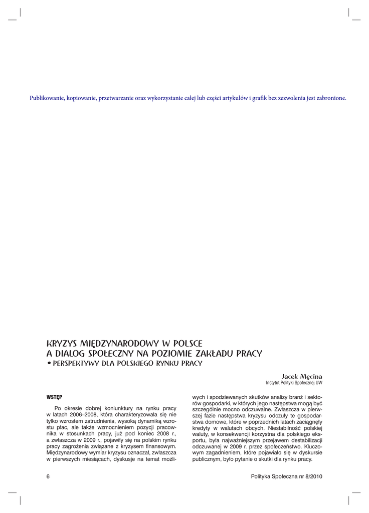 Publikowanie, kopiowanie, przetwarzanie oraz wykorzystanie całej lub części artykułów i grafik bez zezwolenia jest zabronione. KRYZYS MIĘDZYNARODOWY W POLSCE A DIALOG SPOŁECZNY NA POZIOMIE ZAKŁADU PRACY • PERSPEKTYWY DLA POLSKIEGO RYNKU PRACY Jacek Męcina Instytut Polityki Społecznej UW WSTĘP Po okresie dobrej koniunktury na rynku pracy w latach 2006–2008, która charakteryzowała się nie tylko wzrostem zatrudnienia, wysoką dynamiką wzrostu płac, ale także wzmocnieniem pozycji pracownika w stosunkach pracy, już pod koniec 2008 r., a zwłaszcza w 2009 r., pojawiły się na polskim rynku pracy zagrożenia związane z kryzysem finansowym. Międzynarodowy wymiar kryzysu oznaczał, zwłaszcza w pierwszych miesiącach, dyskusje na temat możli6 wych i spodziewanych skutków analizy branż i sektorów gospodarki, w których jego następstwa mogą być szczególnie mocno odczuwalne. Zwłaszcza w pierwszej fazie następstwa kryzysu odczuły te gospodarstwa domowe, które w poprzednich latach zaciągnęły kredyty w walutach obcych. Niestabilność polskiej waluty, w konsekwencji korzystna dla polskiego eksportu, była najważniejszym przejawem destabilizacji odczuwanej w 2009 r. przez społeczeństwo. Kluczowym zagadnieniem, które pojawiało się w dyskursie publicznym, było pytanie o skutki dla rynku pracy. Polityka Społeczna nr 8/2010 Po doświadczeniach recesji początku lat 90. oraz skutków tzw. kryzysu rosyjskiego (1999–2003) obawa przed ponownym wzrostem bezrobocia była chyba największym zagrożeniem identyfikowanym przez większość społeczeństwa. Zarówno starsi pracownicy odczuwający mocniej zagrożenie utratą pracy, jak i młodzież, głównie absolwenci obawiający się o bariery startu zawodowego, najszybciej odczuli skutki spowolnienia gospodarki i zmniejszającą się liczbę ofert pracy. JAKA POLITYKA SPOŁECZNA I GOSPODARCZA NA CZAS KRYZYSU? – DYLEMATY I REKOMENDACJE Jakie podejście do polityki budżetowej i priorytetów interwencji państwa należy stosować w warunkach kryzysu? Pomagać firmom, w tym sektorowi bankowemu, czy koncentrować uwagę na ochronie miejsc pracy? Zwiększać wydatki socjalne, czy koncentrować uwagę na aktywnej polityce rynku pracy? To rzeczywiste pytania i dylematy, które w warunkach kryzysu nabierają szczególnego znaczenia i były obecne w 2009 r. także w polskiej debacie publicznej. Po pierwsze, trudności, które mogą przeżywać niektóre branże, mają w zdecydowanej masie charakter przejściowy. Należy zatem zastosować takie instrumenty, w tym z zakresu prawa pracy, które pozwolą przetrwać ten niekorzystny okres. Już dzisiaj dowiadujemy się o efektywnym dialogu na poziomie zakładu pracy w wielu firmach, które na skutek spadku zapotrzebowania na ich produkcję porozumiały się w sprawie zawieszenia niektórych uprawnień pracowniczych1. Po drugie, jeśli kryzys ujawni trwałe problemy strukturalne, konieczna jest szybka restrukturyzacja, która nie zawsze musi oznaczać duże zwolnienia grupowe. Należy przede wszystkim postawić na dobrą diagnozę i znaleźć instrumenty, które zniwelują trudności i dadzą podstawy do odbudowy przewag konkurencyjnych firmy. Ogromne znaczenie mają w takich przypadkach porozumienia na poziomie zakładu pracy oraz współdziałanie z władzami lokalnymi, zwłaszcza urzędami pracy2. Dialog społeczny na poziomie zakładu pracy oraz umiejętność zawierania kompromisów i współdziałania będzie decydował o sytuacji firm i potencjale rozwojowym w warunkach ponownego ożywienia. Po trzecie wreszcie, każde potencjalne nawet zagrożenie powinno zostać odpowiednio wcześniej zidentyfikowane i na taką okoliczność powinien być opracowany plan awaryjny. Należy pamiętać, że w prawie pracy każde działanie wymaga czasu, dlatego trzeba być nastawionym na współdziałanie z organizacjami związkowymi w zakresie kształtowania zakładowych źródeł prawa lub przygotować alternatywne rozwiązania w zakresie kształtowania treści stosunków pracy. Każda zmiana w stosunkach pracy i organizacji pracy wymaga uwzględnienia czynnika ludzkiego. Stąd ogromna rola informacji i konsultacji, dbania o dobry klimat organizacyjny i umiejętność zarządzania zmianą3. Kryzys w wymiarze globalnym może oznaczać redukcje zatrudnienia i wzrost bezrobocia. Jawi się zatem pytanie o skalę i trwałość problemów rynku pracy. Polska w okresie transformacji przeżyła już dwa bolesne kryzysy wewnętrzne, które miały, niestety, bardzo dotkliwe skutki dla rynku pracy, a bezrobocie w niektórych okresach osiągało stopę ponad 20% Polityka Społeczna nr 8/2010 (Szylko-Skoczny 2004, s. 25 i n.). Podkreślić jednak należy zdecydowanie inny charakter poprzednich kryzysów rynku pracy. W latach 1990–1993 polska gospodarka charakteryzowała się przerostami zatrudnienia w przedsiębiorstwach państwowych, a redukcje zatrudnienia w formie zwolnień grupowych były przede wszystkim formą jego racjonalizacji, choć niska konkurencyjność przedsiębiorstw była także czynnikiem wpływającym na rozmiary zwolnień grupowych (Kryńska 1999, s. 32 i n.). Wydaje się, że recesja gospodarcza spowodowana wieloma czynnikami okresu pierwszych lat transformacji miała wyjątkowo niekorzystny i na szczęście „niepowtarzalny charakter”. Lata 1999–2003, zwane także w literaturze kryzysem rosyjskim, miały już bardziej międzynarodowy, w sensie regionalnym, charakter. Zapaść polskiej gospodarki była efektem dekoniunktury i niskiej konkurencyjności polskich firm, ale wysokie bezrobocie było też związane z wchodzeniem na rynek pracy wyżu demograficznego i dużą skalą bezrobocia młodzieży na rynku pracy. Nałożyły się na to także niekorzystne czynniki wewnętrzne, zwłaszcza zagrożenie kryzysem finansów publicznych (MGiP 2006). Kryzys międzynarodowy ma zgoła inne cechy, jego skala w wymiarze międzynarodowym, zwłaszcza jeśli idzie o niektóre branże, w