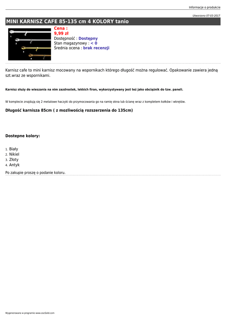 Informacje o produkcie Utworzono 07-03-2017 MINI KARNISZ CAFE 85-135 cm 4 KOLORY tanio Cena : 9,99 zł Dostępność : Dostępny Stan magazynowy : < 0 Średnia ocena : brak recenzji Karnisz cafe to mini karnisz mocowany na wspornikach którego długość można regulować. Opakowanie zawiera jedną szt.wraz ze wspornikami. Karnisz służy do wieszania na nim zazdrostek, lekkich firan, wykorzystywany jest też jako obciążnik do tzw. paneli. W komplecie znajdują się 2 metalowe haczyki do przymocowania go na ramię okna lub ścianę wraz z kompletem kołków i wkrętów. Długość karnisza 85cm ( z mozliwością rozszerzenia do 135cm) Dostepne kolory: 1. 2. 3. 4. Biały Nikiel Złoty Antyk Po zakupie proszę o podanie koloru. Wygenerowano w programie www.oscGold.com