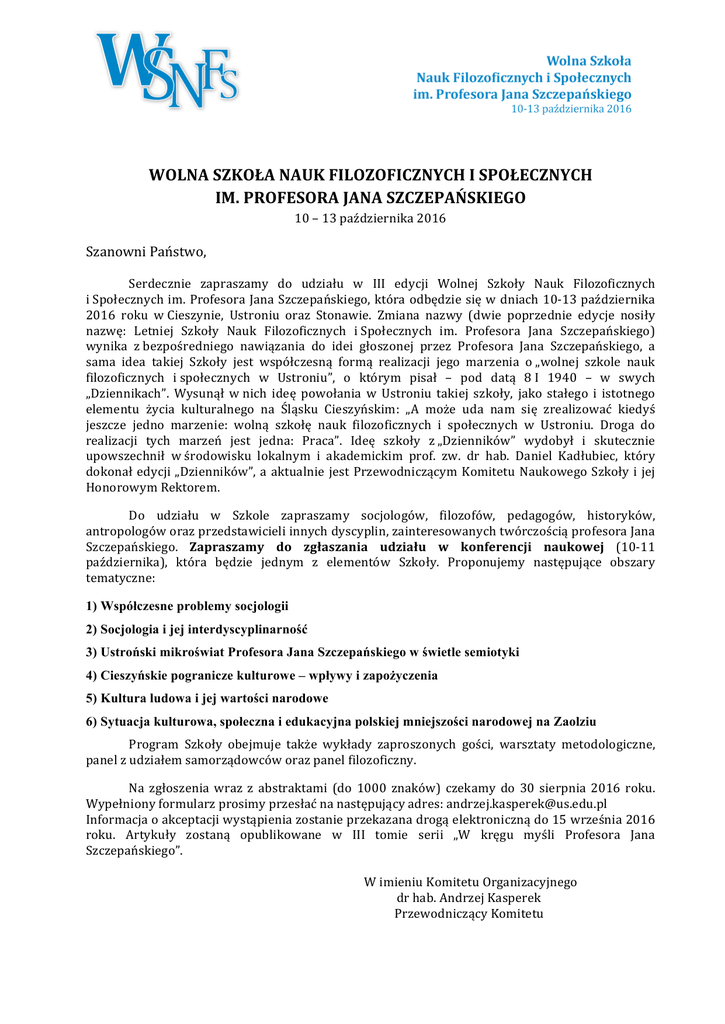 WOLNASZKOŁANAUKFILOZOFICZNYCHISPOŁECZNYCH IM.PROFESORAJANASZCZEPAŃSKIEGO 10–13października2016 SzanowniPaństwo, Serdecznie zapraszamy do udziału w III edycji Wolnej Szkoły Nauk Filozoficznych iSpołecznychim.ProfesoraJanaSzczepańskiego,któraodbędziesięwdniach10-13października 2016 roku wCieszynie, Ustroniu oraz Stonawie. Zmiana nazwy (dwie poprzednie edycje nosiły nazwę: Letniej Szkoły Nauk Filozoficznych iSpołecznych im. Profesora Jana Szczepańskiego) wynika zbezpośredniego nawiązania do idei głoszonej przez Profesora Jana Szczepańskiego, a sama idea takiej Szkoły jest współczesną formą realizacji jego marzenia o„wolnej szkole nauk filozoficznych ispołecznych w Ustroniu”, o którym pisał – pod datą 8I 1940 – w swych „Dziennikach”. Wysunął wnich ideę powołania w Ustroniu takiej szkoły, jako stałego i istotnego elementu życia kulturalnego na Śląsku Cieszyńskim: „A może uda nam się zrealizować kiedyś jeszcze jedno marzenie: wolną szkołę nauk filozoficznych i społecznych w Ustroniu. Droga do realizacji tych marzeń jest jedna: Praca”. Ideę szkoły z„Dzienników” wydobył i skutecznie upowszechnił wśrodowisku lokalnym i akademickim prof. zw. dr hab. Daniel Kadłubiec, który dokonał edycji „Dzienników”, a aktualnie jest Przewodniczącym Komitetu Naukowego Szkoły i jej HonorowymRektorem. Do udziału w Szkole zapraszamy socjologów, filozofów, pedagogów, historyków, antropologóworazprzedstawicieliinnychdyscyplin,zainteresowanychtwórczościąprofesoraJana Szczepańskiego. Zapraszamy do zgłaszania udziału w konferencji naukowej (10-11 października), która będzie jednym z elementów Szkoły. Proponujemy następujące obszary tematyczne: 1) Współczesne problemy socjologii 2) Socjologia i jej interdyscyplinarność 3) Ustroński mikroświat Profesora Jana Szczepańskiego w świetle semiotyki 4) Cieszyńskie pogranicze kulturowe – wpływy i zapożyczenia 5) Kultura ludowa i jej wartości narodowe 6) Sytuacja kulturowa, społeczna i edukacyjna polskiej mniejszości narodowej na Zaolziu Program Szkoły obejmuje także wykłady zaproszonych gości, warsztaty metodologiczne, panelzudziałemsamorządowcóworazpanelfilozoficzny. Na zgłoszenia wraz z abstraktami (do 1000 znaków) czekamy do 30 sierpnia 2016 roku. Wypełnionyformularzprosimyprzesłaćnanastępującyadres:[email protected] Informacjaoakceptacjiwystąpieniazostanieprzekazanadrogąelektronicznądo15września2016 roku. Artykuły zostaną opublikowane w III tomie serii „W kręgu myśli Profesora Jana Szczepańskiego”. WimieniuKomitetuOrganizacyjnego drhab.AndrzejKasperek PrzewodniczącyKomitetu Organizator PowiatCieszyński MiastoCieszyn MiastoUstroń UniwersytetŚląskiwKatowicach,Wydział EtnologiiiNaukoEdukacjiwCieszynie UniwersytetŁódzki,WydziałEkonomicznoSocjologiczny CentrumPedagogicznedlaPolskiegoSzkolnictwa NarodowościowegowCzeskimCieszynie StowarzyszenieSamorządoweZiemiCieszyńskiej StowarzyszenieWspieraniaEdukacji Międzykulturowej PatronatHonorowy ArturSzczepański JerzyBuzek –posełdoParlamentuEuropejskiego JanOlbrycht –posełdoParlamentuEuropejskiego JanuszKról–StarostaPowiatuCieszyńskiego RyszardMacura–BurmistrzMiastaCieszyna IreneuszSzarzec–BurmistrzMiastaUstroń prof.zw.drhab.WiesławBanyś –JMRektorUniwersytetuŚląskiegowKatowicach prof.drhab.AndrzejKowalczyk –JMRektorUniwersytetuŁódzkiego prof.zw.drhab.WłodzimierzNykiel –PrzewodniczącyStowarzyszeniaWspierania EdukacjiMiędzykulturowej prof.zw.drhab.JerzyNikitorowicz Patronat KomitetNaukFilozoficznychPAN KomitetNaukPedagogicznychPAN KomitetNaukSocjologicznychPAN PolskieTowarzystwoFilozoficzneOddziałw Cieszynie PolskieTowarzystwoPedagogiczneOddziałw CieszynieiwUstroniu PolskieTowarzystwoSocjologiczneOddziałw Łodzi KongresPolakówwRepubliceCzeskiej KomitetNaukowy prof.zw.drhab.DanielKadłubiec –przewodniczący prof.MargaretS.Archer prof.drhab.PiotrGutowski drhab.prof.ATHEwaJurczyńska-McCluskey drhab.prof.UŚDariuszKubok prof.zw.drhab.TadeuszLewowicki prof.zw.drhab.WładysławMarkiewicz prof.zw.drhab.AndrzejRadziewicz-Winnicki drhab.prof.UŁPawełStarosta prof.zw.drhab.BogusławŚliwerski prof.zw.drhab.WojciechŚwiątkiewicz prof.zw.drhab.WiesławTheiss prof.drhab.inż.KarolWęglarzy drhab.prof.UKSWKrzysztofWielecki KomitetOrganizacyjny drhab.AndrzejKasperek –przewodniczący prof.drhab.ZenonGajdzica drhab.prof.UŚEwaOgrodzka-Mazur drhab.BogusławDziadzia drhab.MarekRembierz drhab.AnnaSzafrańska-Gajdzica drJózefSzymeczek mgrPiotrGruchel mgrMartaKmeť mgrDanutaKoenig mgrStanisławKubicius mgrHenrykPieszka SekretarzeLSNFiS mgrEdytaDiakowska-Kohut –przewodnicząca drMagdalenaBełza mgrMagdalenaSzadkowska Kontakt: Bieżąceinformacjeoorganizowanejkonferencji będądostępnenastronieinternetowej: http://szkolaszczepanskiego.ustron.pl/ Adresdokorespondencji: WolnaSzkołaNaukFilozoficznychiSpołecznych im.Prof.JanaSzczepańskiego drhab.AndrzejKasperek ul.Bielska62, 43-400Cieszyn KARTAZGŁOSZENIA Imięinazwisko:…………………………………………………………........................................................................................... Tytułlubstopieńnaukowy:…………………………………………………………………………………………………….……. Instytucja:…………………………………………………………………………………………………………………………………… Adresdokorespondencji:…………………………………………………………………………………………………………….. Telefon:……………...………………........................................................ e-mail:…………….………………………................................................. Tematwystąpienia:………………………………………………………………………………………………………………