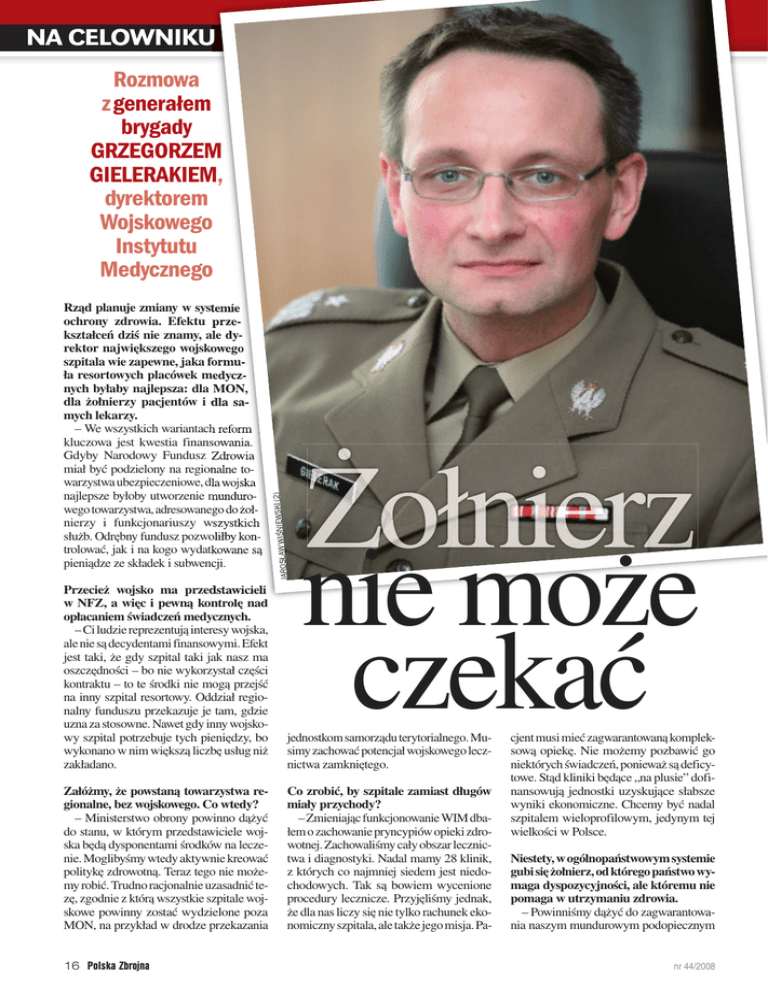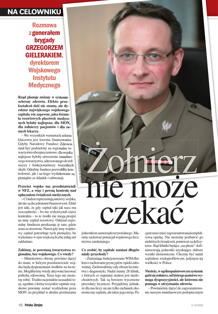 AAAAAAA NA CELOWNIKU AAAAAAAA JAROSŁAW WIŚN Rząd planuje zmiany w systemie ochrony zdrowia. Efektu przekształceń dziś nie znamy, ale dyrektor największego wojskowego szpitala wie zapewne, jaka formuła resortowych placówek medycznych byłaby najlepsza: dla MON, dla żołnierzy pacjentów i dla samych lekarzy. – We wszystkich wariantach reform kluczowa jest kwestia finansowania. Gdyby Narodowy Fundusz Zdrowia miał być podzielony na regionalne towarzystwa ubezpieczeniowe, dla wojska najlepsze byłoby utworzenie mundurowego towarzystwa, adresowanego do żołnierzy i funkcjonariuszy wszystkich służb. Odrębny fundusz pozwoliłby kontrolować, jak i na kogo wydatkowane są pieniądze ze składek i subwencji. IEWSKI (2) Rozmowa z generałem brygady GRZEGORZEM GIELERAKIEM, dyrektorem Wojskowego Instytutu Medycznego Żołnierz nie może czekać Przecież wojsko ma przedstawicieli w NFZ, a więc i pewną kontrolę nad opłacaniem świadczeń medycznych. – Ci ludzie reprezentują interesy wojska, ale nie są decydentami finansowymi. Efekt jest taki, że gdy szpital taki jak nasz ma oszczędności – bo nie wykorzystał części kontraktu – to te środki nie mogą przejść na inny szpital resortowy. Oddział regionalny funduszu przekazuje je tam, gdzie uzna za stosowne. Nawet gdy inny wojskowy szpital potrzebuje tych pieniędzy, bo wykonano w nim większą liczbę usług niż zakładano. jednostkom samorządu terytorialnego. Musimy zachować potencjał wojskowego lecznictwa zamkniętego. Załóżmy, że powstaną towarzystwa regionalne, bez wojskowego. Co wtedy? – Ministerstwo obrony powinno dążyć do stanu, w którym przedstawiciele wojska będą dysponentami środków na leczenie. Moglibyśmy wtedy aktywnie kreować politykę zdrowotną. Teraz tego nie możemy robić. Trudno racjonalnie uzasadnić tezę, zgodnie z którą wszystkie szpitale wojskowe powinny zostać wydzielone poza MON, na przykład w drodze przekazania Co zrobić, by szpitale zamiast długów miały przychody? – Zmieniając funkcjonowanie WIM dbałem o zachowanie pryncypiów opieki zdrowotnej. Zachowaliśmy cały obszar lecznictwa i diagnostyki. Nadal mamy 28 klinik, z których co najmniej siedem jest niedochodowych. Tak są bowiem wycenione procedury lecznicze. Przyjęliśmy jednak, że dla nas liczy się nie tylko rachunek ekonomiczny szpitala, ale także jego misja. Pa- 16 Polska Zbrojna cjent musi mieć zagwarantowaną kompleksową opiekę. Nie możemy pozbawić go niektórych świadczeń, ponieważ są deficytowe. Stąd kliniki będące „na plusie” dofinansowują jednostki uzyskujące słabsze wyniki ekonomiczne. Chcemy być nadal szpitalem wieloprofilowym, jedynym tej wielkości w Polsce. Niestety, w ogólnopaństwowym systemie gubi się żołnierz, od którego państwo wymaga dyspozycyjności, ale któremu nie pomaga w utrzymaniu zdrowia. – Powinniśmy dążyć do zagwarantowania naszym mundurowym podopiecznym nr 44/2008 || || | | || | | || | | || || | ZAPIS FORUM ZAPIS FORUM NA NA CELOWNIKU CELOWNIKU WOJSKO KULISY PORADY PORADY PO SŁUŻBIE PO SŁUŻBIE HISTORIAHISTORIA MILITARIAMILITARIA ŚWIAT PRASA PRASA KULISY ŚWIAT TO I OWO łatwiejszego dostępu do usług medycznych. Nowelizacja ustawy pragmatycznej uczyniła już wyłom w odniesieniu do weteranów misji – oni mogą korzystać z pomocy medycznej poza kolejnością. na ponad dwa lata poza wojskiem i już do niego nie wróci – kilkaset tysięcy dolarów wydanych na jego szkolenie będzie straconych. Nie wspominam już o konsekwencjach zdrowotnych. Ale nadal sytuacja żołnierzy w służbie czynnej nie jest satysfakcjonująca! – Niestety, to prawda. Jeśli szukamy argumentów, które pomogą zwiększyć liczbę rekrutów, to obok wynagrodzenia i kwatery powinniśmy zachęcać do wstępowania do wojska właśnie pakietem socjalnym, którego atutem musi być dobra opieka zdrowotna. Zwłaszcza jeśli dorzucimy do tego zapewnienie opieki rodzinom żołnierzy w służbie czynnej. W interesie wojska jest więc szybkie zajęcie się pacjentem żołnierzem. Czy to wymaga zmiany statusu szpitali wojskowych? – Wystarczy zmienić status pacjentów wojskowych. Oni muszą stać się – wiem, że to niepopularne określenie – grupą uprzywilejowaną. Jako wykonawcy polityki zagranicznej państwa w niebezpiecznych misjach zasługują na to. Poświęcają swoje życie i zdrowie. Taka postawa zawsze powinna skutkować adekwatną reakcją – troską ze strony państwa. Ten postulat nie ma nic wspólnego z tworzeniem przywilejów: każdy Polak miał, ma lub będzie miał szanse wybrać zawód wojskowego. Nie sądzi Pan, że wystarczy podwyższyć uposażenia, aby znaleźli się rekruci? – Obecnie argument finansowy dla 20–30-latków nie jest już najważniejszy. Zyskały na znaczeniu społeczne wartościowanie pracy, systemy opieki socjalnej nad pracownikiem i jego rodziną, często spotykane w armiach naszych sojuszników. Lepszy dostęp do opieki medycznej wynika ze specyfiki zawodu – żołnierz musi być stale w dobrej formie fizycznej, a jeśli ją utraci, powinien ją szybko odzyskać. To się opłaca. Często koszty świadczeń wypłacanych kontuzjowanemu żołnierzowi przewyższają koszty operacji i rehabilitacji. Żołnierz musi mieć także pewność, że jeśli coś mu się stanie na polu walki czy na poligonie, zajmie się nim fachowo wojskowa służba zdrowia i zrobi wszystko, by przeżył. Wtedy będzie lepiej wypełniał obowiązki. I jeszcze jedno. Tak jak nie powinien się martwić o siebie, także nie może martwić się o bliskich. Musi mieć pewność, że jego rodzina również będzie miała najlepszą z możliwych opiekę medyczną. Jak to zorganizować? Tworzyć osobne okienka dla pacjentów mundurowych czy domagać się rozwiązań formalnoprawnych? – Zapisy ustawowe są niezbędne, bo służba zdrowia działa, opierając się na kilku ustawach. I tu mamy paradoks: ustawa o zakładach opieki zdrowotnej wprowadz