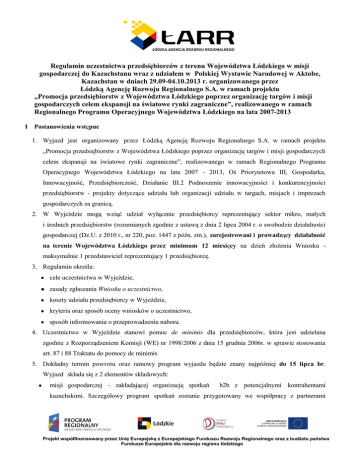 Regulamin uczestnictwa przedsiębiorców z terenu Województwa Łódzkiego w misji gospodarczej do Kazachstanu wraz z udziałem w Polskiej Wystawie Narodowej w Aktobe, Kazachstan w dniach 29.09-04.10.2013 r. organizowanego przez Łódzką Agencję Rozwoju Regionalnego S.A. w ramach projektu „Promocja przedsiębiorstw z Województwa Łódzkiego poprzez organizację targów i misji gospodarczych celem ekspansji na światowe rynki zagraniczne”, realizowanego w ramach Regionalnego Programu Operacyjnego Województwa Łódzkiego na lata 2007-2013 I Postanowienia wstępne 1. Wyjazd jest organizowany przez Łódzką Agencję Rozwoju Regionalnego S.A. w ramach projektu „Promocja przedsiębiorstw z Województwa Łódzkiego poprzez organizację targów i misji gospodarczych celem ekspansji na światowe rynki zagraniczne”, realizowanego w ramach Regionalnego Programu Operacyjnego Województwa Łódzkiego na lata 2007 - 2013, Oś Priorytetowa III, Gospodarka, Innowacyjność, Przedsiębiorczość, Działanie III.2 Podnoszenie innowacyjności i konkurencyjności przedsiębiorstw - projekty dotyczące udziału lub organizacji udziału w targach, misjach i imprezach gospodarczych za granicą. 2. W Wyjeździe mogą wziąć udział wyłącznie przedsiębiorcy reprezentujący sektor mikro, małych i średnich przedsiębiorstw (rozumianych zgodnie z ustawą z dnia 2 lipca 2004 r. o swobodzie działalności gospodarczej (Dz.U. z 2010 r., nr 220, poz. 1447 z późn. zm.), zarejestrowani i prowadzący działalność na terenie Województwa Łódzkiego przez minimum 12 miesięcy na dzień złożenia Wniosku maksymalnie 1 przedstawiciel reprezentujący 1 przedsiębiorcę. 3. Regulamin określa: cele uczestnictwa w Wyjeździe, zasady zgłaszania Wniosku o uczestnictwo, koszty udziału przedsiębiorcy w Wyjeździe, kryteria oraz sposób oceny wniosków o uczestnictwo, sposób informowania o przeprowadzeniu naboru. 4. Uczestnictwo w Wyjeździe stanowi pomoc de minimis dla przedsiębiorców, która jest udzielana zgodnie z Rozporządzeniem Komisji (WE) nr 1998/2006 z dnia 15 grudnia 2006r. w sprawie stosowania art. 87 i 88 Traktatu do pomocy de minimis 5. Dokładny termin powrotu oraz ramowy program wyjazdu będzie znany najpóźniej do 15 lipca br. Wyjazd składa się z 2 elementów składowych: misji gospodarczej – zakładającej organizację spotkań b2b z potencjalnymi kontrahentami kazachskimi. Szczegółowy program spotkań zostanie przygotowany we współpracy z partnerami Projekt współfinansowany przez Unię Europejską z Europejskiego Funduszu Rozwoju Regionalnego oraz z budżetu państwa Fundusze Europejskie dla rozwoju regionu łódzkiego wyjazdu. udziału w Polskiej Wystawie Narodowej w Aktobe, Kazachstan. II Cele uczestnictwa w Wyjeździe Celem uczestnictwa w Wyjeździe jest prezentacja i promocja potencjału gospodarczego firm Województwa Łódzkiego oraz nawiązanie kontaktów handlowych z partnerami zagranicznymi. III Zasady zgłaszania Wniosku o uczestnictwo 1. Przedsiębiorca składa Formularz zgłoszeniowy wraz z wymaganymi załącznikami. 2. Wzór Formularza zgłoszeniowego stanowi Załącznik nr 1 do niniejszego Regulaminu. Formularz zgłoszeniowy należy składać do 8 lipca 2013 r., do godz. 15:00 osobiście, na adres email: [email protected], pocztą tradycyjną, przesyłką kurierską pod adresem: Łódzka Agencja Rozwoju Regionalnego S.A. Departament Doradztwa dla Biznesu i Sektora Publicznego ul. Tuwima 22/26, 90-002 Łódź wraz z dopiskiem: „Polska Wystawa Narodowa w Aktobe” IV Kryteria oraz sposób oceny Wniosków o uczestnictwo 1. Do udziału w Wyjeździe zostanie zakwalifikowanych 5 przedsiębiorstw. ŁARR S.A. zastrzega sobie prawo do zwiększenia bądź zmniejszenia liczby uczestników Wyjazdu. 2. W przypadku wpłynięcia większej ilości formularzy zgłoszeniowych, do oceny kwalifikowalności przedsiębiorcy powołana zostanie Komisja Oceniająca, która dokona szczegółowej analizy zgłoszonych Formularzy zgodnie z kryteriami wyboru stanowiącymi załącznik nr 4 do niniejszego Regulaminu. 3. W Wyjeździe może wziąć udział maksymalnie 1 przedstawiciel reprezentujący 1 przedsiębiorcę. Przedsiębiorca może wydelegować dodatkowego przedstawiciela na własny koszt. 4. Z każdym zakwalifikowanym przedsiębiorcą biorącym udział w Wyjeździe zawierana jest umowa o dofinansowanie jego udziału w Wyjeździe. Wzór umowy stanowi Załącznik nr 2 do niniejszego Regulaminu. Projekt współfinansowany przez Unię Europejską z Europejskiego Funduszu Rozwoju Regionalnego oraz z budżetu państwa Fundusze Europejskie dla rozwoju regionu łódzkiego V Koszt udziału przedsiębiorców w Wyjeździe 1. Koszty uczestnictwa 1 przedsiębiorcy w Wyjeździe pokrywane przez ŁARR S.A. z budżetu na realizację projektu realizowanego w ramach Regionalnego Programu Operacyjnego Województwa Łódzkiego obejmują maksymalnie 50%: kosztu przelotu/przejazdu na trasie Warszawa – Aktobe – Warszawa dla 1 osoby; kosztu zakwaterowania w hotelu**** wskazanym przez ŁARR S.A. dla 1 osoby; kosztu przygotowania materiałów informacyjno-promocyjnych tj. wspólnego katalogu uczestników wyjazdu; kosztu zakupu powierzchni wystawienniczej 10 m2 dla jednego przedsiębiorcy; kosztu projektu i zabudowy standardowej stoiska zgodnie z ustaleniami zawartymi przez ŁARR S.A. z Organizatorem przypadającego proporcjonalnie na 1 Przedsiębiorcę; kosztu opłat targowych, wpisu do katalogu targowego, wejściówek, usług technicznych (sprzątanie); kosztu zapewnienia tłumaczenia podczas spotkań b2b; kosztu organizacji misji gospodarczej – spotkań b2b. 2. Ubezpieczenie osobowe, diety pobytowe, wyżywienie, koszt wyrobienia wizy, transportu materiałów Przedsiębiorcy, koszt dojazdu do/z Warszawy, oraz ewentualne inne koszty dodatkowe związane z uczestnictwem w Wyjeździe, Przedsiębiorcy pokrywają we własnym zakresie. 3. W przypadku rezygnacji z udziału w Wyjeździe w terminie późniejsz