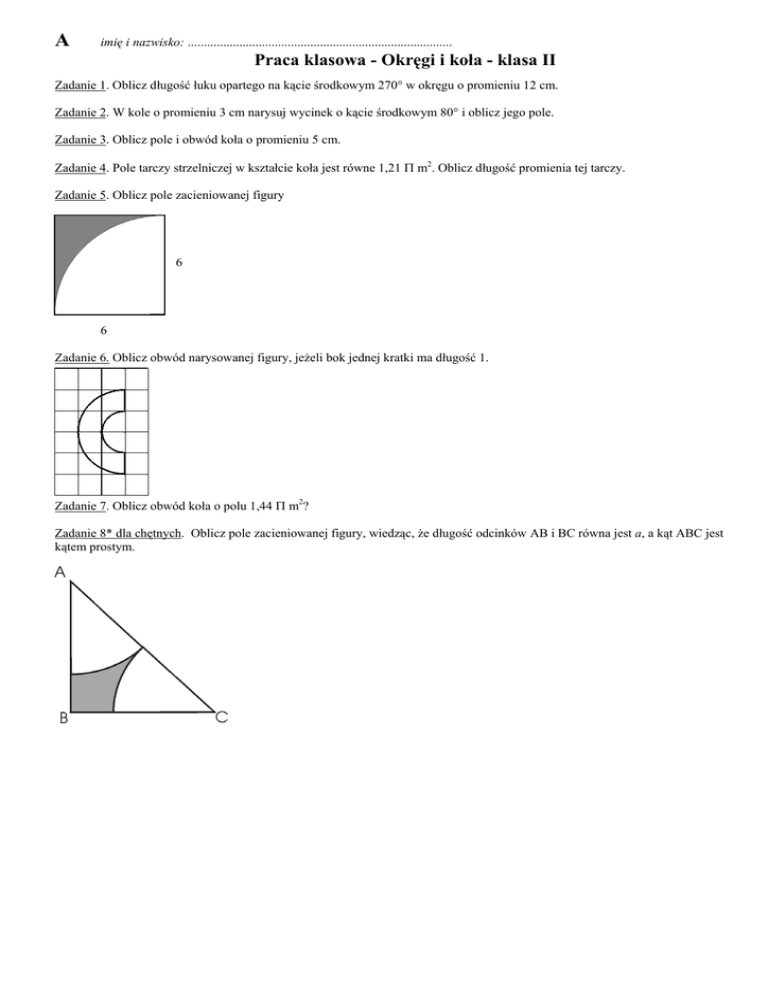 A imię i nazwisko: .................................................................................. Praca klasowa - Okręgi i koła - klasa II Zadanie 1. Oblicz długość łuku opartego na kącie środkowym 270° w okręgu o promieniu 12 cm. Zadanie 2. W kole o promieniu 3 cm narysuj wycinek o kącie środkowym 80° i oblicz jego pole. Zadanie 3. Oblicz pole i obwód koła o promieniu 5 cm. Zadanie 4. Pole tarczy strzelniczej w kształcie koła jest równe 1,21 Π m2. Oblicz długość promienia tej tarczy. Zadanie 5. Oblicz pole zacieniowanej figury 6 6 Zadanie 6. Oblicz obwód narysowanej figury, jeżeli bok jednej kratki ma długość 1. Zadanie 7. Oblicz obwód koła o polu 1,44 Π m2? Zadanie 8* dla chętnych. Oblicz pole zacieniowanej figury, wiedząc, że długość odcinków AB i BC równa jest a, a kąt ABC jest kątem prostym. B imię i nazwisko: .................................................................................. Praca klasowa - Okręgi i koła - klasa II Zadanie 1. Oblicz pole zacieniowanej figury 4 4 Zadanie 2. Oblicz obwód i pole koła o promieniu 3 cm. Zadanie 3. Oblicz obwód narysowanej figury, jeżeli bok jednej kratki ma długość 1. Zadanie 4. Oblicz długość łuku opartego na kącie środkowym 210° w okręgu o promieniu 12 cm. Zadanie 5. Oblicz obwód koła o polu 1,21 Π m2? Zadanie 6. Pole tarczy strzelniczej w kształcie koła jest równe 1,44 Π m2. Oblicz długość promienia tej tarczy. Zadanie 7. W kole o promieniu 4 cm narysuj wycinek o kącie środkowym 270° i oblicz jego pole. Zadanie 8* dla chętnych. Oblicz pole zacieniowanej figury, wiedząc, że długość odcinków AB i BC równa jest a, a kąt ABC jest kątem prostym.