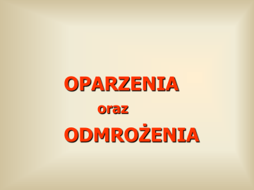 OPARZENIA oraz ODMROŻENIA OPARZENIA Oparzeniem (combustio) nazywamy miejscowe uszkodzenie tkanek spowodowane działaniem czynnika termicznego bądź chemicznego. Przyczyną oparzeń termicznych mogą być: otwarty płomień, gorące płyny i ciała stałe łuk i prąd elektryczny Przyczyną oparzeń chemicznych są różnorodne związki chemiczne z grupy stężonych: kwasów, zasad soli oraz fosfor. OPARZENIA Rozległe i głębokie oparzenie jest jest jednym z najcięższych uszkodzeń ustroju. Uraz oparzeniowy : to nie tylko uszkodzenie skóry i głębiej leżących tkanek, lecz również proporcjonalne do rozległości oparzenia zaburzenie funkcji wszystkich narządów i układów ustroju określane jako choroba oparzeniowa. Na liczbę przypadków oparzeń mają wpływ: technizacja życia zwiększenie liczby osób po 60 roku życia niedostateczna opieka nad dziećmi katastrofy akty terroryzmu działania wojenne OPARZENIA Leczenie rozległych oparzeń jest trudne i bardzo kosztowne, wymaga ścisłej współpracy: chirurga, anestezjologa i traumatologa. W skład zespołu leczącego powinni wchodzić także: rehabilitant, endokrynolog, mikrobiolog, dietetyk i psycholog. O skutecznym leczeniu ciężko oparzonego chorego. decyduje możliwie szybkie rozpoczęcie postępowania przeciwwstrząsowego (zapobiegającego oligowolemii i niedotlenieniu tkanek) oraz właściwe postępowanie miejscowe odpowiednie do rodzaju uszkodzeń ciała OPARZENIA Chory z oparzeniem wymaga indywidualnego planu leczenia uwzględniające odmienne dla każdego przypadku parametry: wiek (gorsze rokowanie > 60 lat) głębokość oparzenia głębokie rozległość ponad 40% lokalizacja oparzenia powierzchni ciała współistnienie oparzenia dróg oddechowych zatrucie Co i innymi gazami współistniejące inne uszkodzenia ciała (w warunkach pokojowych u ok. 2% hospitalizowanych) przebyte choroby zawód zakres i rodzaj pierwszej pomocy udzielonej na miejscu wypadku doświadczenie i możliwości ośrodka leczącego oparzenia GŁĘBOKOŚĆ OPARZENIA Głębokość oparzenia wpływa na przebieg kliniczny choroby. Ocena głębokości oparzenia bezpośrednio po urazie może być trudna, a w niektórych przypadkach niemożliwa. Zmiany mikroskopowe w oparzeniu charakteryzują się głównie martwicą skrzepową. Strefy rany oparzeniowej wg. Jacksona W zależności od wysokości temperatury, czynnika parzącego i czasu działania wyróżnia się 3 kolejne strefy rany oparzeniowej: strefa koagulacji-całkowite zatrzymanie przepływu włośniczkowego z nieodwracalnymi zmianami tkankowymi. strefa zastoju - charakteryzuje się zwolnionym przepływem krwi w naczyniach włosowatych, może wystąpić bezpośrednio po urazie lub znacznie później, można zapobiec rozprzestrzenianiu się oparzenia przeciwdziałając odwodnieniu, zmianom zakrzepowym i dodatkowym urazom. Tkanki w tej strefie nie ulegają jednak martwicy skrzepowej. strefa przekrwienia- stanowi odczyn zapalny zdrowej tkanki reagującej na uraz. GŁĘBOKOŚĆ OPARZENIA Oparzenie I stopnia : Obejmuje tylko naskórek. Uszkodzenia tkankowe są niewielkie. Objawia się jako zaczerwienienie i niewielki obrzęk skóry. Zaczerwienienie blednie przy ucisku. Głównym objawem jest ból ustępujący po 2-3 dniach. Gojenie rany trwa z reguły 5-10 dni, zwykle nie pozostawia blizny. Przyczyny: naświetlenie słoneczne, krótki kontakt z gorącą wodą. Oparzenia II stopnia powierzchowne: Obejmuje całą grubość naskórka i część skóry właściwej. Widoczne zaczerwienienie i pęcherze oparzonej powierzchni. Jeśli nie ma objawów zakażenia rany zmiany goją się w ciągu 10-14 dni, pozostawiając niewielkie blizny. Oparzenia II stopnia głębokie : Obejmuje naskórek i skórę właściwą bez przydatków skóry (gruczołów potowych i mieszków włosowych). Może przypominać wyglądem oparzenie III stopnia. Skóra ma zwykle barwę czerwoną lub różową, nie blednie przy ucisku. Gojenie w ciągu 25-30 dni. Często pozostają rozległe i twarde blizny. Jeżeli rozwinie się zakażenie powoduje ono pogłębienie się ran do III stopnia oparzenia. GŁĘBOKOŚĆ OPARZENIA Oparzenie III stopnia : Dochodzi do zniszczenia całej grubości skóry wraz z receptorami bólowymi (rana niebolesna). Charakteryzuje się twardą skórzastą powierzchnią o zabarwieniu brunatnym, brązowym, czarnym, białym a czasami nawet czerwonym. Przy ucisku powierzchnia skóry nie blednie i naczynia nie wypełniają się krwią, ponieważ są zniszczone lub zaczopowane skrzeplinami. Oparzona tkanka jest martwa. Oparzenie IV - wyróżniane przez niektórych autorów, odpowiada zwęgleniu tkanek w oparzeniu III. W praktyce klinicznej stosuje się często podział uproszczony wyróżniając: oparzenia pośredniej grubości, które goją się samoistnie. oparzenia pełnej grubości skóry i tkanek głębiej leżących, które po usunięciu tkanek martwiczych wymagają pokrycia ran wolnymi przeszczepami skórnymi lub różnego rodzaju płatami tkankowymi. GŁĘBOKOŚĆ OPARZENIA PODZIAŁ OPARZEŃ (wg. American Burn Association) Hospitalizacja jest niezbędna w przypadku oparzeń II st. przekraczających 10% powierzchni ciała, we wszystkich przypadkach oparzeń III st. oraz oparzeń twarzy, oczu, uszu, rąk, stóp i krocza. Oparzenia lekkie: oparzenie II st. u dorosłych obejmujące mniej niż 15% pow.ciała oparzenie II st. u dzieci obejmujące mniej niż 10% pow. ciała oparzenie III st. obejmujące mniej niż 2% pow. ciała Oparzenia średnie: oparzenie II st. u dorosłych obejmujące 15% -25% pow.ciała oparzenie II st. u dzieci obejmujące 10%-20% pow. ciała oparzenie III st. obejmujące 2%-10% pow. ciała PODZIAŁ OPARZEŃ (wg. American Burn Association) Oparzenia ciężkie: oparzenie II st. u dorosłych obejmujące ponad 25% pow.ciała oparzenie II st. u dzieci obejmujące ponad 20% pow. ciała oparzenie III st. obejmujące ponad 10% pow. ciała oparzenia obejmujące w znaczący sposób ręce, twarz, ocz