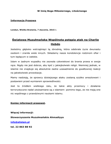 W Imię Boga Miłosiernego, Litościwego Informacja Prasowa Londyn, Wielka Brytania, 7 stycznia, 2015 r. Światowa Muzułmańska Wspólnota potępia atak na Charlie Hebdo Jesteśmy głęboko wstrząśnięci tą zbrodnią, która odebrała Ŝycie dwunastu osobom i zraniła wiele innych. Składamy nasze kondolencje rodzinom ofiar i tym będącym w Ŝałobie. Islam w Ŝadnym wypadku nie zezwala człowiekowi do brania prawa w swoje ręce. Nigdy nie jest dobrze, aby kpić z jakiejkolwiek religii. Niemniej jednak, w islamie nie znajduje się absolutnie Ŝadne uzasadnienie do gwałtownej reakcji na jakiekolwiek prowokacje. Mamy nadzieję, Ŝe sprawcy dzisiejszego ataku zostaną szybko aresztowani i postawieni przed wymiarem sprawiedliwości. Jest to źródłem wielkiego Ŝalu, Ŝe takie akty przemocy i działania terrorystyczne nadal utoŜsamiane są z islamem- pomimo tego, Ŝe nie mają one nic wspólnego z prawdziwymi naukami islamu. Koniec informacji prasowej. Więcej informacji: Stowarzyszenie Muzułmańskie Ahmadiyya [email protected] tel. 22 863 88 92