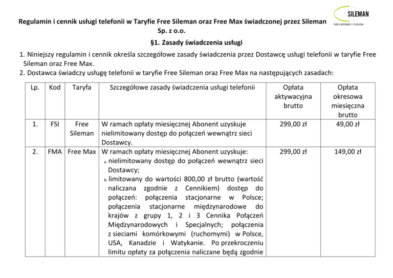 Regulamin i cennik FREE SILEMAN i FREE MAX