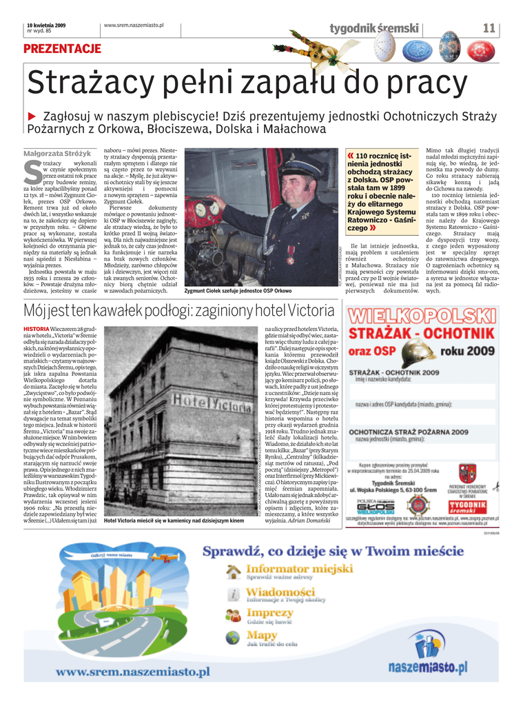 10 kwietnia 2009 nr wyd. 85 www.srem.naszemiasto.pl 11 tygodnik śremski PREZENTACJE Strażacy pełni zapału do pracy b Zagłosuj w naszym plebiscycie! Dziś prezentujemy jednostki Ochotniczych Straży Pożarnych z Orkowa, Błociszewa, Dolska i Małachowa S trażacy wykonali w czynie społecznym przez ostatni rok prace przy budowie remizy, za które zapłacilibyśmy ponad 12 tys. zł – mówi Zygmunt Ciołek, prezes OSP Orkowo. Remont trwa już od około dwóch lat, i wszystko wskazuje na to, że zakończy się dopiero w przyszłym roku. – Główne prace są wykonane, została wykończeniówka. W pierwszej kolejności do otrzymania pieniędzy na materiały są jednak nasi sąsiedzi z Niesłabina – wyjaśnia prezes. Jednostka powstała w maju 1935 roku i zrzesza 29 członków. – Powstaje drużyna młodzieżowa, jesteśmy w czasie naboru – mówi prezes. Niestety strażacy dysponują przestarzałym sprzętem i dlatego nie są często przez to wzywani na akcje. – Myślę, że już aktywni ochotnicy stali by się jeszcze aktywniejsi i pomocni z nowym sprzętem – zapewnia Zygmunt Ciołek. Pierwsze dokumenty mówiące o powstaniu jednostki OSP w Błociszewie zaginęły, ale strażacy wiedzą, że było to krótko przed II wojną światową. Dla nich najważniejsze jest jednak to, że cały czas jednostka funkcjonuje i nie narzeka na brak nowych członków. Młodzieży, zarówno chłopców jak i dziewczyn, jest więcej niż tak zwanych seniorów. Ochotnicy biorą chętnie udział w zawodach pożarniczych. « 110 rocznicę istnienia jednostki obchodzą strażacy z Dolska. OSP powstała tam w 1899 roku i obecnie należy do elitarnego Krajowego Systemu Ratowniczo - Gaśniczego » FOT.JAROSŁAWPODSIADŁY Małgorzata Stróżyk Zygmunt Ciołek szefuje jednostce OSP Orkowo Ile lat istnieje jednostka, mają problem z ustaleniem również ochotnicy z Małachowa. Strażacy nie mają pewności czy powstała przed czy po II wojnie światowej, ponieważ nie ma już pierwszych dokumentów. Mimo tak długiej tradycji nadal młodzi mężczyźni zapisują się, bo wiedzą, że jednostka ma powody do dumy. Co roku strażacy zabierają sikawkę konną i jadą do Cichowa na zawody. 110 rocznicę istnienia jednostki obchodzą natomiast strażacy z Dolska. OSP powstała tam w 1899 roku i obecnie należy do Krajowego Systemu Ratowniczo - Gaśniczego. Strażacy mają do dyspozycji trzy wozy, z czego jeden wyposażony jest w specjalny sprzęt do ratownictwa drogowego. O zagrożeniach ochotnicy są informowani dzięki sms-om, a syrena w jednostce włączana jest za pomocą fal radiowych. HISTORIA Wieczorem28grudniawhotelu„Victoria”wŚremie odbyłasięnaradadziałaczypolskich,naktórejwysłannicyopowiedzieli o wydarzeniach poznańskich–czytamywnajnowszychDziejachŚremu,opistego, jak iskra zapalna Powstania Wielkopolskiego dotarła do miasta. Zaczęło się w hotelu „Zwycięstwo”, co było podwójnie symboliczne. W Poznaniu wybuchpowstaniarównieżwiązał się z hotelem - „Bazar”. Stąd dywagacje na temat symboliki tego miejsca. Jednak w historii Śremu „Victoria” ma swoje zasłużonemiejsce.Wnimbowiem odbywały się wcześniej patriotycznewiecemieszkańcówpróbujących dać odpór Prusakom, starającym się narzucić swoje prawa. Opis jednego z nich znaleźliśmywwarszawskimTygodniku Ilustrowanym z początku ubiegłego wieku. Włodzimierz Prawdzic, tak opisywał w nim wydarzenia wczesnej jesieni 1906 roku: „Na przeszłą niedziele zapowiedziany był wiec wŚremie(...)Udałemsiętamijuż FOT.ARCH.ADRIAN DOMAŃSKI/TYGODNIK ILUSTROWANY Mójjesttenkawałekpodłogi:zaginionyhotelVictoria Hotel Victoria mieścił się w kamienicy nad dzisiejszym kinem naulicyprzedhotelemVictoria, gdziemiałsięodbyćwiec,zastałem więc tłumy ludu z całej parafii”.Dalejnastępujeopisspotkania któremu przewodził ksiądzOlszewskizDolska. Chodziłoonaukęreligiiwojczystym języku.Wiecprzerwałobserwujący go komisarz policji, po słowach, które padły z ust jednego z uczestników: „Dzieje nam się krzywda! Krzywda przeciwko której protestujemy i protestować będziemy!”. Następny raz historia wspomina o hotelu przy okazji wydarzeń grudnia 1918 roku. Trudno jednak znaleźć ślady lokalizacji hotelu. Wiadomo, że działało ich sto lat temukilka:„Bazar”(przyStarym Rynku), „Centralny” (kilkadziesiąt metrów od ratusza), „Pod pocztą” (dzisiejszy „Metropol”) orazInterfirmol(przyMickiewicza).Ohistorycznymzapisyipamięć śremian zapomniała. Udałonamsięjednakzdobyćarchiwalną gazetę z powyższym opisem i zdjęciem, które zamieszczamy, a które wszystko wyjaśnia. Adrian Domański 0241890/08