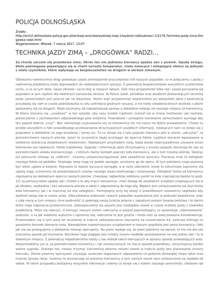 POLICJA DOLNOŚLĄSKA Źródło: http://arch2.dolnoslaska.policja.gov.pl/wr/kwp-wroclaw/wydzialy-kwp-1/wydzial-r/aktualnosci-1/2179,Technika-jazdy-zima-Dro gowka-radzi.html Wygenerowano: Wtorek, 7 marca 2017, 13:07 TECHNIKA JAZDY ZIMĄ – „DROGÓWKA” RADZI… Za chwilę zacznie się prawdziwa zima. Okres ten nie jednemu kierowcy spędza sen z powiek. Opady śniegu, błoto pośniegowe pojawiające się w chwili wzrostu temperatur, nisko świecące i oślepiające słońce są jednymi z wielu czynników, które wpływają na bezpieczeństwo na drogach w okresie zimowym. Oblodzona nawierzchnia drogi powoduje często zmniejszenie przyczepności kół naszych pojazdów, co w połączeniu z jazdą z nadmierną prędkością może doprowadzić do niebezpiecznych sytuacji. Z pewnością bezpieczeństwo wszystkich uczestników ruchu, a co za tym idzie, nasze zdrowie i życie leży w naszych rękach. Dziś chce przypomnieć kilka rad i zasad poruszania się pojazdem w tym ciężkim dla niektórych kierowców okresie. W Polsce szkół, ośrodków oraz akademii doskonalących technikę jazdy samochodem jest jeszcze jak na lekarstwo. Warto więc przypomnieć wspomniane już wskazówki jakie z pewnością przydadzą się nam w czasie podróżowania w celu uniknięcia groźnych sytuacji, a nie kiedy nieodwracalnych skutków z jakimi spotykamy się na drogach. Może zacznijmy od najważniejszej sprawy a dokładnie mówiąc od naszego miejsca za kierownicą. W fotelu staramy się „usadowić” w ten sposób, aby nasz środek ciężkości znalazł się w miarę możliwości jak najniżej, jednocześnie z zachowaniem odpowiedniego pola widzenia. Prawidłowe i umiejętne kierowanie samochodem wymaga aby ten pojazd dobrze „czuć”. Bez należytego usytuowania się za kierownicą nie ma szans na dobre prowadzenie. Chodzi tu przede wszystkim o fakt prawidłowego przetwarzania otrzymywanych wszelkich informacji, mówiących nam co dzieje się z pojazdem a dokładnie na jego przedniej i tylnej osi. To co dzieje się z tyłu pojazdu kierowca jest w stanie „odczytać” za pośrednictwem naszych pleców, jeżeli te oczywiście będą przylegać do oparcia fotela. Lędźwie staranie wpasowane w siedzenie dostarczą dodatkowych wiadomości. Najlepszym przykładem tutaj, będą wszak nieprzypadkowo używane przez kierowców aut rajdowych, fotele kubełkowe. Sygnały i informację jakie otrzymujemy z przodu pojazdu docierają do nas za pośrednictwem układu kierowniczego , z którym mamy kontakt poprzez koło kierownicy, ale o tym troszkę później. Siedząc już potocznie mówiąc za „kółkiem”, musimy ustawić/wyregulować dwa zasadnicze wymiary. Pierwszy krok to odległość naszego fotela od pedałów. Stawiając lewą nogę na pedale sprzęgła, wciskamy go do oporu. W tym położeniu noga powinna być lekko ugięta w kolanie. Poprawia to lepsze wyczucie sprzęgła, a w razie zderzenie, kiedy to odruchowo zaprzemy się ugiętą nogą, uchronimy od poważniejszych urazów naszego stawu biodrowego i kolanowego. Odległość fotela od kierownicy regulujemy po dokładnym oparciu naszych pleców, chwytając najbardziej oddalony punkt na kole (najczęściej będzie to godz. 12) za pomocą lekko ugiętej ręki. Chodzi o to aby kręcić kierownicą i mieć dostęp do wszelakich urządzeń znajdujących się w jej obrębie, swobodnie i bez odrywania pleców a także z odpowiednią do tego siłą. Błędem jest umiejscowienie się zbyt blisko koła kierownicy jak i w znacznej od niej odległości. Pamiętajmy przy tej okazji o prawidłowym ustawieniu zagłówka aby spełniał swoją rolę w czasie jazdy. Zdecydowana większość nowych pojazdów wyposażona jest w poduszki powietrzne, więc z całą mocą w tym miejscu chce podkreślić iż spełniają swoją funkcje jedynie z zapiętymi pasami bezpieczeństwa i to takimi które maja napinacze pirotechniczne. Zabezpieczenie się pasami jest niezbędne nawet w czasie krótkiej jazdy z niewielka prędkością. Może się zdarzyć, iż kierując naszym autem uderzymy w pojazd poprzedzający co spowoduje „zdetonowanie” poduszki, a ta jak wiadomo wybucha z ogromną siłą. Uderzenie to jest groźne i może nieś za sobą poważne konsekwencję. Przekonałem się o tym parę lat wcześniej w trakcie zabezpieczenia zdarzenia na autostradzie A4, podczas którego to pasażerka doznała złamania nosa. Niewątpliwie najważniejszym urządzeniem w naszym pojeździe jest sama kierownica i fakt jak nią się posługujemy a dokładnie mówiąc operujemy. Na pozór wydaje się, że jeżeli jedziemy na wprost, to nie ma dla nas znaczenia sposób jej trzymania. Wynikiem tego poglądu jest miedzy innymi niedbałe pozostawienie na niej jednej ręki i to w dowolnym miejscu. Z pewnością niejednokrotnie każdy z nas widział takich kierujących w opisany sposób prowadzących auto. Wspominaliśmy już iż, za pośrednictwem kierownicy i rąk umieszczonych na niej w sposób prawidłowy, otrzymujemy bardzo ważne sygnały. Dlatego też, należy trzymać kierownicę obiema rekami nawet w trakcie jazdy bez planowanej zmiany kierunku. Dłonie powinny spoczywać używając oznaczeń zegarowych odpowiednio na godzinie dziewiątej (lewa ręka) oraz trzeciej (prawa ręką). Godziny te wyznaczają oś pozioma kierownicy a tym samym nasze ręce umieszczone są najdalej od siebie. W takim przypadku dostajemy wszystkie informacje i wiemy co dzieje się z kołami naszego samochodu. Ułożenie rąk w inny sposób zaburza nasze „czytanie”, czyli odbiór tych bodźców. Po drugie to najłatwiej wówczas nam wykonać skręt, jak w jedną i w drugą stronę a następnie wrócić do pozycji wyjściowej oraz przy takim uchwycie po wyprostowaniu palców dotrzeć do znajdujących się w zasięgu przełączników i dźwigni. Pamiętajmy, że kierowca musi mieć swobodę swoich ruchów. Tutaj, można wspomnieć, iż w okresie zimowym ubranie nie może nas w jakikolwiek sposób ograniczać. 
