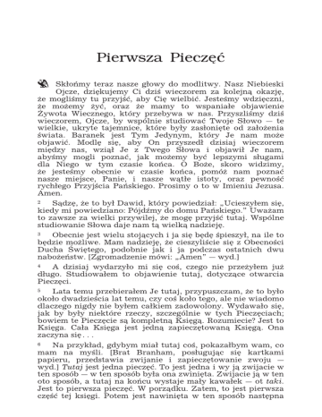 PIERWSZA PIECZ£Ø 115 Pierwsza Piecz¸ ` Sko§my teraz nasze gowy do modlitwy. Nasz Niebieski Ojcze, dzikujemy Ci dzi wieczorem za kolejn okazj, e moglimy tu przyjø, aby Ci wielbiø. Jestemy wdziczni, e moemy yø, oraz e mamy to wspaniae objawienie ywota Wiecznego, który przebywa w nas. Przyszlimy dzi wieczorem, Ojcze, by wspólnie studiowaø Twoje Sowo _ te wielkie, ukryte tajemnice, które byy zasonite od zaoenia wiata. Baranek jest Tym Jedynym, który Je nam moe objawiø. Modl si, aby On przyszed dzisiaj wieczorem midzy nas, wzi Je z Twego Sowa i objawi Je nam, abymy mogli poznaø, jak moemy byø lepszymi sugami dla Niego w tym czasie ko§ca. O Boe, skoro widzimy, e jestemy obecnie w czasie ko§ca, pomó nam poznaø nasze miejsce, Panie, i nasze wte istoty, oraz pewnoø rychego Przyjcia Pa§skiego. Prosimy o to w Imieniu Jezusa. Amen. Sdz, e to by Dawid, który powiedzia: Ucieszyem si, kiedy mi powiedziano: Pójdmy do domu Pa§skiego. Uwaam to zawsze za wielki przywilej, e mog przyjø tutaj. Wspólne studiowanie Sowa daje nam t wielk nadziej. Obecnie jest wielu stojcych i ja si bd pieszy, na ile to bdzie moliwe. Mam nadziej, e cieszylicie si z Obecnoci Ducha witego, podobnie jak i ja podczas ostatnich dwu naboe§stw. [Zgromadzenie mówi: Amen _ wyd.] A dzisiaj wydarzyo mi si co, czego nie przeyem ju dugo. Studiowaem to objawienie tutaj, dotyczce otwarcia Pieczci. Lata temu przebieraem Je tutaj, przypuszczam, e to byo okoo dwadziecia lat temu, czy co koo tego, ale nie wiadomo dlaczego nigdy nie byem cakiem zadowolony. Wydawao si, jak by byy niektóre rzeczy, szczególnie w tych Pieczciach; bowiem te Pieczcie s kompletn Ksig. Rozumiecie? Jest to Ksiga. Caa Ksiga jest jedn zapiecztowan Ksig. Ona zaczyna si^ Na przykad, gdybym mia tutaj co, pokazabym wam, co mam na myli. [Brat Branham, posugujc si kartkami papieru, przedstawia zwijanie i zapiecztowanie zwoju _ wyd.] Tutaj jest jedna pieczø. To jest jedna i wy j zwijacie w ten sposób _ w ten sposób bya ona zwinita. Zwijacie j w ten oto sposób, a tutaj na ko§cu wystaje may kawaek _ ot taki. Jest to pierwsza pieczø. W porzdku. Zatem, to jest pierwsza czø tej ksigi. Potem jest nawinita w ten sposób nastpna 116 OBJAWIENIE SIEDMIU PIECZ£CI pieczø, tu obok niej _ ona jest nawinita tak jak ta tutaj. A potem na ko§cu, wanie tutaj, wystaje nastpny kawaek, i to oznacza dwie pieczcie. W ten sposób zostaa napisana caa Biblia _ w zwojach. [Brat Branham rozwija kartki papieru, którymi posugiwa si podczas ilustracji _ wyd.] A zatem rozamanie tych Pieczci otwiera tajemnice tej Ksigi. Czy studiowalicie u Jeremiasza, jak on to zapisa? Wielu z was zanotowao to sobie ubiegego wieczora. W jaki sposób te pieczcie zostay napisane i umieszczone w ukryciu w celu przechowania, a on powróci po siedemdziesiciu latach z niewoli. On powróci i domaga si swojej posiadoci. Ja to naprawd lubi studiowaø. Nie moecie^ Jest rzecz niemoliw wyraziø To wszystko, bowiem to jest Wieczne Sowo. Jest to Wieczna Ksiga. Dlatego musimy po prostu poruszyø troch te najwaniejsze miejsca. Kiedy dzisiaj studiowaem, zanotowaem sobie wiele miejsc Pisma, abycie To mogli studiowaø. Tak samo kiedy bdziecie studiowaø tamy, zostanie wam wiele z Tego objawione. Jest tam zawarte tak wiele spraw! O gdybym tylko móg stanø tutaj na podium i odsoniø wam To w ten sposób, jak mi to zostao objawione tam w pokoju, moi drodzy, to by byo cudowne. Lecz kiedy czowiek przyjdzie tutaj, jest pod takim naciskiem i po prostu przeskakuje jako te sprawy, próbuje przynieø ludziom tylko t gówn czø, aby To mogli zrozumieø. Ja naturalnie doceniam t pie§, któr wanie zapiewa brat Ungren: W dó z Swojej Chway. Gdyby On nie zstpi z Swojej Chway, gdzie bymy wszyscy byli dzisiaj wieczorem? Jestemy zatem wdziczni, e On zstpi, aby nam pomóc. Zatem, kiedy tak wielu stoi, bdziemy si po prostu pieszyø, aby to przebraø _ jak najlepiej potrafimy. Ja nie mówi, e to bdziemy przebieraø w popiechu, ale mam na myli, e rozpoczniemy tak szybko, jak tylko bdzie moliwe. A zatem, otwórzmy teraz, potem co^ Przebieralimy ju 1. rozdzia, 2. 3. 4. a ubiegego wieczora 5. A dzisiaj wieczorem rozpoczynamy 6. rozdzia Objawienia. Kiedy teraz studiujemy ten rozdzia, powoujemy si na róne miejsca zarówno w Starym jak i w Nowym Testamencie, bowiem caa ta Ksiga jest objawieniem Jezusa Chrystusa. Rozumiecie? Wszystko to razem wzite jest objawieniem Pana Jezusa _ objawieniem Jezusa Chrystusa. Jest to Bóg, który objawia Samego Siebie w tej Ksidze _ objawiajcy si w Chrystusie w tej Ksidze. A Chrystus jest objawieniem Boga. On przyszed, aby objawiø Boga, bowiem On i Bóg to jedno i to samo. Bóg by w Chrystusie, jednajc wiat z Samym Sob. PIERWSZA PIECZ£Ø 117 Innymi sowy, wy bycie nigdy nie wiedzieli dokadnie, czym by Bóg, gdyby On nie objawi si w Chrystusie; teraz moecie to zrozumieø. Przed laty mylaem zazwyczaj, e Bóg byø moe gniewa si na mnie, ale Chrystus mnie umiowa. Stwierdziem jednak, e On jest t sam Osob. Chrystus jest samym sercem Boga. A zatem, kiedy to studiujemy, porównujemy to obecnie. Te pierwsze trzy rozdziay z Biblii _ z Ksigi Objawienia, które przetrzsalimy stosunkowo dokadnie, s wiekami kocioa _ siedmioma wiekami kocioa. Otó, jest Siedem Wieków Kocioa, Siedem Pieczci, Siedem Trb, oraz Czasze i te nieczyste duchy, podobne do ab, a wszystko to idzie razem w parze. Moi drodzy, jak bardzo chciabym mieø wielki kawa papieru i nakreliø to wszystko w ten sposób, jak ja to widz, wiecie, po prostu jak kada z tych spraw zajmuje swoje miejsce. Naszkicowaem to na maym kawaku papieru, lecz^ Wy wiecie. A wszystko, jak dotd, zgadza si dokadnie. Dotyczy to równie czasu i wieków, jak one nastay i przeminy, a wszystko zlewa si dokadnie w jedno. Otó, moe to nie jest cakiem poprawne, lecz to jest mimo wszystko to najlepsze, co ja wiem na ten temat. Wiem, e jeli czyni to najlepsze, na co mnie staø, a popeni bd, próbujc czyniø to najlepsze z mojej strony i to najlepsze co wiem na ten temat, to Bóg z pewnoci
