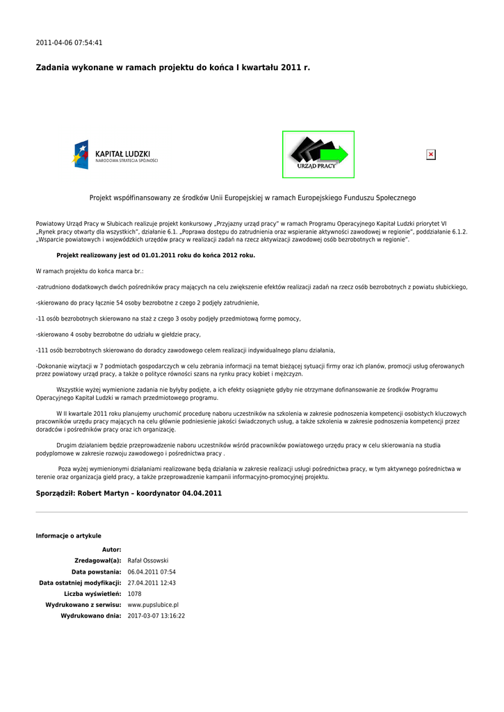 2011-04-06 07:54:41 Zadania wykonane w ramach projektu do końca I kwartału 2011 r. Projekt współfinansowany ze środków Unii Europejskiej w ramach Europejskiego Funduszu Społecznego Powiatowy Urząd Pracy w Słubicach realizuje projekt konkursowy „Przyjazny urząd pracy” w ramach Programu Operacyjnego Kapitał Ludzki priorytet VI „Rynek pracy otwarty dla wszystkich”, działanie 6.1. „Poprawa dostępu do zatrudnienia oraz wspieranie aktywności zawodowej w regionie”, poddziałanie 6.1.2. „Wsparcie powiatowych i wojewódzkich urzędów pracy w realizacji zadań na rzecz aktywizacji zawodowej osób bezrobotnych w regionie”. Projekt realizowany jest od 01.01.2011 roku do końca 2012 roku. W ramach projektu do końca marca br.: -zatrudniono dodatkowych dwóch pośredników pracy mających na celu zwiększenie efektów realizacji zadań na rzecz osób bezrobotnych z powiatu słubickiego, -skierowano do pracy łącznie 54 osoby bezrobotne z czego 2 podjęły zatrudnienie, -11 osób bezrobotnych skierowano na staż z czego 3 osoby podjęły przedmiotową formę pomocy, -skierowano 4 osoby bezrobotne do udziału w giełdzie pracy, -111 osób bezrobotnych skierowano do doradcy zawodowego celem realizacji indywidualnego planu działania, -Dokonanie wizytacji w 7 podmiotach gospodarczych w celu zebrania informacji na temat bieżącej sytuacji firmy oraz ich planów, promocji usług oferowanych przez powiatowy urząd pracy, a także o polityce równości szans na rynku pracy kobiet i mężczyzn. Wszystkie wyżej wymienione zadania nie byłyby podjęte, a ich efekty osiągnięte gdyby nie otrzymane dofinansowanie ze środków Programu Operacyjnego Kapitał Ludzki w ramach przedmiotowego programu. W II kwartale 2011 roku planujemy uruchomić procedurę naboru uczestników na szkolenia w zakresie podnoszenia kompetencji osobistych kluczowych pracowników urzędu pracy mających na celu głównie podniesienie jakości świadczonych usług, a także szkolenia w zakresie podnoszenia kompetencji przez doradców i pośredników pracy oraz ich organizację. Drugim działaniem będzie przeprowadzenie naboru uczestników wśród pracowników powiatowego urzędu pracy w celu skierowania na studia podyplomowe w zakresie rozwoju zawodowego i pośrednictwa pracy . Poza wyżej wymienionymi działaniami realizowane będą działania w zakresie realizacji usługi pośrednictwa pracy, w tym aktywnego pośrednictwa w terenie oraz organizacja giełd pracy, a także przeprowadzenie kampanii informacyjno-promocyjnej projektu. Sporządził: Robert Martyn – koordynator 04.04.2011 Informacje o artykule Autor: Zredagował(a): Rafał Ossowski Data powstania: 06.04.2011 07:54 Data ostatniej modyfikacji: 27.04.2011 12:43 Liczba wyświetleń: Wydrukowano z serwisu: Wydrukowano dnia: 1078 www.pupslubice.pl 2017-03-07 13:16:22