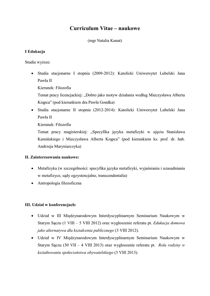 Curriculum Vitae – naukowe (mgr Natalia Kunat) I Edukacja Studia wyższe: • Studia stacjonarne I stopnia (2009-2012): Katolicki Uniwersytet Lubelski Jana Pawła II Kierunek: Filozofia Temat pracy licencjackiej: „Dobro jako motyw działania według Mieczysława Alberta Krąpca” (pod kierunkiem dra Pawła Gondka) • Studia stacjonarne II stopnia (2012-2014): Katolicki Uniwersytet Lubelski Jana Pawła II Kierunek: Filozofia Temat pracy magisterskiej: „Specyfika języka metafizyki w ujęciu Stanisława Kamińskiego i Mieczysława Alberta Krąpca” (pod kierunkiem ks. prof. dr. hab. Andrzeja Maryniarczyka) II. Zainteresowania naukowe: • Metafizyka (w szczególności: specyfika języka metafizyki, wyjaśniania i uzasadniania w metafizyce, sądy egzystencjalne, transcendentalia) • Antropologia filozoficzna III. Udział w konferencjach: • Udział w III Międzynarodowym Interdyscyplinarnym Seminarium Naukowym w Starym Sączu (1 VIII – 5 VIII 2012) oraz wygłoszenie referatu pt. Edukacja domowa jako alternatywa dla kształcenia publicznego (3 VIII 2012). • Udział w IV Międzynarodowym Interdyscyplinarnym Seminarium Naukowym w Starym Sączu (30 VII – 4 VIII 2013) oraz wygłoszenie referatu pt. Rola rodziny w kształtowaniu społeczeństwa obywatelskiego (3 VIII 2013). IV. Nagrody: • Nagroda I stopnia im. o. prof. Mieczysława A. Krąpca za pracę licencjacką na temat: Dobro jako motyw działania według Mieczysława Alberta Krąpca ufundowana przez Polskie Towarzystwo Tomasza z Akwinu – oddział Società Internazionale Tommaso a'Aquino (8 V 2013 r. KUL). • Nagroda Dziekana za najlepszą pracę dyplomową (Specyfika języka metafizyki w ujęciu Stanisława Kamińskiego i Mieczysława Alberta Krąpca) w roku akademickim 2013/2014, przyznana w dniu 14 listopada 2014 r. • Złota Nagroda im. Prof. Mieczysława Gogacza za pracę magisterską pt. Specyfika języka metafizyki w ujęciu Stanisława Kamińskiego i Mieczysława Alberta Krąpca, przyznana w dniu 29 listopada 2014 r.