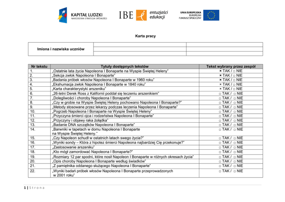Karta pracy Imiona i nazwiska uczniów Nr tekstu 1. 2. 3. 4. 5. 6. 7. 8. 9. 10. 11. 12. 13. 14. 15. 16. 17. 18. 19. 20. 21. 22. 1|Strona Tytuły dostępnych tekstów „Ostatnie lata życia Napoleona I Bonaparte na Wyspie Świętej Heleny” „Sekcja zwłok Napoleona I Bonaparte” „Badania próbek włosów Napoleona I Bonaparte w 1960 roku” „Ekshumacja zwłok Napoleona I Bonaparte w 1840 roku” „Karta charakterystyki arszeniku” „26-letni Derek Ross z Kalifornii poddał się leczeniu arszenikiem” „Dolegliwości i choroby Napoleona I Bonaparte” „Czy w grobie na Wyspie Świętej Heleny pochowano Napoleona I Bonaparte?” „Metody stosowane przez lekarzy podczas leczenia Napoleona I Bonaparte” „Pogrzeb Napoleona I Bonaparte na Wyspie Świętej Heleny” „Przyczyna śmierci ojca i rodzeństwa Napoleona I Bonaparte” „Przyczyny i objawy raka żołądka” „Badanie DNA szczątków Napoleona I Bonaparte” „Barwniki w tapetach w domu Napoleona I Bonaparte na Wyspie Świętej Heleny.” „Czy Napoleon schudł w ostatnich latach swego życia?” „Wyniki sondy – Która z hipotez śmierci Napoleona najbardziej Cię przekonuje?” „Zastosowanie arszeniku” „Kto mógł zamordować Napoleona I Bonaparte?” „Rozmiary 12 par spodni, które nosił Napoleon I Bonaparte w różnych okresach życia” „Opis choroby Napoleona I Bonaparte według świadków” „Z pamiętnika oddanego służącego Napoleona I Bonaparte” „Wyniki badań próbek włosów Napoleona I Bonaparte przeprowadzonych w 2001 roku” Tekst wybrany przez zespół × TAK / □ NIE × TAK / □ NIE × TAK / □ NIE × TAK / □ NIE × TAK / □ NIE □ TAK / □ NIE □ TAK / □ NIE □ TAK / □ NIE □ TAK / □ NIE □ TAK / □ NIE □ TAK / □ NIE □ TAK / □ NIE □ TAK / □ NIE □ TAK / □ NIE □ TAK / □ TAK / □ TAK / □ TAK / □ TAK / □ TAK / □ TAK / □ TAK / □ NIE □ NIE □ NIE □ NIE □ NIE □ NIE □ NIE □ NIE Czy przyczyną śmierci Napoleona I Bonaparte było zatrucie arszenikiem? Argumenty na „tak” Informacja Po dziewiętnastu latach od śmierci cesarza jego ciało było nienaruszone. Wniosek 2|Strona Wniosek Arszenik ma działanie konserwujące. Argumenty na „nie” Numer tekstu źródłowego 4. Informacja Wniosek Numer tekstu źródłowego