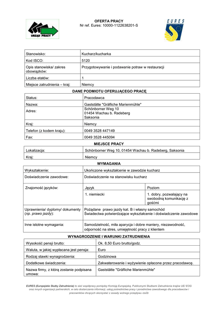 OFERTA PRACY Nr ref. Eures: 10000-1122638201-S Stanowisko: Kucharz/kucharka Kod ISCO: 5120 Opis stanowiska/ zakres obowiązków: Przygotowywanie i podawanie potraw w restauracji Liczba etatów: 1 Miejsce zatrudnienia – kraj: Niemcy DANE PODMIOTU OFERUJĄCEGO PRACĘ Status: Pracodawca Nazwa: Adres: Gaststätte "Gräfliche Marienmühle" Schönborner Weg 10 01454 Wachau b. Radeberg Saksonia Kraj: Niemcy Telefon (z kodem kraju): 0049 3528 447149 Fax: 0049 3528 445094 MIEJSCE PRACY Lokalizacja: Schönborner Weg 10, 01454 Wachau b. Radeberg, Saksonia Kraj: Niemcy WYMAGANIA Wykształcenie: Ukończone wykształcenie w zawodzie kucharz Doświadczenie zawodowe: Doświadczenie na stanowisku kucharz Znajomość języków: Język Poziom 1. niemiecki 1. dobry, pozwalający na swobodną komunikację z gośćmi Uprawnienia/ dyplomy/ dokumenty (np. prawo jazdy): Pożądane prawo jazdy kat. B i własny samochód Świadectwa potwierdzające wykształcenie i doświadczenie zawodowe Inne istotne wymagania: Samodzielność, miła aparycja i dobre maniery, niezawodność, odporność na stres, umiejętność pracy z klientem WYNAGRODZENIE I WARUNKI ZATRUDNIENIA Wysokość pensji brutto: Ok. 8,50 Euro brutto/godz. Waluta, w jakiej wypłacana jest pensja: Euro Rodzaj stawki wynagrodzenia: Godzinowa Dodatkowe świadczenia: Zakwaterowanie i wyżywienie opłacone przez pracodawcę. Nazwa firmy, z którą zostanie podpisana umowa: Gaststätte "Gräfliche Marienmühle" EURES (Europejskie Służby Zatrudnienia) to sieć współpracy pomiędzy Komisją Europejską, Publicznymi Służbami Zatrudnienia krajów UE/ EOG oraz innych organizacji partnerskich, w celu dostarczania informacji, usług pośrednictwa pracy i poradnictwa zawodowego dla pracodawców i pracowników chcących skorzystać z zasady wolnego przepływu osób Rodzaj umowy: Umowa o pracę Wymiar czasu pracy Pełen etat Czas trwania umowy: Na czas nieokreślony Liczba godzin tygodniowo: 40 Zmiany i praca w dni wolne: Praca na 2 zmiany Data rozpoczęcia: 1.03.2015 SPOSÓB SKŁADANIA WNIOSKU Wymagane dokumenty: CV tylko w j. niemieckim, świadectwa Język, w którym muszą być sporządzone przedkładane dokumenty: niemiecki Do kogo należy wysłać dokumenty: Do pracodawcy Gdzie należy wysłać dokumenty: Pocztą tradycyjną z dopiskiem „Koch in Wachau” na adres: Gaststätte "Gräfliche Marienmühle" Frau Ramke Schönborner Weg 10 01454 Wachau b. Radeberg Sachsen Deutschland Dane teleadresowe doradcy EURES lub przedstawiciela pracodawcy: Pani Ramke tel. +49 3528 447149 WAŻNOŚĆ Data publikacji: 30.01.2015r. Termin przedkładania podań o pracę / zakończenia ważności oferty: Do odwołania UWAGA: 1. Umowa z zagranicznym pracodawcą zostanie zawarta zgodnie z prawem kraju zatrudnienia. Oznacza to, że wszystkie roszczenia odnośnie do warunków, które obejmuje umowa, można kierować wyłącznie do odpowiedniego sądu w kraju zatrudnienia. Publiczne służby zatrudnienia (EURES) nie mogą pośredniczyć ani reprezentować pracownika w sądzie kraju zatrudnienia w przypadku sporu z pracodawcą. 2. Publiczne służby zatrudnienia (EURES) dokładają wszelkich starań, aby zapewnić rzetelność i wiarygodność ofert pracy zgłoszonych w lokalnym urzędzie pracy. Należy wyjaśnić, że oferta pracy została zgłoszona przez stronę trzecią i EURES nie odpowiada za ewentualne rozbieżności między warunkami pracy określonymi w ofercie pracy i warunkami oferowanymi przez potencjalnego pracodawcę. 3. Publiczne służby zatrudnienia (EURES) informują, że będą zbierać, przetwarzać i przekazywać potencjalnym pracodawcom zgodnie z przepisami dotyczącymi ochrony danych osobowych wszystkie dane osobowe dostarczone przez osoby poszukujące pracy. EURES (Europejskie Służby Zatrudnienia) to sieć współpracy pomiędzy Komisją Europejską, Publicznymi Służbami Zatrudnienia krajów UE/ EOG oraz innych organizacji partnerskich, w celu dostarczania informacji, usług pośrednictwa pracy i poradnictwa zawodowego dla pracodawców i pracowników chcących skorzystać z zasady wolnego przepływu osób