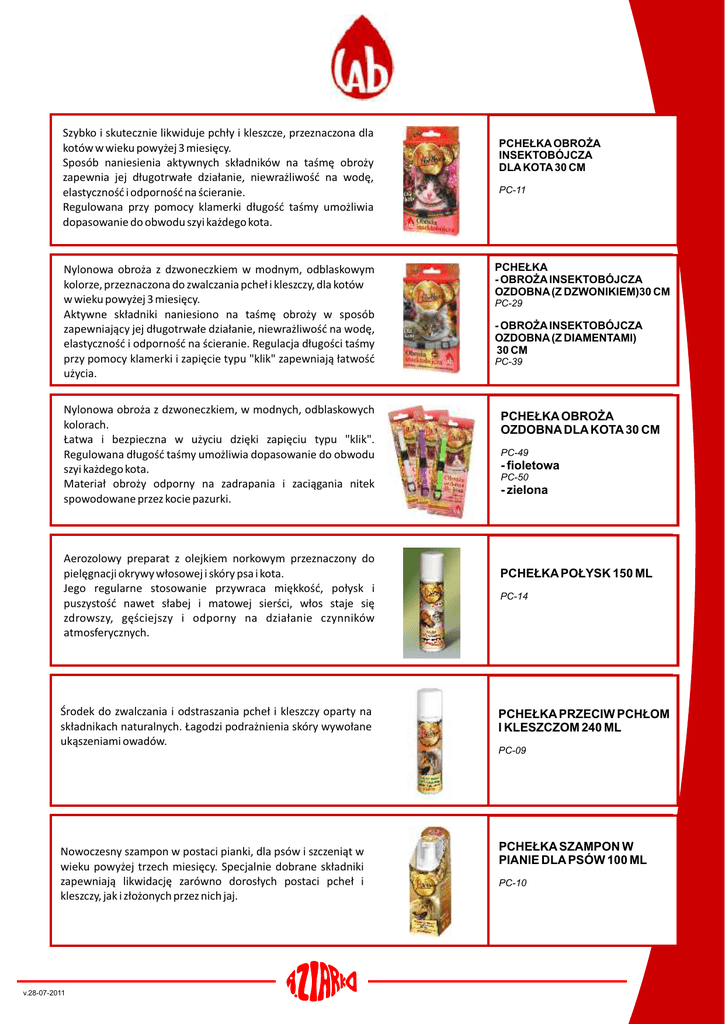 Szybko i skutecznie likwiduje pchły i kleszcze, przeznaczona dla kotów w wieku powyżej 3 miesięcy. Sposób naniesienia aktywnych składników na taśmę obroży zapewnia jej długotrwałe działanie, niewrażliwość na wodę, elastyczność i odporność na ścieranie. Regulowana przy pomocy klamerki długość taśmy umożliwia dopasowanie do obwodu szyi każdego kota. Nylonowa obroża z dzwoneczkiem w modnym, odblaskowym kolorze, przeznaczona do zwalczania pcheł i kleszczy, dla kotów w wieku powyżej 3 miesięcy. Aktywne składniki naniesiono na taśmę obroży w sposób zapewniający jej długotrwałe działanie, niewrażliwość na wodę, elastyczność i odporność na ścieranie. Regulacja długości taśmy przy pomocy klamerki i zapięcie typu "klik" zapewniają łatwość użycia. Nylonowa obroża z dzwoneczkiem, w modnych, odblaskowych kolorach. Łatwa i bezpieczna w użyciu dzięki zapięciu typu "klik". Regulowana długość taśmy umożliwia dopasowanie do obwodu szyi każdego kota. Materiał obroży odporny na zadrapania i zaciągania nitek spowodowane przez kocie pazurki. Aerozolowy preparat z olejkiem norkowym przeznaczony do pielęgnacji okrywy włosowej i skóry psa i kota. Jego regularne stosowanie przywraca miękkość, połysk i puszystość nawet słabej i matowej sierści, włos staje się zdrowszy, gęściejszy i odporny na działanie czynników atmosferycznych. Środek do zwalczania i odstraszania pcheł i kleszczy oparty na składnikach naturalnych. Łagodzi podrażnienia skóry wywołane ukąszeniami owadów. Nowoczesny szampon w postaci pianki, dla psów i szczeniąt w wieku powyżej trzech miesięcy. Specjalnie dobrane składniki zapewniają likwidację zarówno dorosłych postaci pcheł i kleszczy, jak i złożonych przez nich jaj. v.28-07-2011 PCHEŁKA OBROŻA INSEKTOBÓJCZA DLA KOTA 30 CM PC-11 PCHEŁKA - OBROŻA INSEKTOBÓJCZA OZDOBNA (Z DZWONIKIEM)30 CM PC-29 - OBROŻA INSEKTOBÓJCZA OZDOBNA (Z DIAMENTAMI) 30 CM PC-39 PCHEŁKA OBROŻA OZDOBNA DLA KOTA 30 CM PC-49 - fioletowa PC-50 - zielona PCHEŁKA POŁYSK 150 ML PC-14 PCHEŁKA PRZECIW PCHŁOM I KLESZCZOM 240 ML PC-09 PCHEŁKA SZAMPON W PIANIE DLA PSÓW 100 ML PC-10 PCHEŁKA OBROŻA INSEKTOBÓJCZA DLA PSÓW BEZZAPACHOWA 50 CM PC-15 PCHEŁKA OBROŻA INSEKTOBÓJCZA DLA PSÓW ZAPACH ZIOŁOWY 65 CM PC-13 PCHEŁKA OBROŻA INSEKTOBÓJCZA DLA PSA 65 CM Prosty i skuteczny sposób na likwidację pcheł i kleszczy, dla psów w wieku powyżej trzech miesięcy. Aktywne składniki zostały naniesione na taśmę obroży w taki sposób, aby zapewnić jej długotrwałe działanie (do 5 miesięcy), niewrażliwość na wodę, elastyczność i odporność na ścieranie. Prosty i skuteczny sposób na likwidację pcheł i kleszczy, dla psów w wieku powyżej trzech miesięcy. Aktywne składniki zostały naniesione na taśmę obroży w taki sposób, aby zapewnić jej długotrwałe działanie (do 5 miesięcy), niewrażliwość na wodę, elastyczność i odporność na ścieranie. Likwiduje pchły, kleszcze i inne pasożyty. Przeznaczona dla psów w wieku powyżej 3 miesięcy. Zapewnia długotrwałą ochronę. PC-08 PCHEŁKA OBROŻA INSEKTOBÓJCZA DLA PSÓW ODBLASKOWA 75 CM PC-26 PCHEŁKA OBROŻA INSEKTOBÓJCZA DLA PSÓW MINIATUREK 35 CM PC-16 Prosty i skuteczny sposób na likwidację pcheł i kleszczy dla psów ras miniaturowych. Aktywne składniki zostały naniesione na taśmę obroży w taki sposób, aby zapewnić jej długotrwałe działanie (do 5 miesięcy), niewrażliwość na wodę, elastyczność i odporność na ścieranie. PCHEŁKA OBROŻA INSEKTOBÓJCZA DLA PSÓW 40 CM PC-38 v.28-07-2011 PCHEŁKA PUDER PRZECIW PCHŁOM I KLESZCZOM 100 G PC-21 PCHEŁKA NA POSŁANIE PRZECIW PCHŁOM 350 ML PC-17 PCHEŁKA SZAMPON PRZECIWPCHELNY 180 ML PC-18 Szampon z dodatkiem olejku norkowego i naturalnych ekstraktów roślinnych. Poprawia kondycję włosa, odżywia go i regeneruje. Szczególnie polecany do użycia w przypadku matowej i słabej sierści. PCHEŁKA SZAMPON Z OLEJKIEM NORKOWYM PC-03 - 200 ML PC-02 - 25 ML Antyalergiczny, łagodzący podrażnienia skóry, delikatny szampon dla psów i szczeniąt. Ma działanie antyseptyczne, likwiduje łupież i swędzenie skóry. Bardzo wydajny. PCHEŁKA SZAMPON Z OLEJKIEMDRZEWA HERBACIANEGO PC-12 - 200 ML PC-01 - 25 ML Łagodny, uniwersalny szampon o bardzo dobrych właściwościach myjących. Nie wysusza skóry, odpowiedni dla każdego rodzaju sierści. Wydajny i łatwy w użyciu. v.28-07-2011 PCHEŁKA SZAMPON PIELĘGNACYJNY 200 ML PC-04 PCHEŁKA SZAMPON DLA PSÓW O SIERŚCI DELIKATNEJ 200 ML - PC-24 PCHEŁKA SZAMPON DLA PSÓW SZORSTKOWŁOSYCH 200 ML - PC-25 PCHEŁKA OBROŻA CHUSTKA PC-30 37,5/1,5 PC-31 44/1,5 KOKARDKI MIX 12 szt. PC-40 falbanki PC-41 paski SMYCZ PC-44 PC-46 PC-47 PC-48 czer. met. 125/1,5 różowa 125/1,5 zamsz. czer. 125/1,5 zamsz. nieb. 125/1,5 SZELKI I SMYCZ LUX LINE PC-5122 PC-5139 PC-5153 PC-5146 kot “M” kot “S” pies “M” pies “S” v.28-07-2011 SUKIENKA MINI GIRL PC-5481 “M” PC-5474 “S” KOSZULKA PETITKA PC-5603 “M” CZARNA PC-5627 “M” CZERWONA PC-5610 “S” CZERWONA SUKIENKA MINI LADY PC-5504 “M” PC-5498 “S” OBROŻA INSEKTOBÓJCZA SPACEROWA KOT “XS” 25cm PC-6204 OBROŻA INSEKTOBÓJCZA SPACEROWA PIES PC-6198 PC-6181 PC-6174 PC-6167 “L” 60 cm “M” 50 cm “S” 40 cm “XL” 30 cm PCHEŁKA PIBUTOZOL ŚRODEK PRZECIW PCHŁOM - PC-51 v.28-07-2011 PCHEŁKA SZAMPON LUX LINE JUNIOR 150ml - PC-5290 PCHEŁKA SZAMPON 2w1 LUX LINE do sierści delikatnej i wrazliwej hipoalergiczny 200ml - PC-6686 PCHEŁKA SZAMPON 2w1 LUX LINE do sierści białej i jasnej wzmacnia i uwydatnia kolor 200ml - PC-6716 PCHEŁKA SZAMPON 2w1 LUX LINE do sierści krótkiej wzmacnia, nabłyszcza, odżywia 200ml - PC-6693 PCHEŁKA SZAMPON 2w1 LUX LINE przeciwpchelny z odżywką do wszystkich rodzajów sierści 200ml - PC-6723 KONDYCJONER SIERŚCI DLA PSÓW LUX LINE 200ml PC-6709 Wysokiej klasy szampon z ekskluzywnej serii Lux Line polecany specjalnie