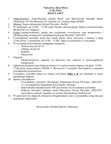 Najszybszy Zjazd Rurą 11.06.2016r. REGULAMIN Organizatorem „Najszybszego Zjazdu Rurą” jest Skoczowski Ośrodek Sporu i Rekreacji, 43-430 Skoczów ul. Górecka 2A, zwanym dalej SOSiR. 2. Miejsce: basen rekreacyjny Krytej Pływalni „Delfin”. 3. W godzinach od 15.00 – 17.00 część basenu rekreacyjnego będzie zarezerwowana dla potrzeb w/w imprezy. 4. Celem przeprowadzenia zjazdu jest wyłonienie zwycięzców oraz promowanie i reklama usług związanych z działalnością Krytej Pływalni „DELFIN”. 5. Uczestnikiem zawodów może być każdy klient, który skorzysta z basenu w dniu 11.06.2016r. w godzinach od 15:00 – 17:00 i zgłosi uczestnictwo w zawodach. 6. W zawodach przewidziano następujące kategorie: - Dziewczyny do lat 16 - Chłopcy do lat 16 - Kobiety - Mężczyźni 7. Nagrody: - Okolicznościowe nagrody za pierwsze trzy miejsca w poszczególnych kategoriach. 8. Zgłoszenia przyjmowane będą na bieżąco w czasie trwania imprezy od godz. 15:00 – 17:00 przez pracowników SOSiR w Skoczowie. Uczestnik obowiązkowo wypełnia oświadczenie uczestnictwa. 9. Uczestnicy zawodów płacą za wejście na basen tylko 1 zł, po okazaniu w kasie specjalnego kuponu. 10. Sprawy porządkowe: - Uczestników zawodów obowiązuje Regulamin Krytej Pływalni „DELFIN”, a w szczególności Regulamin korzystania z Basenu, - Indywidualne ubezpieczenie NW pozostawia się do uznania uczestnika. - Podczas zawodów, pełniący dyżur Ratownicy Krytej Pływalni „DELFIN”, prowadzą czynności zgodnie ze swoimi obowiązkami służbowymi. 11. W sprawach nie objętych niniejszym Regulaminem oraz w przypadku uwag decyzje podejmuje organizator. 1. Skoczowski Ośrodek Sportu i Rekreacji