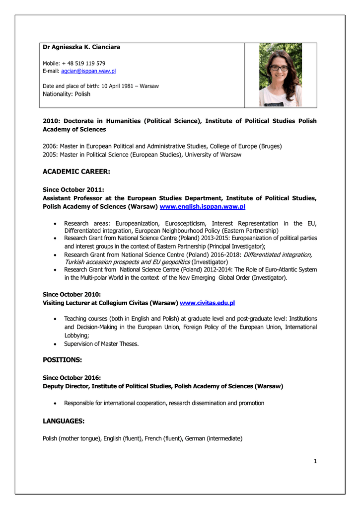 Dr Agnieszka K. Cianciara Mobile: + 48 519 119 579 E-mail: [email protected] Date and place of birth: 10 April 1981 – Warsaw Nationality: Polish 2010: Doctorate in Humanities (Political Science), Institute of Political Studies Polish Academy of Sciences 2006: Master in European Political and Administrative Studies, College of Europe (Bruges) 2005: Master in Political Science (European Studies), University of Warsaw ACADEMIC CAREER: Since October 2011: Assistant Professor at the European Studies Department, Institute of Political Studies, Polish Academy of Sciences (Warsaw) www.english.isppan.waw.pl Research areas: Europeanization, Euroscepticism, Interest Representation in the EU, Differentiated integration, European Neighbourhood Policy (Eastern Partnership) Research Grant from National Science Centre (Poland) 2013-2015: Europeanization of political parties and interest groups in the context of Eastern Partnership (Principal Investigator); Research Grant from National Science Centre (Poland) 2016-2018: Differentiated integration, Turkish accession prospects and EU geopolitics (Investigator) Research Grant from National Science Centre (Poland) 2012-2014: The Role of Euro-Atlantic System in the Multi-polar World in the context of the New Emerging Global Order (Investigator). Since October 2010: Visiting Lecturer at Collegium Civitas (Warsaw) www.civitas.edu.pl Teaching courses (both in English and Polish) at graduate level and post-graduate level: Institutions and Decision-Making in the European Union, Foreign Policy of the European Union, International Lobbying; Supervision of Master Theses. POSITIONS: Since October 2016: Deputy Director, Institute of Political Studies, Polish Academy of Sciences (Warsaw) Responsible for international cooperation, research dissemination and promotion LANGUAGES: Polish (mother tongue), English (fluent), French (fluent), German (intermediate) 1 CONFERENCES: 16-18.06.2016: 8th Pan-European Conference on the European Union The Union's Institutional and Constitutional Transformations: Stress or Adaptation?, ECPR Standing Group/ External, University of Trento (paper presented: "Contesting EU policies towards Ukraine and Russia in the European Parliament 2014-2015"). 08-10.07.2015: 22nd International Conference of Europeanists Contradictions. Envisioning European Futures, Council for European Studies, Sciences Po, Paris (paper presented: "Europeanization or instrumentalization? Comparing legitimacy strategies of political parties from Ukraine and Georgia"). 01-03.09.2014: UACES 44th Annual Conference, University Association for Contemporary European Studies, University of Cork, Cork, Ireland (paper presented: “Differentiated Integration and Shifting Power Relations in the European Union: a Polish Perspective) [in English]; 05-07.06.2014: 7th Pan-European Conference on EU Politics, European Consortium for Political Research (ECPR) – Standing Group on the European Union, University of Leiden, The Hague, Netherlands (paper presented: “Clash of empires? External expansion and competition in the EU’s eastern peripheries”) [in English]; 21.10.2013: Moldova and European Union: from cooperation to integration, Catholic University of Lublin, Lublin, Poland (paper presented: “Elite Europeanization in Eastern Partnership countries and the case of Moldova: mechanisms, determinants and results”) [in Polish]; 18-21.09.2013: 8th Pan-European Conference on International Relations, One International Relations or Many? Multiple Worlds, Multiple Crises, EISA and Institute of International Relations (University of Warsaw), Warsaw, Poland (paper presented: “Withering Empire: European Union, the Crisis and the Eastern Peripheries”) [in English]; 07.06.2012: The EU Presidency, a Comparative Perspective: Poland, Denmark, Cyprus, University of Nicosia, Nicosia, Cyprus (paper presented: “Rotating Council Presidency within the post-Lisbon institutional dynamics: politically irrelevant?”) [in English]; 20.05.2011: European Union and the overseas territories of the United Kingdom, France and the Netherlands, Institute of Political Studies Polish Academy of Sciences and University of Łódź, Warsaw, Poland (paper presented: “French overseas departments and dependent territories and the European Union”) [in Polish]; 31.03.2011:Regulation of Lobbying, Institute of Sociology, Czech Academy of Sciences and RESPEKT Institute, Prague, Czech Republic (paper presented: “Lobbying Regulation in Poland: logics, shortcomings and a way forward”) [in English]; 19.05.2010: Leadership Crisis in Contemporary Politics, University of Social Sciences and Humanities, Warsaw, Poland (paper presented: “Leadership in the European Council and the Lisbon Treaty”) [in Polish]; 29-30.10.2009: What Capitalism? Socio-economic change in Central Eastern Europe, University of Jena, Jena, Germany (paper presented: “Polish Business-Politics Relations and their Impact on National Lobbying at the EU Level”) [in English]; 26-27.05.2007: The Graduate Conference of Central European University, Budapest, Hungary (paper presented: “Business Interest Representation in Poland: a neoinstitutionalist perspective”) [in English]. 2 PUBLICATIONS: (*) – publication in English (peer reviewed journals or editor reviewed chapters) Books Europeizacja partii politycznych i grup interesu w wybranych krajach Partnerstwa Wschodniego i kandydujących do Unii Europejskiej (with A. Burakowski, P. Olszewski, J. Wódka), Instytut Studiów Politycznych PAN, Warszawa 2015, pp. 376 [Europeanization of political parties and interest groups in selected Eastern Partnership and EU candidate countries]. Partnerstwo Wschodnie 2009-2014: geneza, funkcjonowanie, uwarunkowania , Instytut Studiów Politycznych PAN, Warszawa 2014, pp. 177 [Eastern Partnership 2009-2014: origins, functioning, determinants]. Polski lobbing gospodarczy w Unii Europejskiej (2004-2010): perspektywa neoinstytucjonalna, Warszawa 2012, pp. 266.