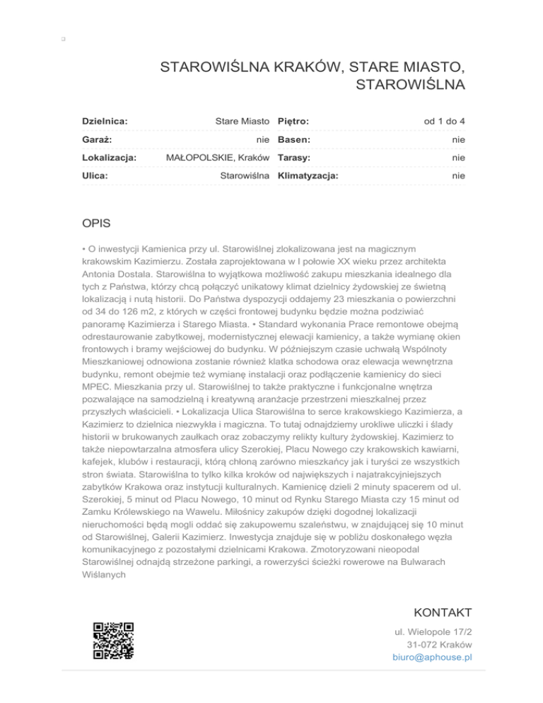 STAROWIŚLNA KRAKÓW, STARE MIASTO, STAROWIŚLNA Dzielnica: Garaż: Lokalizacja: Ulica: Stare Miasto Piętro: od 1 do 4 nie Basen: nie MAŁOPOLSKIE, Kraków Tarasy: nie Starowiślna Klimatyzacja: nie OPIS • O inwestycji Kamienica przy ul. Starowiślnej zlokalizowana jest na magicznym krakowskim Kazimierzu. Została zaprojektowana w I połowie XX wieku przez architekta Antonia Dostala. Starowiślna to wyjątkowa możliwość zakupu mieszkania idealnego dla tych z Państwa, którzy chcą połączyć unikatowy klimat dzielnicy żydowskiej ze świetną lokalizacją i nutą historii. Do Państwa dyspozycji oddajemy 23 mieszkania o powierzchni od 34 do 126 m2, z których w części frontowej budynku będzie można podziwiać panoramę Kazimierza i Starego Miasta. • Standard wykonania Prace remontowe obejmą odrestaurowanie zabytkowej, modernistycznej elewacji kamienicy, a także wymianę okien frontowych i bramy wejściowej do budynku. W późniejszym czasie uchwałą Wspólnoty Mieszkaniowej odnowiona zostanie również klatka schodowa oraz elewacja wewnętrzna budynku, remont obejmie też wymianę instalacji oraz podłączenie kamienicy do sieci MPEC. Mieszkania przy ul. Starowiślnej to także praktyczne i funkcjonalne wnętrza pozwalające na samodzielną i kreatywną aranżacje przestrzeni mieszkalnej przez przyszłych właścicieli. • Lokalizacja Ulica Starowiślna to serce krakowskiego Kazimierza, a Kazimierz to dzielnica niezwykła i magiczna. To tutaj odnajdziemy urokliwe uliczki i ślady historii w brukowanych zaułkach oraz zobaczymy relikty kultury żydowskiej. Kazimierz to także niepowtarzalna atmosfera ulicy Szerokiej, Placu Nowego czy krakowskich kawiarni, kafejek, klubów i restauracji, którą chłoną zarówno mieszkańcy jak i turyści ze wszystkich stron świata. Starowiślna to tylko kilka kroków od największych i najatrakcyjniejszych zabytków Krakowa oraz instytucji kulturalnych. Kamienicę dzieli 2 minuty spacerem od ul. Szerokiej, 5 minut od Placu Nowego, 10 minut od Rynku Starego Miasta czy 15 minut od Zamku Królewskiego na Wawelu. Miłośnicy zakupów dzięki dogodnej lokalizacji nieruchomości będą mogli oddać się zakupowemu szaleństwu, w znajdującej się 10 minut od Starowiślnej, Galerii Kazimierz. Inwestycja znajduje się w pobliżu doskonałego węzła komunikacyjnego z pozostałymi dzielnicami Krakowa. Zmotoryzowani nieopodal Starowiślnej odnajdą strzeżone parkingi, a rowerzyści ścieżki rowerowe na Bulwarach Wiślanych KONTAKT ul. Wielopole 17/2 31-072 Kraków [email protected]