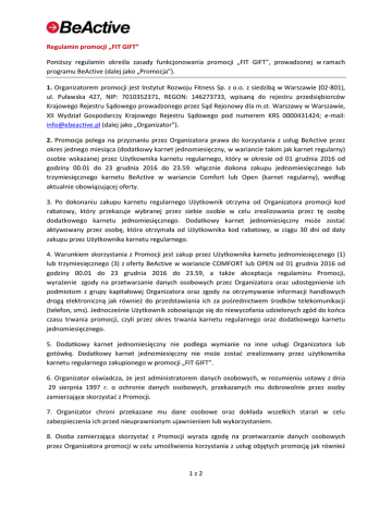 Regulamin promocji „FIT GIFT” Poniższy regulamin określa zasady funkcjonowania promocji „FIT GIFT”, prowadzonej w ramach programu BeActive (dalej jako „Promocja”). 1. Organizatorem promocji jest Instytut Rozwoju Fitness Sp. z o.o. z siedzibą w Warszawie (02-801), ul. Puławska 427, NIP: 7010352371, REGON: 146273733, wpisaną do rejestru przedsiębiorców Krajowego Rejestru Sądowego prowadzonego przez Sąd Rejonowy dla m.st. Warszawy w Warszawie, XII Wydział Gospodarczy Krajowego Rejestru Sądowego pod numerem KRS 0000431424; e-mail: [email protected] (dalej jako „Organizator”). 2. Promocja polega na przyznaniu przez Organizatora prawa do korzystania z usług BeActive przez okres jednego miesiąca (dodatkowy karnet jednomiesięczny, w wariancie takim jak karnet regularny) osobie wskazanej przez Użytkownika karnetu regularnego, który w okresie od 01 grudnia 2016 od godziny 00.01 do 23 grudnia 2016 do 23.59. włącznie dokona zakupu jednomiesięcznego lub trzymiesięcznego karnetu BeActive w wariancie Comfort lub Open (karnet regularny), według aktualnie obowiązującej oferty. 3. Po dokonaniu zakupu karnetu regularnego Użytkownik otrzyma od Organizatora promocji kod rabatowy, który przekazuje wybranej przez siebie osobie w celu zrealizowania przez tę osobę dodatkowego karnetu jednomiesięcznego. Dodatkowy karnet jednomiesięczny może zostać aktywowany przez osobę, która otrzymała od Użytkownika kod rabatowy, w ciągu 30 dni od daty zakupu przez Użytkownika karnetu regularnego. 4. Warunkiem skorzystania z Promocji jest zakup przez Użytkownika karnetu jednomiesięcznego (1) lub trzymiesięcznego (3) z oferty BeActive w wariancie COMFORT lub OPEN od 01 grudnia 2016 od godziny 00.01 do 23 grudnia 2016 do 23.59, a także akceptacja regulaminu Promocji, wyrażenie zgody na przetwarzanie danych osobowych przez Organizatora oraz udostępnienie ich podmiotom z grupy kapitałowej Organizatora oraz zgody na otrzymywanie informacji handlowych drogą elektroniczną jak również do przedstawiania ich za pośrednictwem środków telekomunikacji (telefon, sms). Jednocześnie Użytkownik zobowiązuje się do niewycofania udzielonych zgód do końca czasu trwania promocji, czyli przez okres trwania karnetu regularnego oraz dodatkowego karnetu jednomiesięcznego. 5. Dodatkowy karnet jednomiesięczny nie podlega wymianie na inne usługi Organizatora lub gotówkę. Dodatkowy karnet jednomiesięczny nie może zostać zrealizowany przez użytkownika karnetu regularnego zakupionego w promocji „FIT GIFT”. 6. Organizator oświadcza, że jest administratorem danych osobowych, w rozumieniu ustawy z dnia 29 sierpnia 1997 r. o ochronie danych osobowych, przekazanych mu dobrowolnie przez osoby zamierzające skorzystać z Promocji. 7. Organizator chroni przekazane mu dane osobowe oraz dokłada wszelkich starań w celu zabezpieczenia ich przed nieuprawnionym ujawnieniem lub wykorzystaniem. 8. Osoba zamierzająca skorzystać z Promocji wyraża zgodę na przetwarzanie danych osobowych przez Organizatora promocji w celu umożliwienia korzystania z usług objętych promocją jak również 1z2 w usprawiedliwionym celu administratora danych, zgodnie z ustawą z dnia 29 sierpnia 1997 r. o ochronie danych osobowych. 9. Osoba zamierzająca skorzystać z Promocji oświadcza, że znajduje się w stanie zdrowia pozwalającym jej na korzystanie z usług świadczonych przez wybrany Klub Fitness oraz że jest świadoma zagrożenia dla zdrowia wywołanego nadmiernymi obciążeniami w trakcie wykonywania ćwiczeń oraz zobowiązuje się do korzystania z usług wybranego Klubu Fitness zgodnie z regulaminem jego funkcjonowania. 10. Pełna lista Klubów Fitness, o której mowa w punkcie 9, znajduje się na stronie internetowej www.ebeactive.pl w zakładce „NASZE KLUBY”. 11. Wszelkie pytania związane z niniejszą Promocją można kierować na adres [email protected] 12. Niniejsza Promocja nie podlega łączeniu z innymi promocjami i zniżkami oferowanymi przez BeActive. 13. Niniejszy Regulamin obowiązuje od dnia 01 grudnia 2016. 2z2