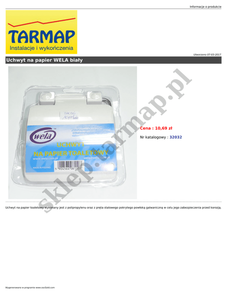 Informacje o produkcie Utworzono 07-03-2017 Cena : 10,69 zł Nr katalogowy : 32032 sk le p .t a rm ap .p l Uchwyt na papier WELA biały Uchwyt na papier toaletowy wykonany jest z polipropylenu oraz z pręta stalowego pokrytego powłoką galwaniczną w celu jego zabezpieczenia przed korozją. Wygenerowano w programie www.oscGold.com
