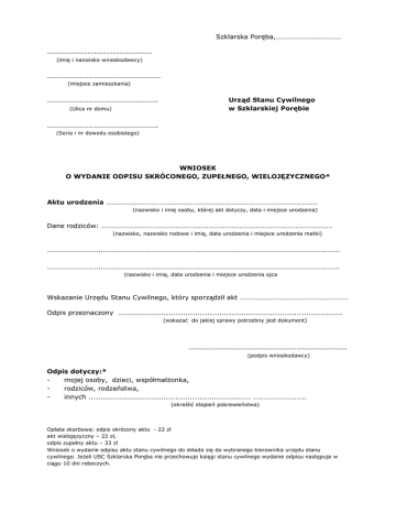 Szklarska Poręba,……………………………… …………………………………………………….. (imię i nazwisko wnioskodawcy) …………………………………………………….. (miejsce zamieszkania) ……………………………………………………. (Ulica nr domu) Urząd Stanu Cywilnego w Szklarskiej Porębie ……………………………………………………. (Seria i nr dowodu osobistego) WNIOSEK O WYDANIE ODPISU SKRÓCONEGO, ZUPEŁNEGO, WIELOJĘZYCZNEGO* Aktu urodzenia …………………………………………………………………………………………………….. (nazwisko i imię osoby, której akt dotyczy, data i miejsce urodzenia) Dane rodziców: ………………………………………………………………………………………………………………. (nazwisko, nazwisko rodowe i imię, data urodzenia i miejsce urodzenia matki) ………………………..…………………………………………………………………………………………………………………… ………………………..………………………………………………………………………………………………………………….. (nazwisko i imię, data urodzenia i miejsce urodzenia ojca Wskazanie Urzędu Stanu Cywilnego, który sporządził akt …………………………………………………… Odpis przeznaczony ………...................................................................................... (wskazać do jakiej sprawy potrzebny jest dokument) ……………………………………………………………………. (podpis wnioskodawcy) Odpis dotyczy:* mojej osoby, dzieci, współmałżonka, rodziców, rodzeństwa, innych ................................................................... ……………………….. (określić stopień pokrewieństwa) Opłata skarbowa: odpis skrócony aktu - 22 zł akt wielojęzyczny – 22 zł, odpis zupełny aktu – 33 zł Wniosek o wydanie odpisu aktu stanu cywilnego do składa się do wybranego kierownika urzędu stanu cywilnego. Jeżeli USC Szklarska Poręba nie przechowuje księgi stanu cywilnego wydanie odpisu następuje w ciągu 10 dni roboczych.