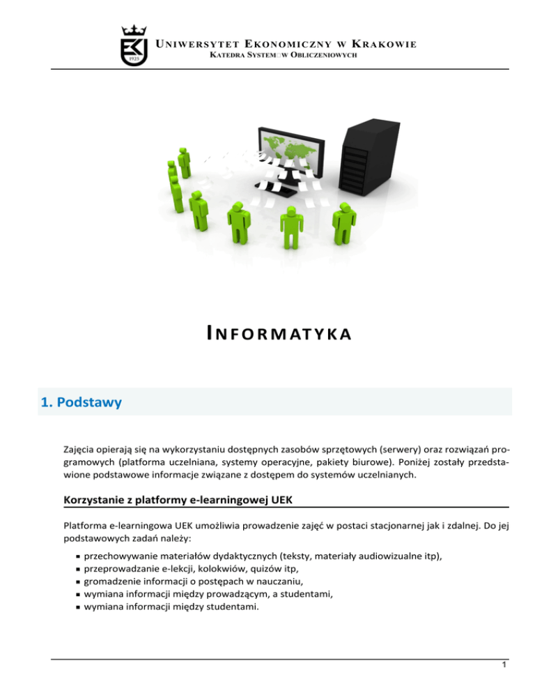 UNIWERSYTET EKONOMICZNY W KRAKOWIE KATEDRASYSTEMÓWOBLICZENIOWYCH INFORMATYKA 1.Podstawy Zajęcia opierają się na wykorzystaniu dostępnych zasobów sprzętowych (serwery) oraz rozwiązań programowych (platforma uczelniana, systemy operacyjne, pakiety biurowe). Poniżej zostały przedstawione podstawowe informacje związane z dostępem do systemów uczelnianych. Korzystaniezplatformye-learningowejUEK Platforma e-learningowa UEK umożliwia prowadzenie zajęć w postaci stacjonarnej jak i zdalnej. Do jej podstawowych zadań należy: przechowywanie materiałów dydaktycznych (teksty, materiały audiowizualne itp), przeprowadzanie e-lekcji, kolokwiów, quizów itp, gromadzenie informacji o postępach w nauczaniu, wymiana informacji między prowadzącym, a studentami, wymiana informacji między studentami. 1 Informatyka Aby aktywować swoje konto należy wejść na stronę http://cel.uek.krakow.pl i zalogować się (login to numer indeksu/albumu, a hasło to numer PESEL). UNIWERSYTET EKONOMICZNY W KRAKOWIE Przy aktywacji konta (pierwszym logowaniu) system poprosi nas o wprowadzenie swoich danych osobowych. Podajemy adres email, z którego korzystamy regularnie oraz wypełniamy wszystkie pola oznaczone czerwoną gwiazdką. Zmiany zostaną zapisane po kliknięciu na przycisk “Zmień profil”. Jeśli wszystko będzie się zgadzało strona zostanie odświeżona, ale zamiast miejsca na adres poczty elektronicznej pojawi się komunikat o konieczności autoryzacji adresu e-mail. W związku z tym, iż wprowadzono kontrolę poprawności adresów e-mail, aby w pełni zakończyć aktywację konta należy kliknąć odpowiedni link otrzymany w wiadomości. Wiadomość powinna zostać dostarczona w przeciągu kilku minut. Informacje o aktywacji kont dla studentów pierwszego roku znajdują się również pod adresem http://cel.uek.krakow.pl/moodle/mod/forum/discuss.php?d=11838#p23054 Każdy pracownik naukowo-dydaktyczny posiada ogólnodostępny kurs o nazwie e-wizytówka lub podobnej. Jego zawartością zazwyczaj są: dane teleadresowe, informacje o konsultacjach, link do harmonogramu zajęć, link do wykazu prowadzonych na platformie e-learningowej kursów, tablica ogłoszeń. Aby zapisać się na właściwy kurs należy najpierw wyszukać osobę prowadzącą. Można to zrobić wpisując jego nazwisko w wyszukiwarce dostępnej na stronie głównej platformy e-learningowej UEK. Spośród wyników wyszukiwania należy wybrać odpowiednią osobę. Następnie z dostępnych kursów wybrać ten, na który chcą się Państwo zapisać. Jeśli przy kursie znajduje się symbol kluczyka to konieczne będzie wprowadzenie hasła dostępu do kursu (hasło jest podawane przez prowadzącego na zajęciach). 2 Wątki Można również odnaleźć właściwy kurs przeszukując kategorię kursów (analogia do organizacji Uczelni według Wydziałów i Katedr). KorzystaniezserweraWizard Serwer Wizard umożliwia dostęp do systemu operacyjnego Linux, a co za tym idzie poczty elektronicznej oraz własnej strony internetowej. UNIWERSYTET EKONOMICZNY W KRAKOWIE Aktywowanie konta na serwerze jest możliwe po wejściu na stronę http://student.uek.krakow.pl i wybraniu w menu opcji “Pobierz hasło startowe”. Wszystkie pola formularza muszą zostać wypełnione danymi, które podali Państwo podczas rejestracji na studia. Hasło może zostać pobrane wyłącznie z komputerów zlokalizowanych na terenie kampusu UEK. Zalogowanie na konto jest możliwe za pomocą odpowiedniego programu (klient usługi SSH - szyfrowany telnet). Przykładowo może to być program PuTTY, który można pobrać ze strony http://www.putty.org. Aplikacja jest również dostępna na wszystkich komputerach w Uczelnianym Ośrodku Obliczeniowym. Po uruchomieniu programu pojawi się okno konfiguracyjne, do którego wprowadzamy dane: Host name: Port: Protocol: wizard.uek.krakow.pl 22 SSH 3 UNIWERSYTET EKONOMICZNY W KRAKOWIE Informatyka Kliknięcie “Open” to połączenie z serwerem. Podajemy nasze dane login oraz hasło (proszę zwrócić uwagę na wielkość znaków). Pierwszą rzeczą jaką należy zrobić po udanym zalogowaniu się na konto jest zmiana hasła dostępu. Można to zrobić za pomocą komendy: passwd Komenda ta nie posiada żadnych parametrów. Po jej wpisaniu i potwierdzeniu klawiszem Enter pojawi się prośba o podanie najpierw starego hasła, a następnie dwukrotnie nowego. Sprawdzenie poprawności wykonania tej operacji to wylogowanie się z systemu za pomocą komendy: logout 4 Wątki oraz ponowne zalogowanie z nowym hasłem. UNIWERSYTET EKONOMICZNY W KRAKOWIE Adres e-mail, którym można się posługiwać to [email protected]. Każdy student na ten adres otrzymuje oficjalne informacje od administracji uczelni i zaproszenia na różnego rodzaju akcje i imprezy organizowane na uczelni. Pocztę przychodzącą na konto założone na serwerze uczelnianym można sprawdzać korzystając np. z aplikacji webowej (http://wizard.uek.krakow.pl/webmail). Login i hasło są takie same jak w przypadku dostępu do serwera. Serwer Wizard to serwer działający w oparciu o system Linux. Warto pamiętać, że: - rozróżniane są wielkie i małe litery, - poruszanie się po ekranie odbywa się za pomocą klawiatury, - w większości aplikacji nie działa myszka, - interfejs dostępny za pomocą terminala oznacza konieczność znajomości odpowiednich komend. Siłę hasła (jego bezpieczeństwo) możesz sprawdzić w sieci: http://www.passwordmeter.com/ http://www.yetanotherpasswordmeter.com/ WyszukiwanieinformacjiwsieciInternet–zasadyogólne Przeglądarka internetowa (ang. web browser) to program komputerowy, służący do pobierania i wyświetlania zawartości dokumentów z serwerów internetowych, a także odtwarzania plików multimedialnych. Wyszukiwarka internetowa (ang. search engine) to program, którego zadaniem jest ułatwienie użytkownikom znalezienia informacji w sieci. W chwili obecnej najbardziej popularną wyszukiwarką informacji w sieci