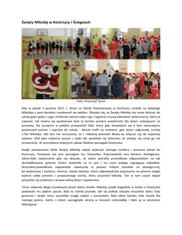 Święty Mikołaj w Kostrzycy i Ściegnach Foto: Krzysztof Tęcza Gdy w piątek 4 grudnia 2015 r. dzieci ze Szkoły Podstawowej w Kostrzycy czekały na Świętego Mikołaja u pani dyrektor rozdzwonił się telefon. Okazało się, że Święty Mikołaj nie może dotrzeć do szkoły gdyż jeden z jego reniferów złamał sobie rogi i najpierw muszą odwiedzić weterynarza, który je naprawi. Jak można się spodziewać była to bardzo przykra wiadomość dla dzieci czekających na prezenty. Na szczęście w pobliżu przejeżdżał Olaf, który gdy dowiedział się o tym nieszczęściu postanowił pomóc i zajechał do szkoły. Akurat trafił na moment, gdy dzieci odgrywały scenkę o Św. Mikołaju. Był tym tak wzruszony, że z radością pozostał dłużej by włączyć się do wspólnej zabawy. Olaf jako ulubiona postać z bajki tak spodobał się dzieciom, że witając się omal go nie przewróciły. W wymyślaniu kolejnych zabaw Olafowi pomagała Śnieżynka. Dzięki poświeceniu Olafa Święty Mikołaj zdążył wyleczyć chorego renifera i wreszcie dotarł do Kostrzycy. Ponieważ był sam pomagała mu Śnieżynka. Poprowadziła ona konkurs ekologiczny. Jakież było zaskoczenie gdy się okazało, że dzieci potrafią prawidłowo odpowiedzieć na tak skomplikowane pytania. Dzieci wiedziały co to jest i na czym polega segregacja odpadów. Wszystkie prawidłowe odpowiedzi zawieszały w postaci małych bombek na ekologicznej, bo wykonanej z kartonu, choince. Każde dziecko, które odpowiedziało poprawnie na pytanie mogło wybrać sobie prezent z przepastnego worka, który przyniósł Mikołaj. Ten w tym czasie zdążył przywitać się osobiście z prawie setką dzieci i opiekunów. Teraz nadeszła długo oczekiwana przez dzieci chwila. Mikołaj usiadł wygodnie w fotelu a Śnieżynka podawała mu piękne paczki. Była to chwila prawdy. Jak się jednak okazało wszystkie dzieci były grzeczne i dzięki temu wszystkie mogły odejść z prezentem. Była także bardzo miła chwila dla naszego gościa. Jedno z dzieci wyciągnęło ukrytą w kieszeni czekoladkę i dało ją w prezencie Mikołajowi. Foto: Krzysztof Tęcza Najmilszym jednak momentem była wizyta Mikołaja w klasie maluszków, którzy wraz ze swoją nauczycielką odśpiewali mu piękna piosenkę. Brzmiała ona tak: Przyjdź do nas Mikołaju, przynieś radość i zabawki, dla nas, dla każdego. Foto: Krzysztof Tęcza W momencie gdy Mikołaj obdarowywał dzieci w Kostrzycy Olaf dotarł do Szkoły Podstawowej w Ściegnach. Tak jak poprzednio wciągnął do zabawy dzieci zgromadzone na sali gimnastycznej. Po chwili przyjechała młodzież ze szkoły w Kostrzycy i ponownie odegrała scenkę o Świętym Mikołaju. Gdy wreszcie przyjechała Śnieżynka i Święty Mikołaj można było rozegrać, tak jak poprzednio, konkursy ekologiczne i przystąpić do świetnej zabawy. Tym razem dzieci oczekujące w kolejce do Foto: Krzysztof Tęcza Mikołaja nie miały łatwego życia. Dyrektor szkoły od razu wypatrzył tych niegrzecznych i przestawił ich na koniec kolejki by zanim ponownie dotrą do Mikołaja mogły przemyśleć swoje postępowanie. Na koniec Mikołaj odwiedził najmłodszych, którzy okazali się prawdziwymi szczęściarzami. Nie dość, że dostali, tak jak wszyscy paczki od Mikołaja, to ten wręczył im jeszcze te leżące pod choinką. -----------------------------------------Prezenty dla Mikołaja zostały zasponsorowane przez Związek Gmin Karkonoskich w Bukowcu. Krzysztof Tęcza