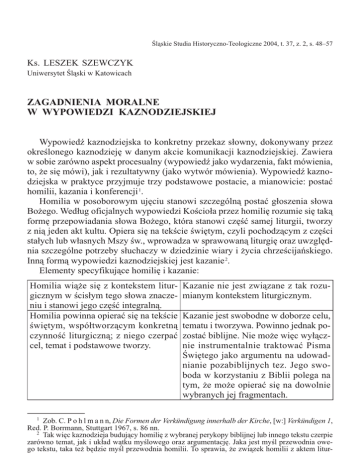 Śląskie Studia Historyczno-Teologiczne 2004, t. 37, z. 2, s. 48–57 Ks. LESZEK SZEWCZYK Uniwersytet Śląski w Katowicach ZAGADNIENIA MORALNE W WYPOWIEDZI KAZNODZIEJSKIEJ Wypowiedź kaznodziejska to konkretny przekaz słowny, dokonywany przez określonego kaznodzieję w danym akcie komunikacji kaznodziejskiej. Zawiera w sobie zarówno aspekt procesualny (wypowiedź jako wydarzenia, fakt mówienia, to, że się mówi), jak i rezultatywny (jako wytwór mówienia). Wypowiedź kaznodziejska w praktyce przyjmuje trzy podstawowe postacie, a mianowicie: postać homilii, kazania i konferencji 1. Homilia w posoborowym ujęciu stanowi szczególną postać głoszenia słowa Bożego. Według oficjalnych wypowiedzi Kościoła przez homilię rozumie się taką formę przepowiadania słowa Bożego, która stanowi część samej liturgii, tworzy z nią jeden akt kultu. Opiera się na tekście świętym, czyli pochodzącym z części stałych lub własnych Mszy św., wprowadza w sprawowaną liturgię oraz uwzględnia szczególne potrzeby słuchaczy w dziedzinie wiary i życia chrześcijańskiego. Inną formą wypowiedzi kaznodziejskiej jest kazanie 2. Elementy specyfikujące homilię i kazanie: Homilia wiąże się z kontekstem liturgicznym w ścisłym tego słowa znaczeniu i stanowi jego część integralną. Homilia powinna opierać się na tekście świętym, współtworzącym konkretną czynność liturgiczną; z niego czerpać cel, temat i podstawowe tworzy. 1 Kazanie nie jest związane z tak rozumianym kontekstem liturgicznym. Kazanie jest swobodne w doborze celu, tematu i tworzywa. Powinno jednak pozostać biblijne. Nie może więc wyłącznie instrumentalnie traktować Pisma Świętego jako argumentu na udowadnianie pozabiblijnych tez. Jego swoboda w korzystaniu z Biblii polega na tym, że może opierać się na dowolnie wybranych jej fragmentach. Zob. C. P o h l m a n n, Die Formen der Verkündigung innerhalb der Kirche, [w:] Verkündigen 1, Red. P. Borrmann, Stuttgart 1967, s. 86 nn. 2 Tak więc kaznodzieja budujący homilię z wybranej perykopy biblijnej lub innego tekstu czerpie zarówno temat, jak i układ wątku myślowego oraz argumentację. Jaka jest myśl przewodnia owego tekstu, taka też będzie myśl przewodnia homilii. To sprawia, że związek homilii z aktem litur- ZAGADNIENIA MORALNE W WYPOWIEDZI KAZNODZIEJSKIEJ Homilia ma być w sensie ścisłym mistagogiczna, czyli wyjaśniać znaki, gesty i słowa tworzące dany kontekst liturgiczny i prowadzić do zjednoczenia z obecnym w sprawowanej liturgii zmartwychwstałym Panem. Homilia ze względu na ścisły związek z kontekstem liturgicznym, zwłaszcza eucharystycznym, ma zapewnioną obecność przepowiadającego Chrystusa, z czego wypływa większa jej zbawcza skuteczność. 49 Kazanie może być mistagogiczne w sensie szerszym. Może i powinno ono wprowadzać w misterium chrześcijaństwa, którego centrum anowi Chrystus. Kazanie, z braku owego związku, ma zapewnioną obecność przepowiadającego Chrystusa jak całość kościelnego przepowiadania, którego jednostkę stanowi, ale obecność ta jest mniej doskonała. Stąd też mniejsza jego skuteczność zbawcza. Homilia w czynnikach formalnych (ję- Kazanie natomiast pozostawia większą zyk, styl, kompozycja, czas trwania) swobodę w wykorzystaniu środków rejest ograniczona kontekstem liturgicz- torycznych. nym. Homilię może wygłaszać jedynie du- Kazanie może wygłaszać także osoba chowny. świecka (po spełnieniu szczególnych warunków 3. Konferencja różni się od kazań i homilii sposobem ujęcia tematu oraz czasem trwania (30–45 min). Opracowanie tematu zbliża je do wykładu naukowego, zwraca się bowiem w nich szczególną uwagę na rozumowe uzasadnienie głoszonych prawd. Dotyczą często spraw, na temat których nie można znaleźć wprost uzasadnienia w samym objawieniu Bożym. Głosi się je poza Mszą św., a nawet poza nabożeństwami i zawierają konkretne „zastosowania życiowe”, nawołując do nawrócenia 4. Przykład św. Pawła Apostoła wskazuje, że nawróconych i ochrzczonych należy wzywać do nieustannej przemiany swego życia na wzór Chrystusa, czyli do zachowania postawy nieustannego nawracania się (Kol 3,1–2). Kaznodzieja powinien głosić w kilkuletnim cyklu całość zasad moralnych, a więc to, co należy czynić dla chwały Bożej i zbawienia człowieka. Celem niniejszego artykułu jest udzielenie odpowiedzi na pytanie o rolę i miejsce zagadnień moralnych w wypowiedzi kaznodziejskiej. Uwaga zostanie skoncentrowana na dwóch najpopularniejszych formach wypowiedzi kaznodziejskiej, czyli kazaniu i homilii. gicznym jest bardziej ścisły niż w przypadku kazania. Dlatego też właśnie homilia „wśród różnych form przepowiadania zajmuje miejsce szczególne” (por. kan. 767, § 1, Kodeks prawa kanonicznego, 1983). Zob. Z. A d a m e k, Homiletyka, Tarnów 1992, s. 130. 3 G. S i w e k, Przepowiadanie słowa Bożego, [w:] Teologia pastoralna szczegółowa, red. R. Kamiński, Lublin 2002, s. 144–147. 4 Zob. Z. A d a m e k, Homiletyka, Tarnów 1992, s. 128–134. 50 Ks. LESZEK SZEWCZYK 1. Rola zagadnień moralnych w wypowiedzi kaznodziejskiej Nauczanie wiary przez ambonę ma na celu nie tylko przekazanie treści, lecz także doprowadzenie do udziału w tajemnicy Chrystusa. Aby to osiągnąć, trzeba spowodować u słuchaczy słowa Bożego wewnętrzną przemianę przez zmiany sposobu myślenia, burzenie postaw i zachowań niezgodnych z duchem Chrystusa, wywoływanie postaw prawdziwie chrześcijańskich i wprowadzenie odnowionego porządku życia moralnego słuchaczy 5. Element etyczny jest istotny i niezastąpiony przez inne treści w wypowiedzi kaznodziejskiej. Nieuwzględnianie go w tworzywie kaznodziejskim grozi doprowadzeniem słuchaczy albo do formalizmu i dewocji w praktykach religijnych i kulcie, albo do moralizatorstwa, jeżeli poprzestanie się wyłącznie na oddziaływaniu słownym bez powiązania z głębią życia r